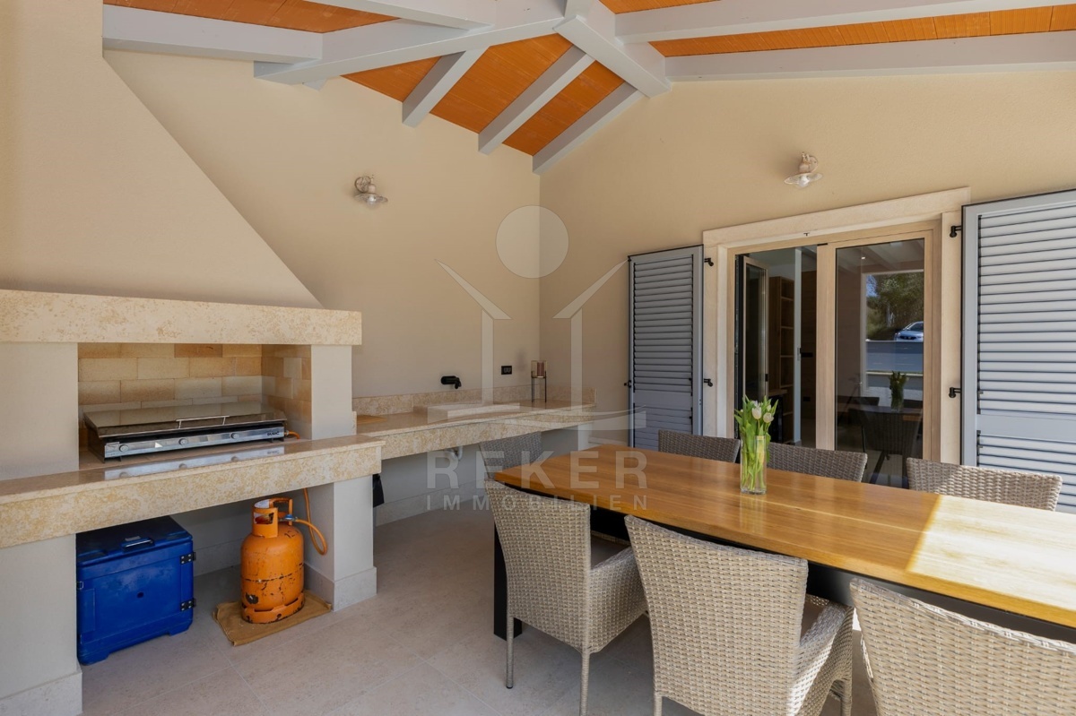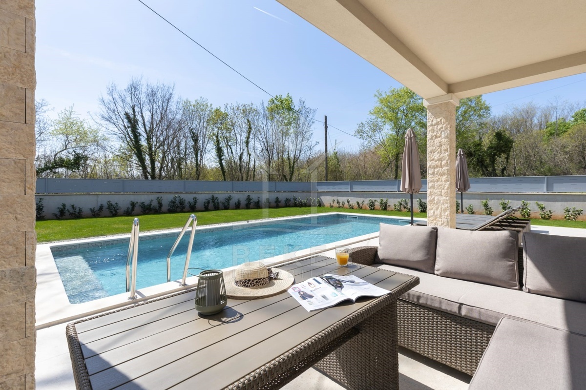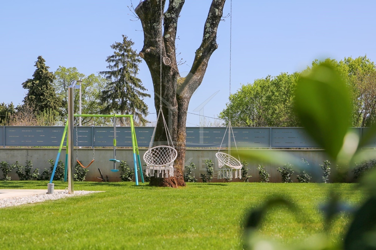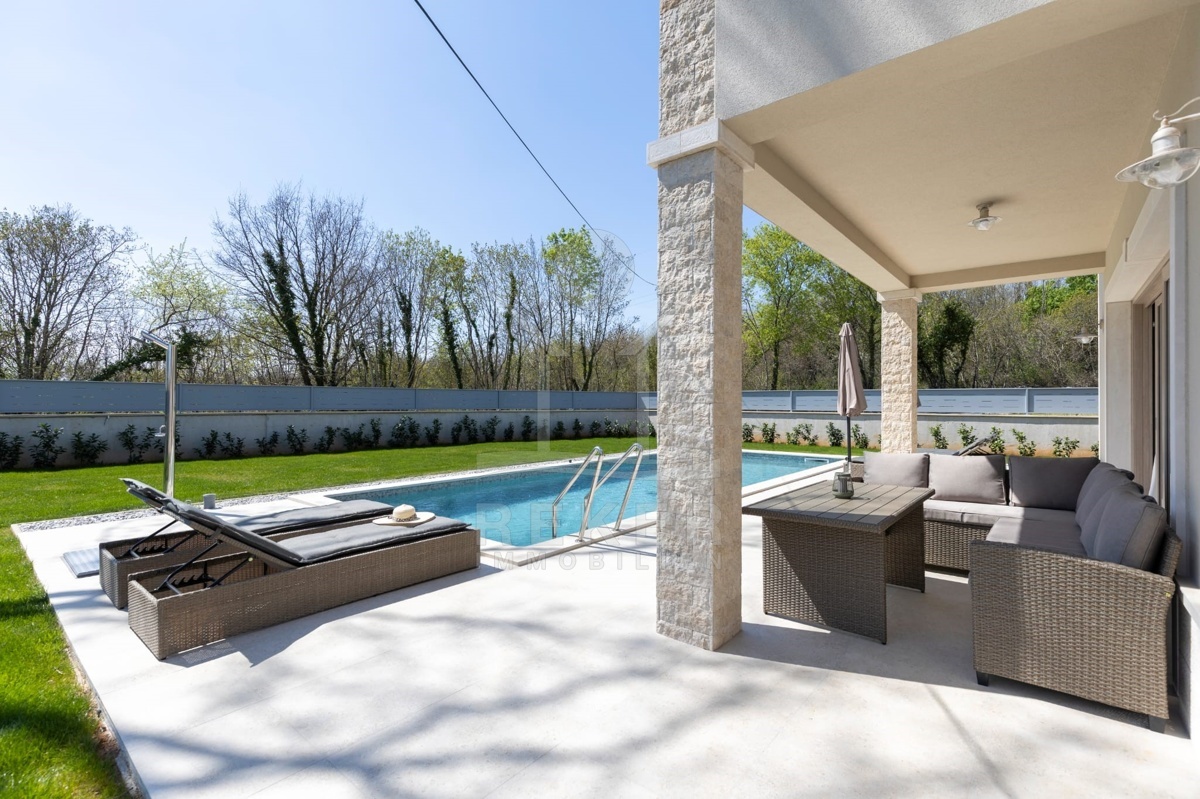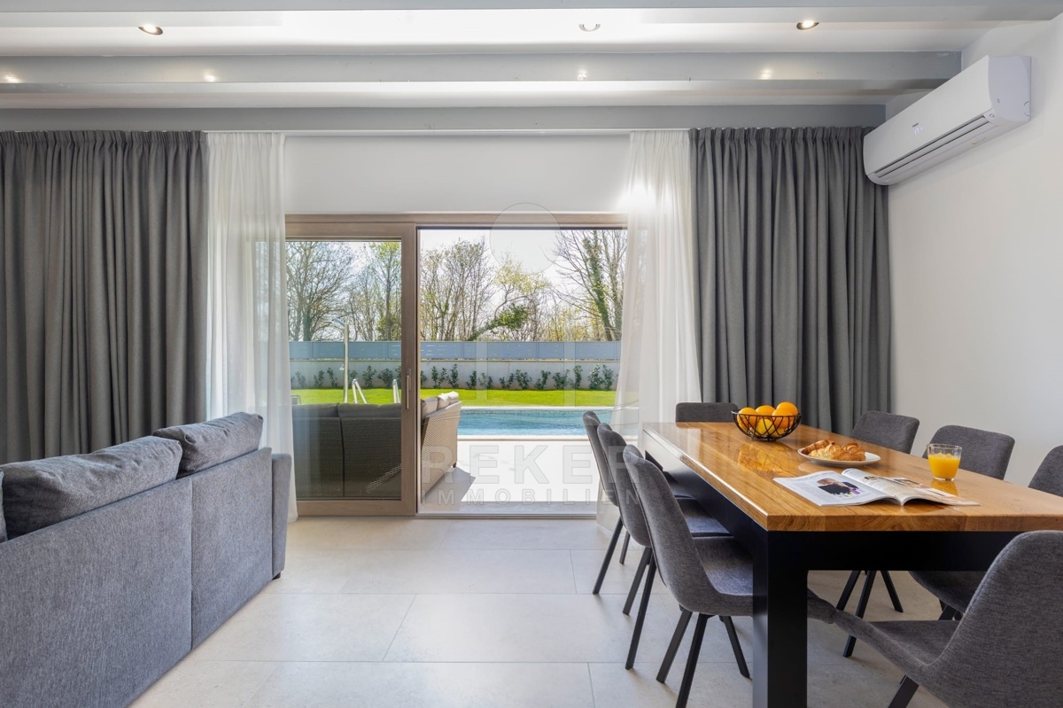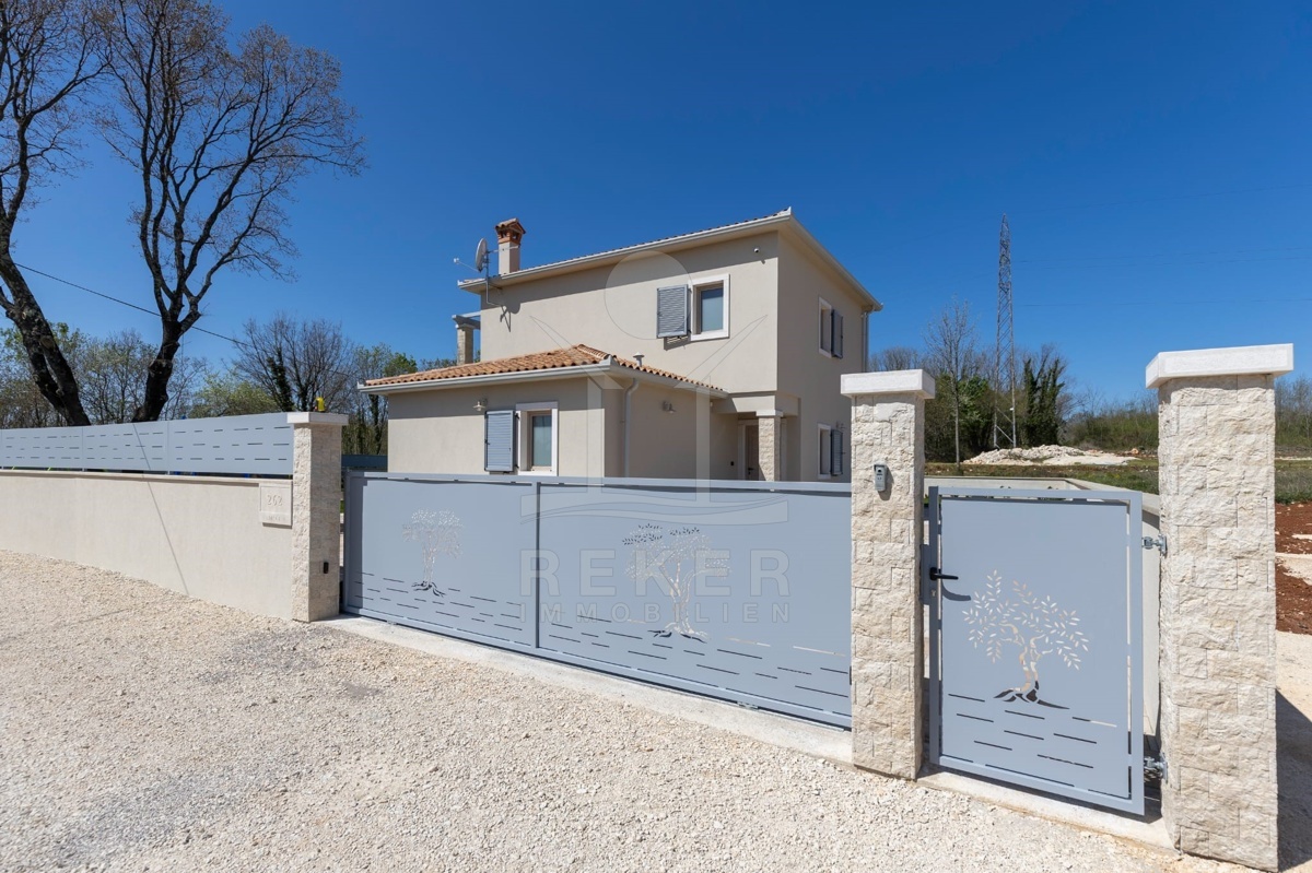 Dieses moderne Haus liegt am grünen Dorfrand von Labin. Ruhig, freundlich, naturnah. Der Garten grenzt direkt an eine bewaldete Fläche. Ideal, wenn Sie Ruhe suchen oder Platz zum Spielen für Kinder brauchen. Einkaufsmöglichkeiten, Schule und Supermarkt erreichen Sie schnell – und das Meer ist keine 10 Minuten mit dem Auto entfernt.
