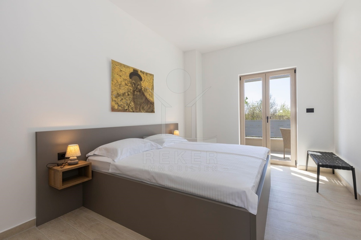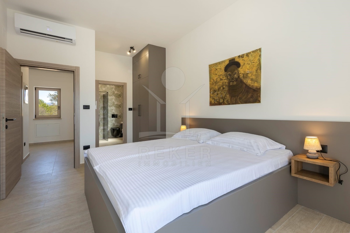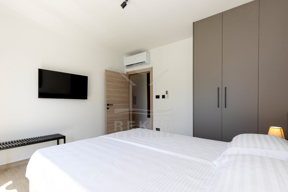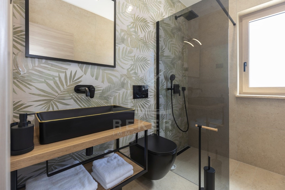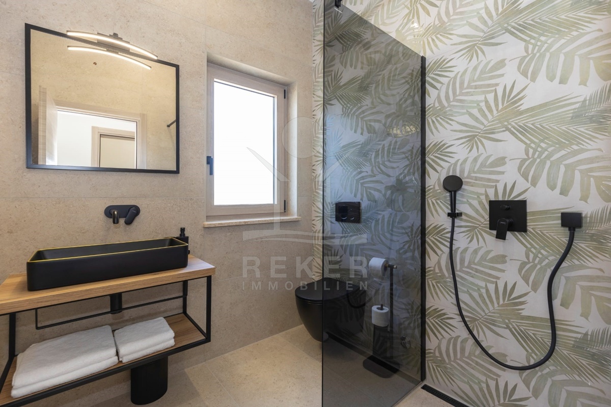 Im Erdgeschoss liegt außerdem ein Schlafzimmer – praktisch für Gäste oder ältere Familienmitglieder – sowie ein stilvolles Bad mit Walk-in-Dusche. Im Obergeschoss warten zwei Schlafzimmer mit Hotelcharakter: großzügig geschnitten, jeweils mit eigenem Bad, moderner Ausstattung und Balkonzugang mit Pergola. Das Design ist durchgängig modern, ruhig, funktional. Schwarze Armaturen, gemusterte Fliesen, Massivholz, Glas – alles wirkt hochwertig, aber nicht überladen. Dank Fußbodenheizung und Klimaanlage genießen Sie das ganze Jahr über angenehme Temperaturen.