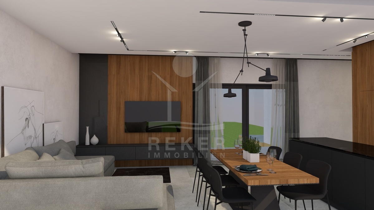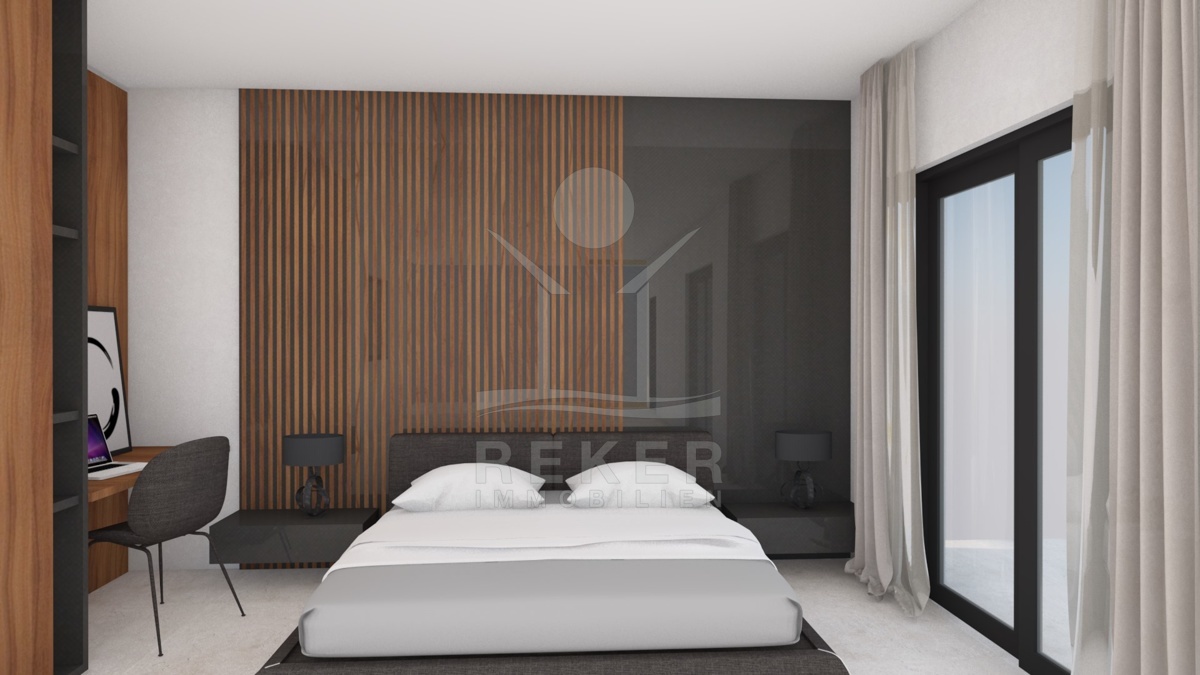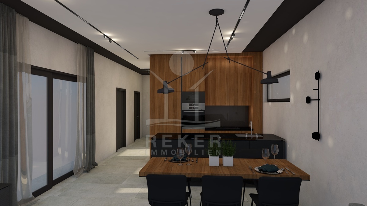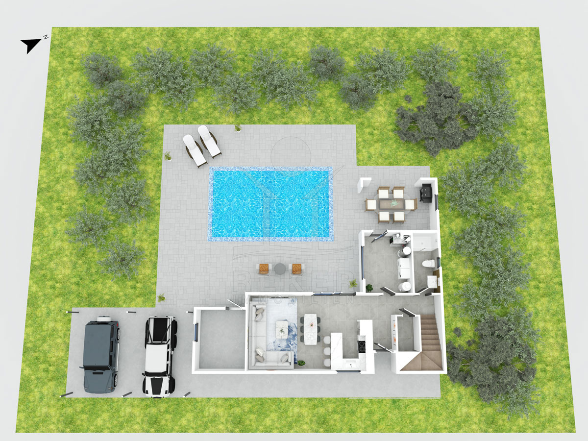 Das Erdgeschoss umfasst einen einladenden Eingangsbereich, einen geräumigen Flur, ein offenes Wohn-, Ess- und Küchenareal, ein Badezimmer, einen Wäscheraum sowie einen Technikraum. Der Zugang zur Terrasse und zum Poolbereich ist gewährleistet, ideal für Unterhaltung und Entspannung im Freien auf einer Gesamtfläche von 65 m².