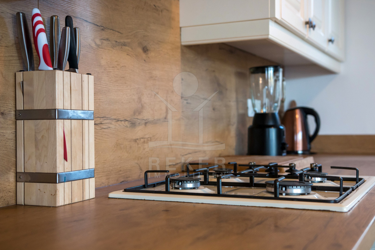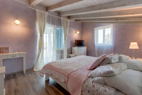 Die Hauptvilla umfasst 168 m² Wohnfläche. Zwei geräumige Schlafzimmer mit Doppelbetten bieten Platz für Familie oder Gäste. Das Wohnzimmer mit Kamin öffnet sich direkt zur Terrasse. So entsteht ein fließender Übergang nach draußen. Die voll ausgestattete Küche mit Essbereich bildet den Mittelpunkt des Hauses. Zwei Badezimmer, eines mit Badewanne und eines mit Dusche, sorgen für Komfort im Alltag.
