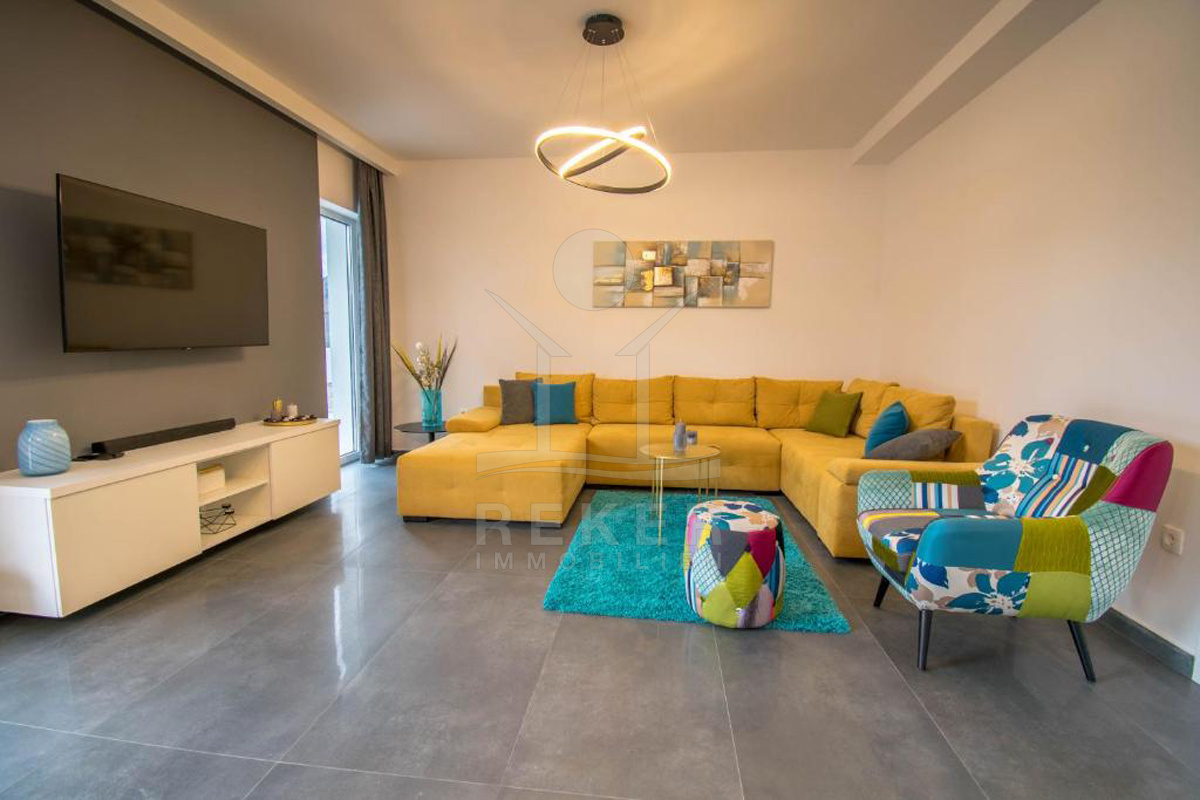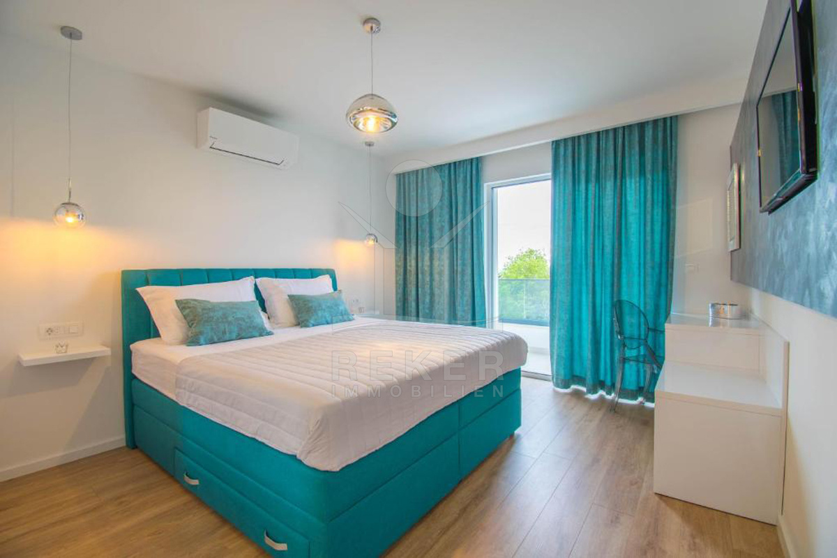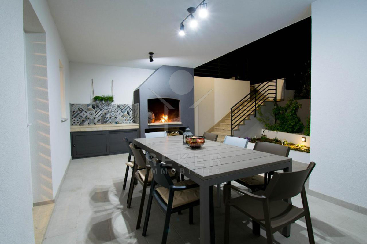 Drinnen ist alles da, was zählt. Im Erdgeschoss: ein offener, lichtdurchfluteter Wohnbereich mit Küche und Essplatz, dazu ein Gäste-WC. Im Obergeschoss: drei Schlafzimmer, jedes mit eigenem Bad und Balkon – das schafft Komfort und Rückzugsmöglichkeiten. Oben auf der Dachterrasse wartet der Whirlpool mit freiem Blick aufs Meer. Die Villa ist voll möbliert, klimatisiert, neuwertig und bezugsfertig. Einfach ankommen und losleben. Oder vermieten – die Ausstattung passt perfekt für Gäste mit Anspruch.