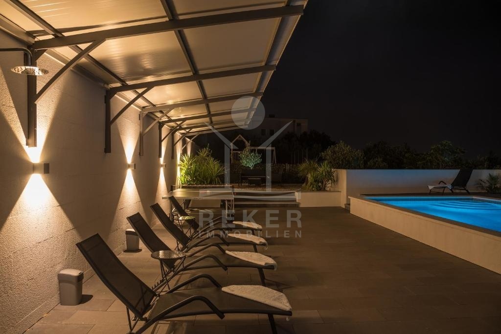 Der Außenbereich dieser Villa ist eine wahre Oase der Entspannung und des Vergnügens. Der große Hinterhof bietet einen beheizten Salzwasserpool mit den Maßen 8 x 4 Meter, der ohne Chlor auskommt und somit besonders hautfreundlich ist. Ein wunderschön angelegter Garten mit einem Kinderspielplatz schafft eine ideale Umgebung für Familien. Der Loungebereich und der moderne Grill sorgen für ultimatives Grillvergnügen, während der Essbereich im Freien perfekt für gesellige Abende mit Freunden und Familie ist. Diese Villa ist ein Traumhaus für alle, die luxuriösen Wohnkomfort im Freien suchen.