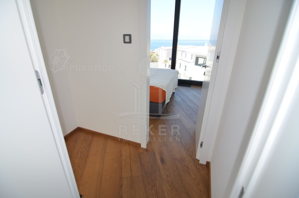 Die Villa bietet 180 m² Wohnfläche, verteilt auf drei Ebenen. Im Erdgeschoss erwarten Sie ein helles Wohnzimmer, eine offene Küche mit Essbereich, ein Schlafzimmer, Bad, Abstellraum und die Hauptterrasse. In der ersten Etage gibt es einen weiteren Wohn- und Essbereich, eine Küche, Gäste-WC und eine Terrasse mit Blick über die Bucht. Der zweite Stock beherbergt zwei Schlafzimmer, zwei moderne Bäder, einen Flur und eine Terrasse mit Aussicht aufs Meer.