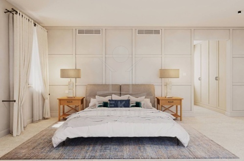 Der erste Stock präsentiert eine Galerie mit Blick auf das Wohnzimmer, die das Raumgefühl vergrößert. Ein Hauptschlafzimmer mit eigenem Badezimmer und begehbarem Kleiderschrank bietet eine elegante und großzügige Wohnatmosphäre.