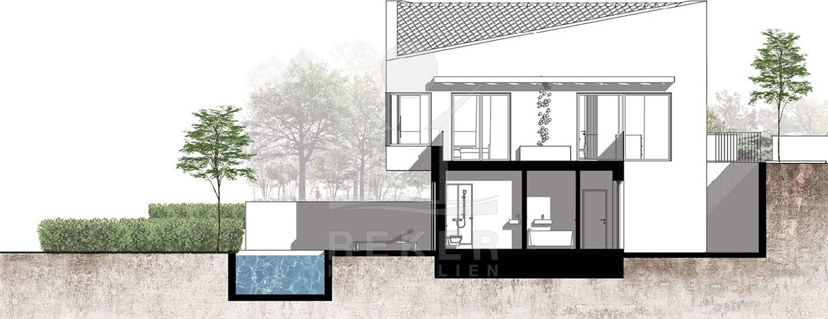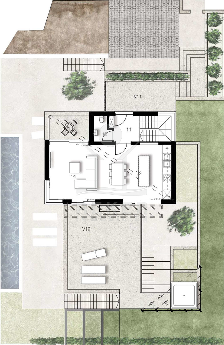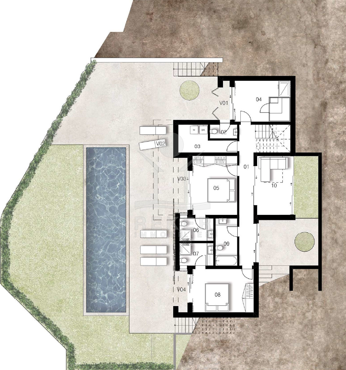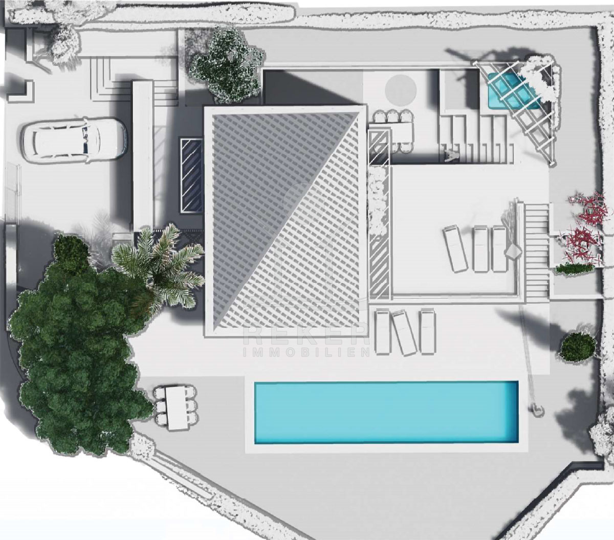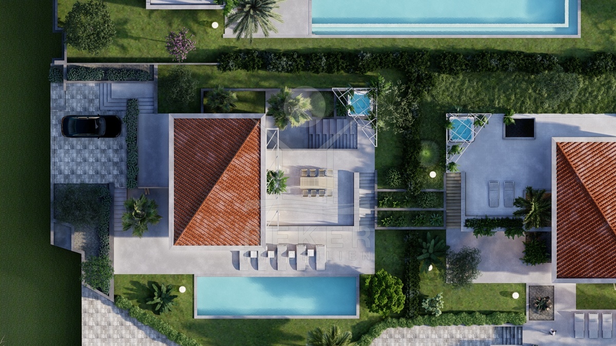 Der Pool liegt direkt an der Terrasse – keine Wege, kein Zaun, einfach Tür auf und rein. Drumherum über 150 Quadratmeter Außenfläche, dazu ein über 60 Quadratmeter großer Balkon im Obergeschoss. Dort oben ist auch der offene Wohnbereich mit Küche – hell, luftig, viel Raumgefühl. Das ist der Ort zum Zusammensein, Essen, Leben. Und an heißen Tagen: einfach raustreten, abkühlen, genießen. Auch technisch ist alles auf Komfort getrimmt: Videoüberwachung, Alarm, Klimaanlage.
