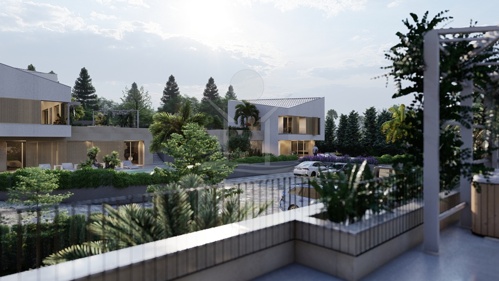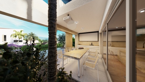Innen überzeugt die Aufteilung. Im Erdgeschoss: offener Wohnraum mit direktem Zugang zur Terrasse, Küche mit Speisekammer, ein Schlafzimmer mit privatem Außenbereich und ein separates Bad. Oben: zwei Schlafzimmer, beide mit eigenem Bad, dazu eine praktische Waschküche und Zugang zum großen Balkon mit Jacuzzi. Alles hochwertig ausgestattet – 3-fach verglaste Fenster, Keramikboden, Klimaanlage, Videoüberwachung und Alarmanlage. Komfort, Raum und Privatsphäre – ideal für Familien und Gäste.