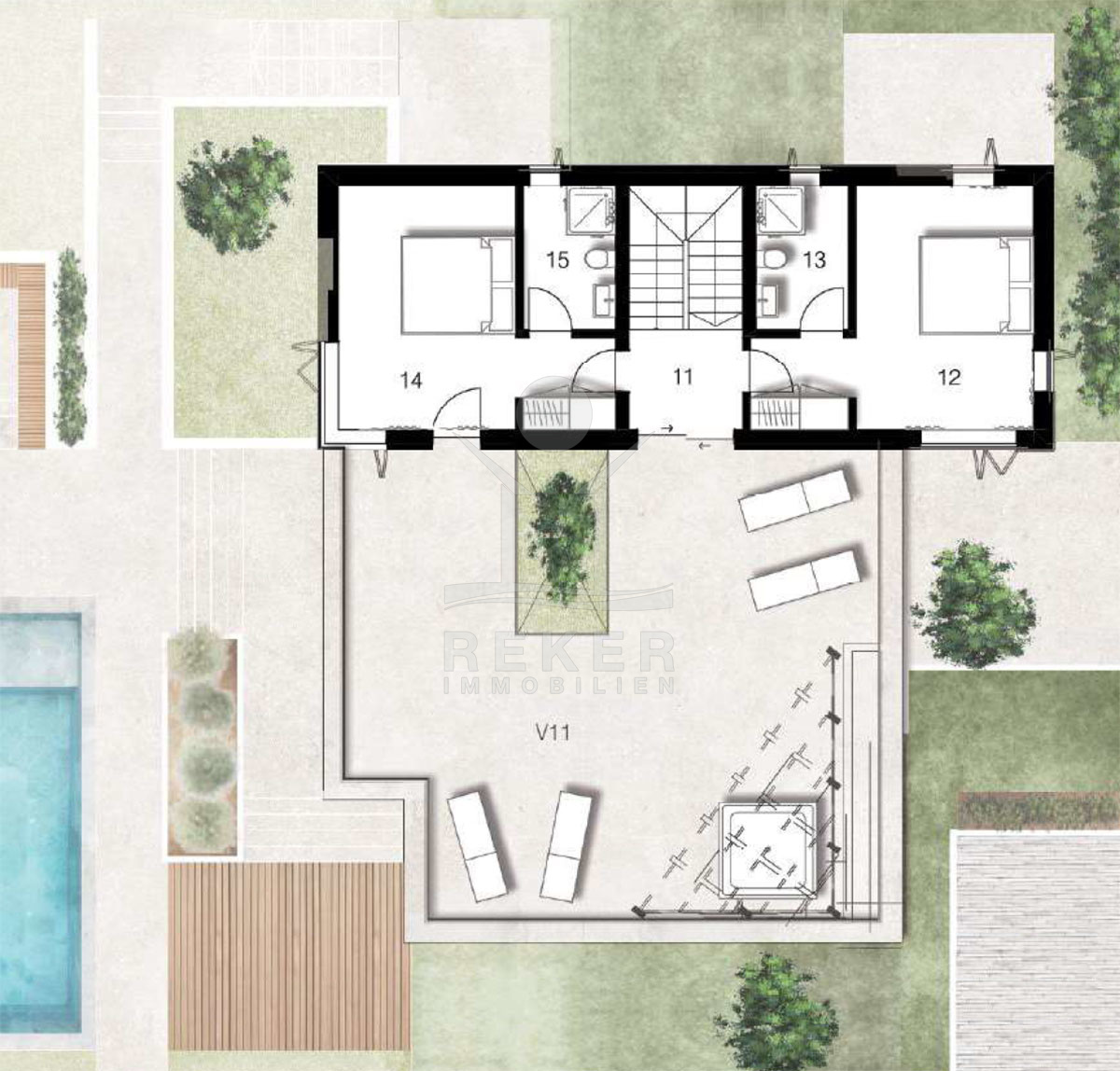 Auch innen ist viel Raum: Im Erdgeschoss ein offener Wohnbereich mit Blick Richtung Pool, ein Schlafzimmer, ein separates Bad und ein Master-Schlafzimmer mit eigenem Bad. Über die Innentreppe geht’s nach oben – dort warten zwei weitere Schlafzimmer, jedes mit privatem Bad, und ein riesiger Balkon mit Whirlpool. Im Keller: ein eigener Fitnessraum mit Badezimmer sowie ein Abstellraum. Klimaanlage, Alarmanlage, Videoüberwachung – alles ist vorhanden. Perfekt für große Familien oder zur gehobenen Ferienvermietung.