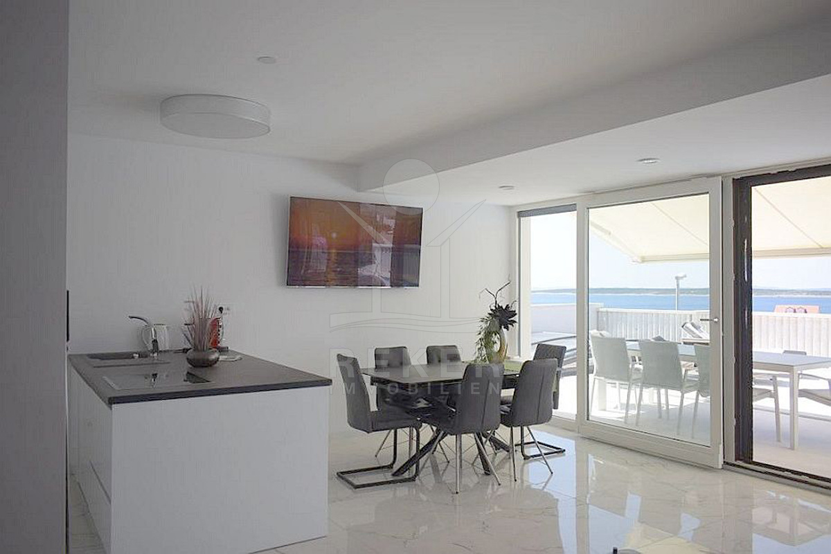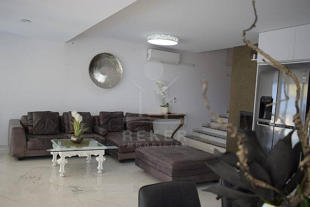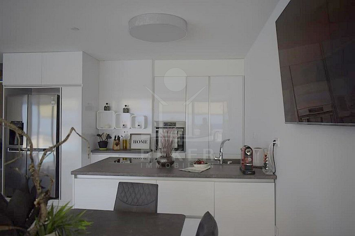Innen erwarten Sie rund 122 m² ebenerdige Wohnfläche mit durchdachter Aufteilung. Der zentrale Wohnraum verbindet Küche, Essplatz und Wohnzimmer – alles offen, lichtdurchflutet und mit direktem Zugang zur Terrasse. Die zwei Schlafzimmer bieten Platz für Familie oder Gäste. Zwei moderne Bäder sorgen für Komfort im Alltag. Die Ausstattung ist hochwertig, das Interieur stimmig eingerichtet, die Böden gefliest, die Räume klimatisiert. Alles wirkt aufgeräumt, klar, modern. Und der Meerblick? Immer da – durch die große Glasfront direkt vom Sofa aus.