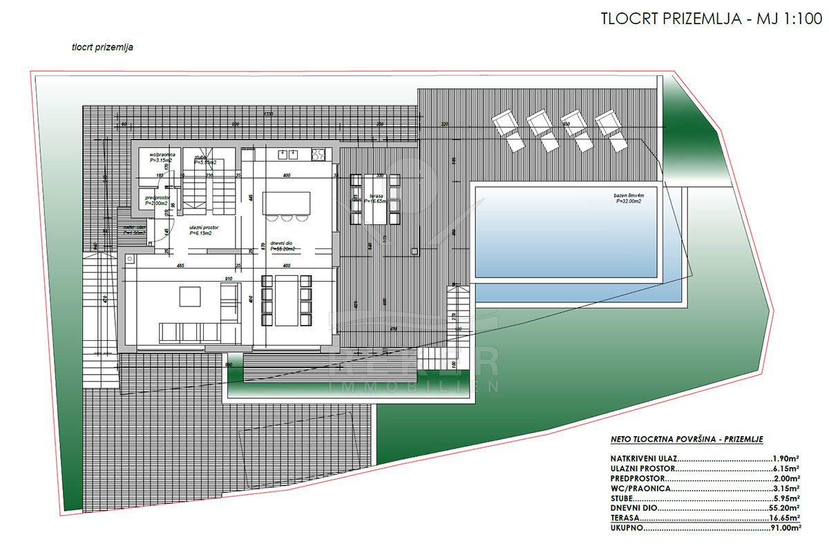 Die Außenanlage der Villa ist ein Paradies für Entspannung und Unterhaltung. Die sonnige Terrasse verfügt über einen beheizten Pool mit 32 m², eine erfrischende Außendusche und eine überdachte Terrasse (16,65 m²) mit atemberaubendem Meerblick. Dieser wundervolle Ort im Freien lädt dazu ein, die frische Luft zu genießen, sich zu sonnen oder gesellige Abende zu verbringen. Diese Villa bietet alles, was man sich für ein luxuriöses und entspanntes Leben wünschen kann