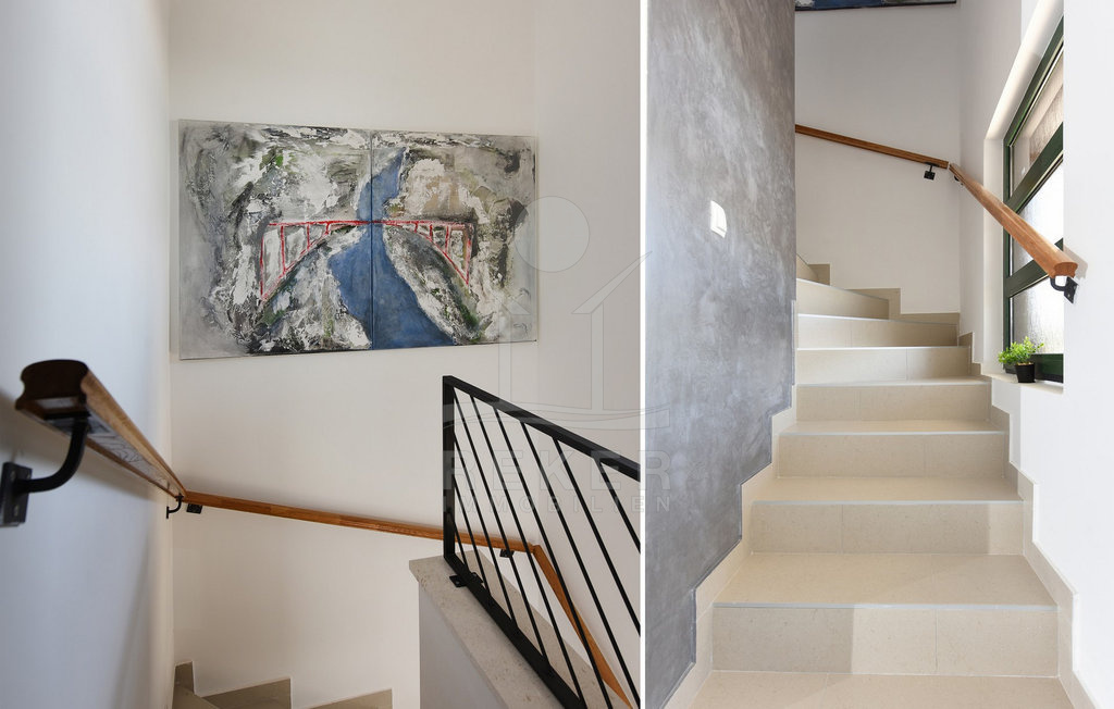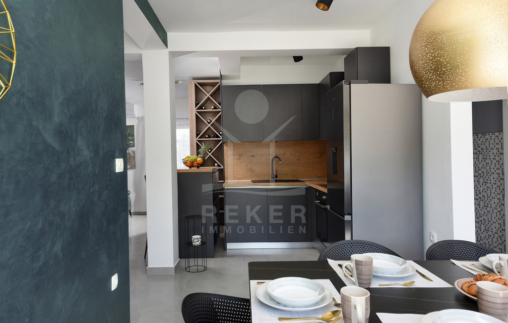 Im Haus selbst verteilen sich 143 m² Wohnfläche auf zwei Etagen. Das Erdgeschoss bietet einen hellen Wohnbereich mit großer Glasfront zur Terrasse, eine offene Küche mit Essplatz, eine praktische Büroecke sowie ein Gäste-WC. Im Obergeschoss warten drei klimatisierte Schlafzimmer, eines davon mit eigenem Bad, sowie ein zusätzliches Badezimmer. Vom Balkon aus reicht der Blick stellenweise bis zum Meer.