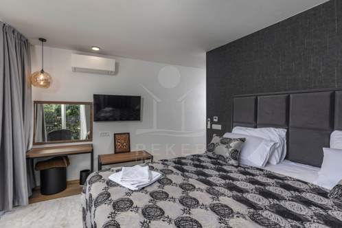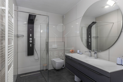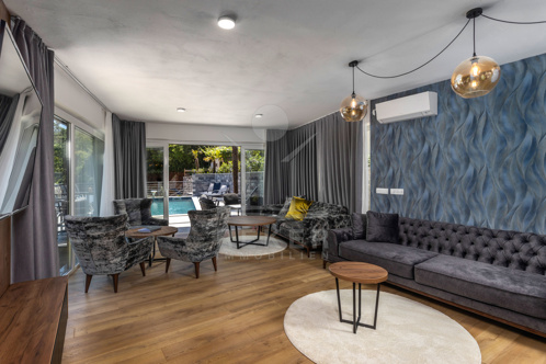 Die gesamte Luxus-Villa wird durch eine Wärmepumpe geheizt und gekühlt. Sie ist in zeitloser Eleganz mit Liebe zum Detail bezugsfertig möbliert. Empfangen werden Sie im Erdgeschoss mit einem Wohn-/Essbereich mit offener Küche, einem Schlafzimmer mit eigenem Bad und einem Gäste-WC.