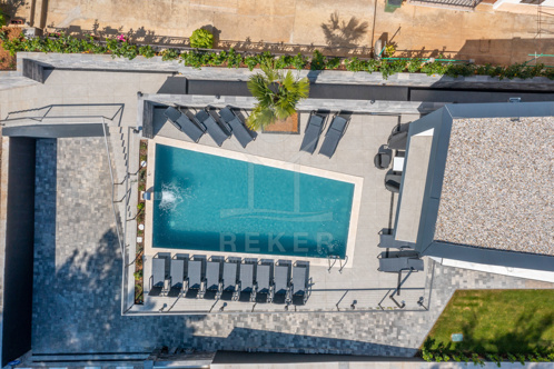 Ein unglaubliche 44 m² umfassender Pool bereichert den Außenbereich. Lassen Sie sich hierneben von der Sonne verwöhnen und genießen Sie den überwältigenden Meerblick von der überdachten Terrasse aus.