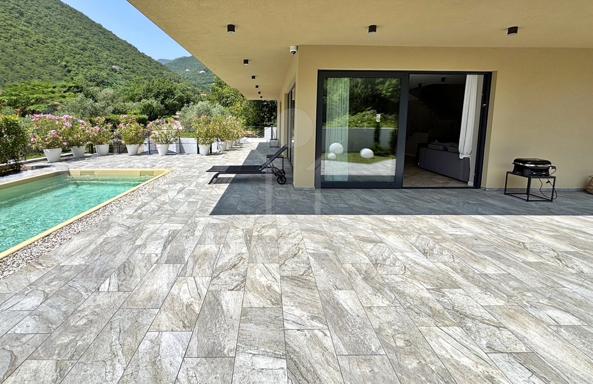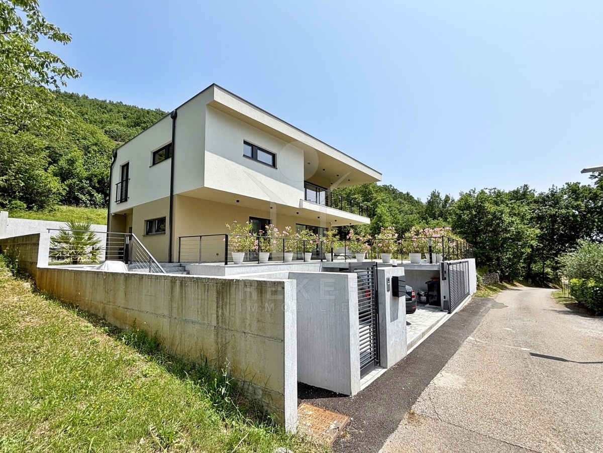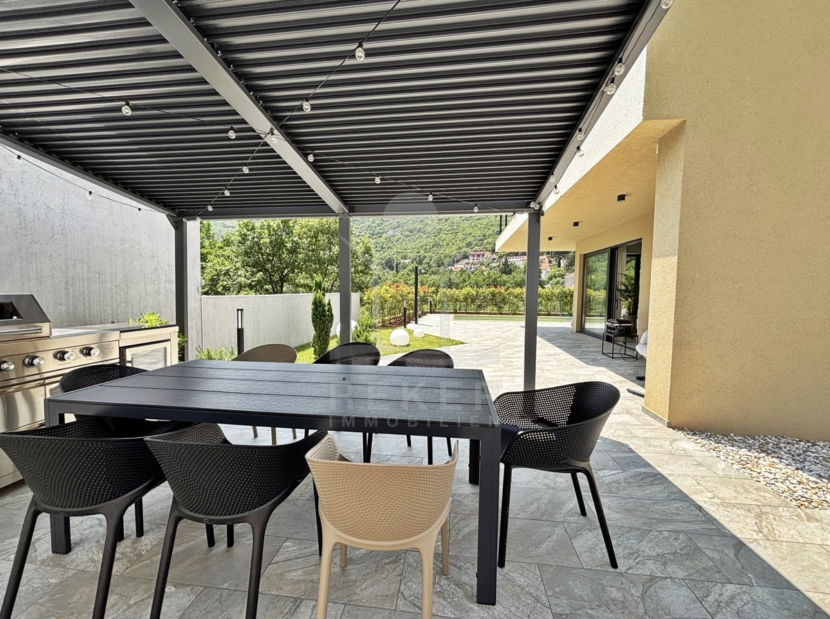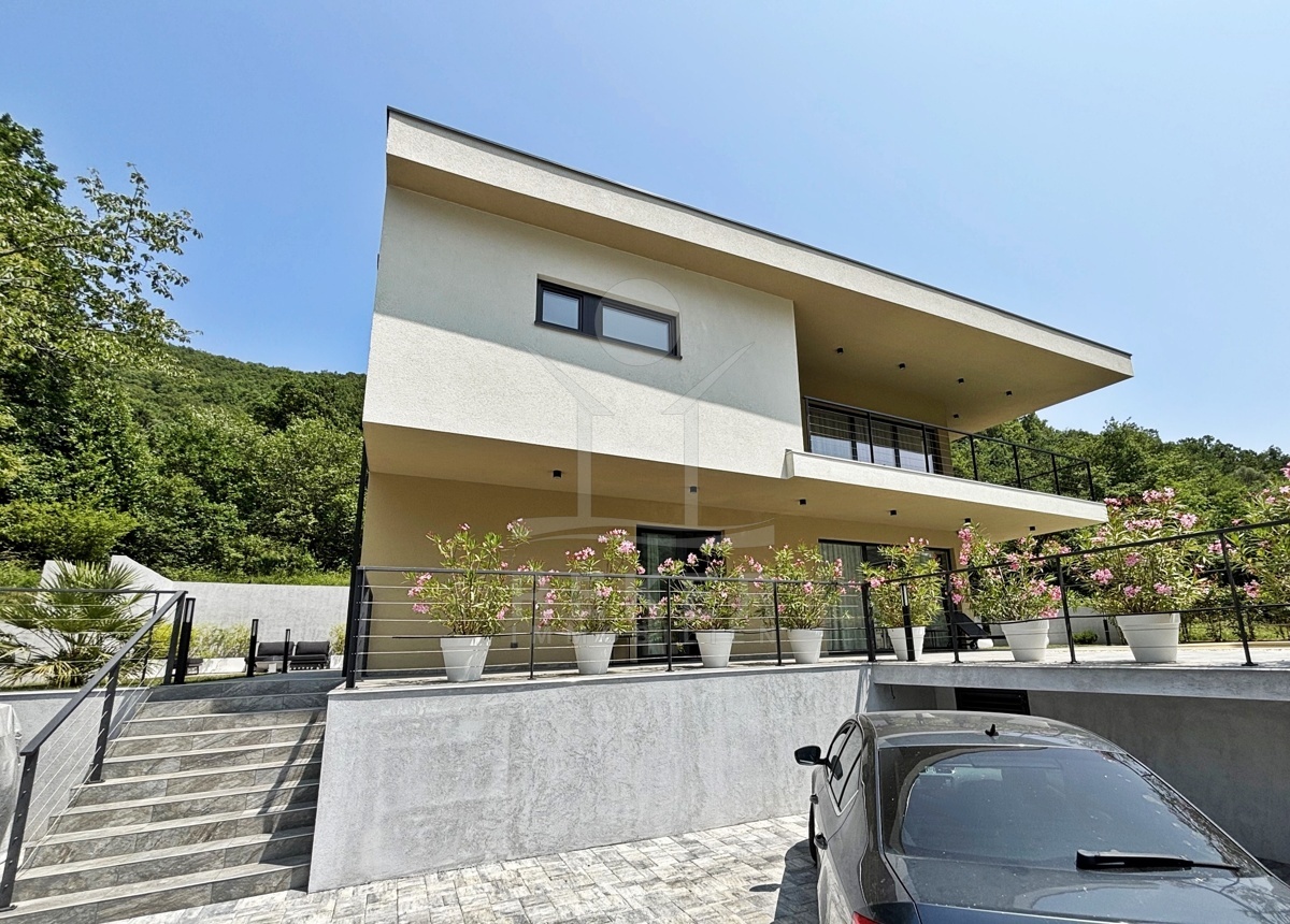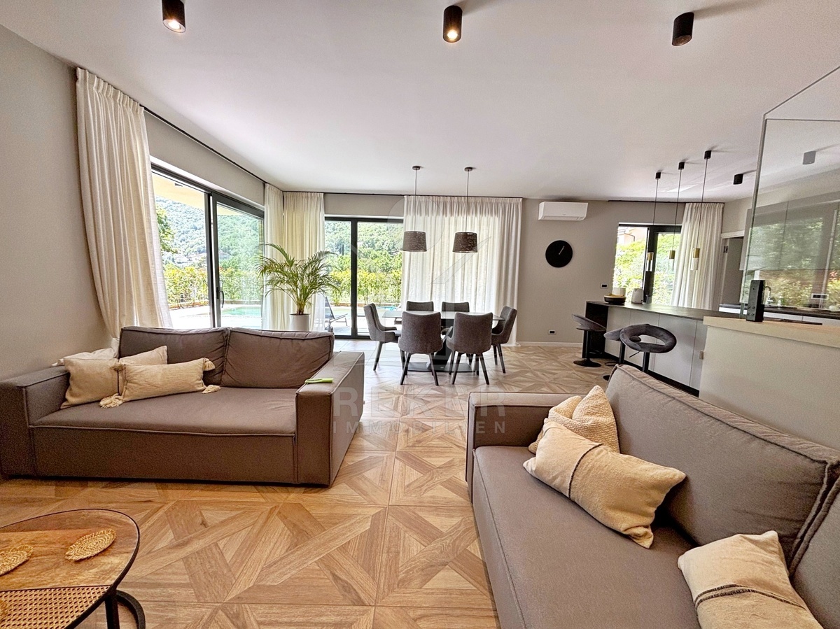 In einem ruhigen Teil von Mošćenička Draga, nur wenige Minuten oberhalb der Küste, liegt diese moderne Villa aus dem Jahr 2024. Umgeben von Wald und sattem Grün, wohnen Sie hier am Rande des Bergpanoramas … weit genug für absolute Ruhe, nah genug für alle Wege des Alltags. Die Südwest-Ausrichtung bringt ab dem Nachmittag Sonne auf Terrasse und Pool. Über die Zufahrtsstraße erreichen Sie den geschützten Innenhof mit elektrischer Schiebetür. Alles wirkt klar. Aufgeräumt. Hochwertig.
