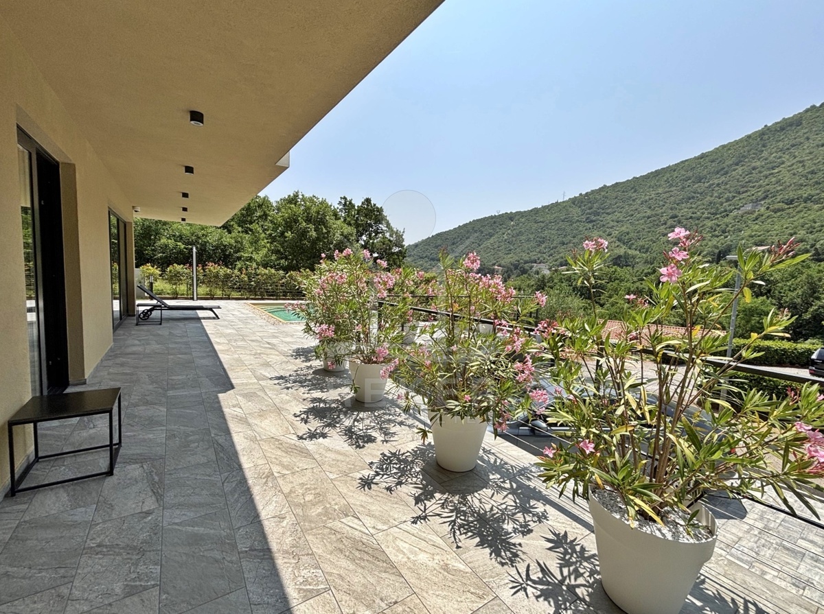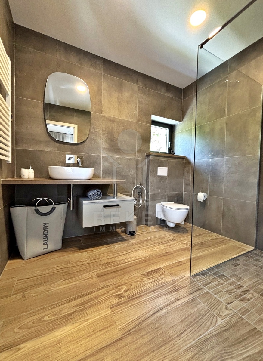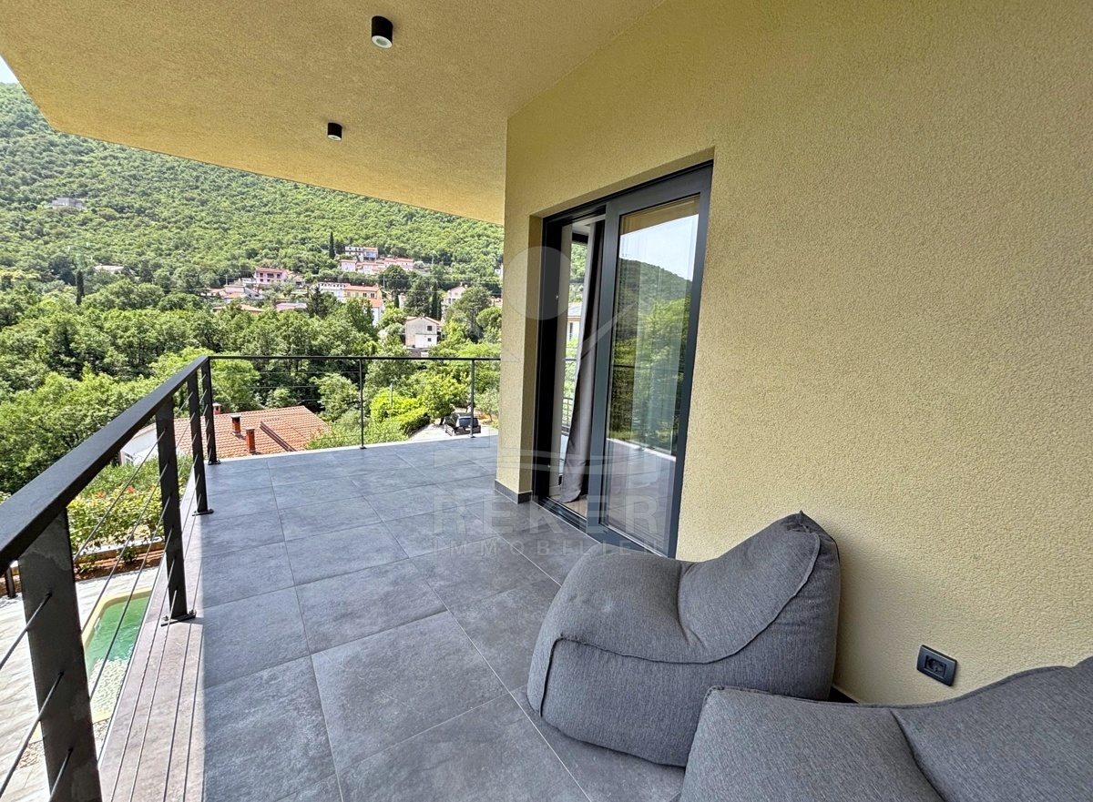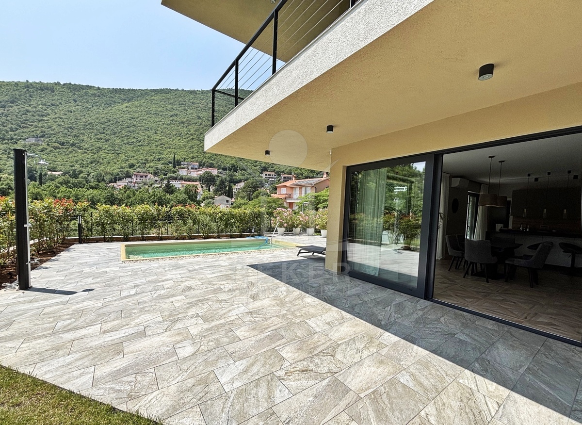 In einem ruhigen Teil von Mošćenička Draga, nur wenige Minuten oberhalb der Küste, liegt diese moderne Villa aus dem Jahr 2024. Umgeben von Wald und sattem Grün, wohnen Sie hier am Rande des Bergpanoramas … weit genug für absolute Ruhe, nah genug für alle Wege des Alltags. Die Südwest-Ausrichtung bringt ab dem Nachmittag Sonne auf Terrasse und Pool. Über die Zufahrtsstraße erreichen Sie den geschützten Innenhof mit elektrischer Schiebetür. Alles wirkt klar. Aufgeräumt. Hochwertig.