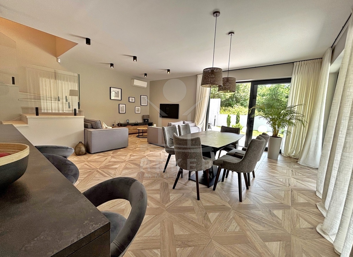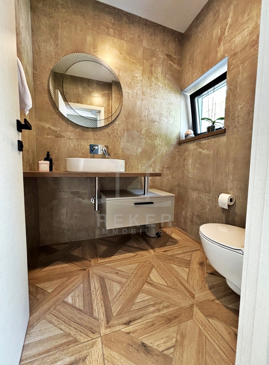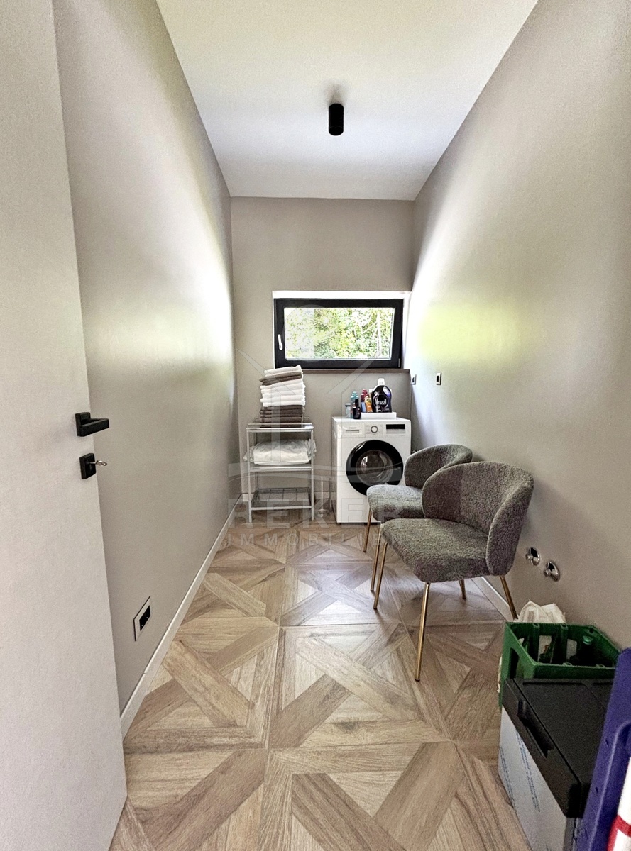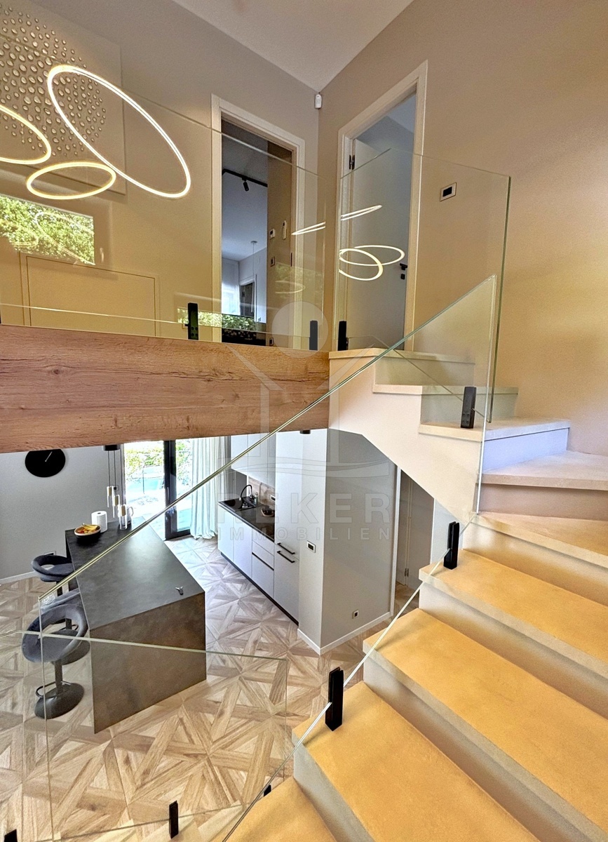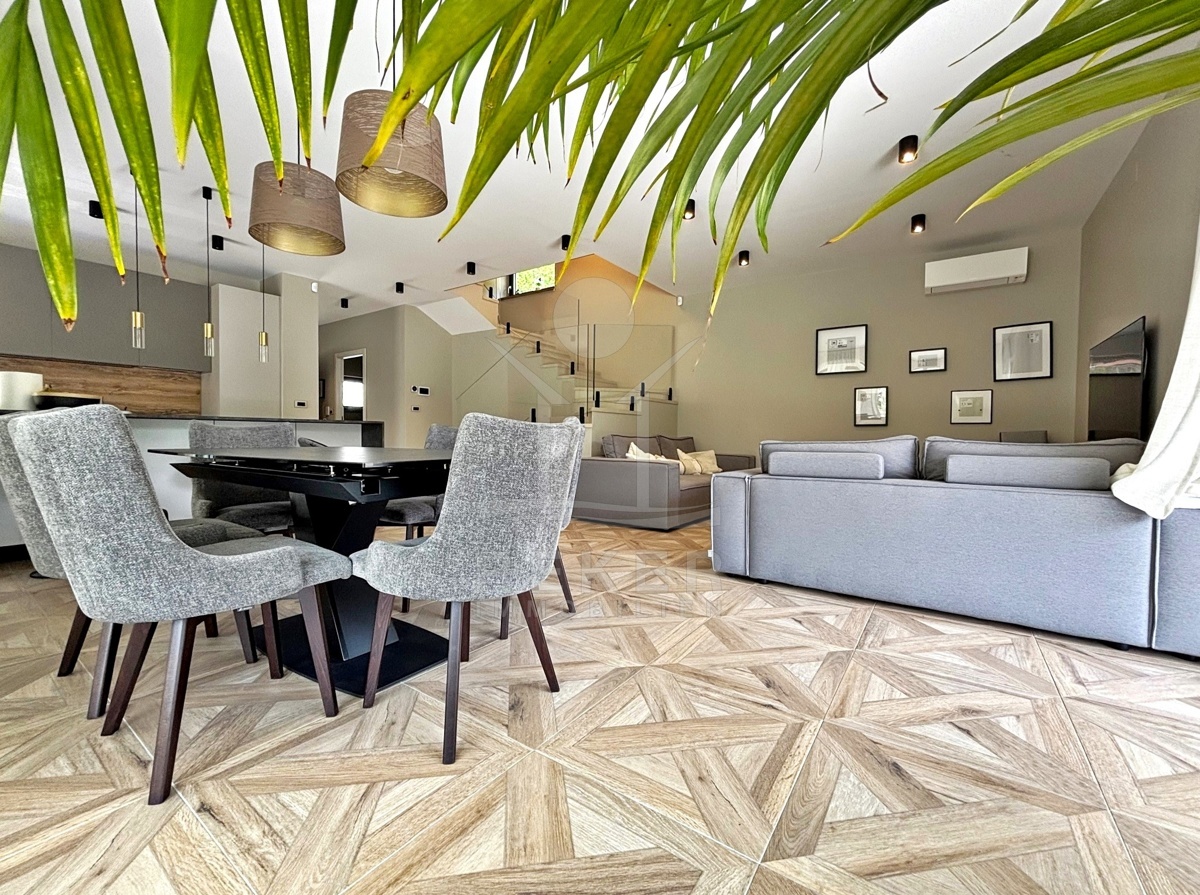In einem ruhigen Teil von Mošćenička Draga, nur wenige Minuten oberhalb der Küste, liegt diese moderne Villa aus dem Jahr 2024. Umgeben von Wald und sattem Grün, wohnen Sie hier am Rande des Bergpanoramas … weit genug für absolute Ruhe, nah genug für alle Wege des Alltags. Die Südwest-Ausrichtung bringt ab dem Nachmittag Sonne auf Terrasse und Pool. Über die Zufahrtsstraße erreichen Sie den geschützten Innenhof mit elektrischer Schiebetür. Alles wirkt klar. Aufgeräumt. Hochwertig.