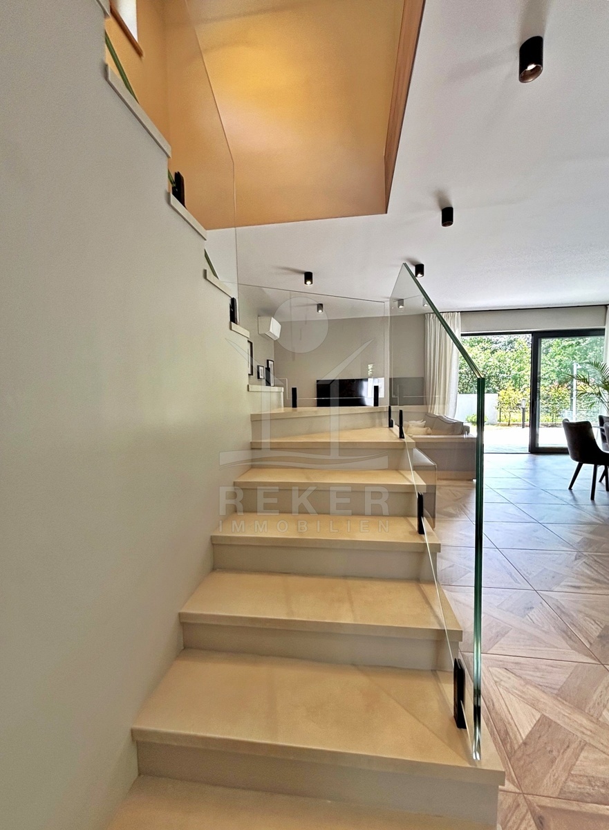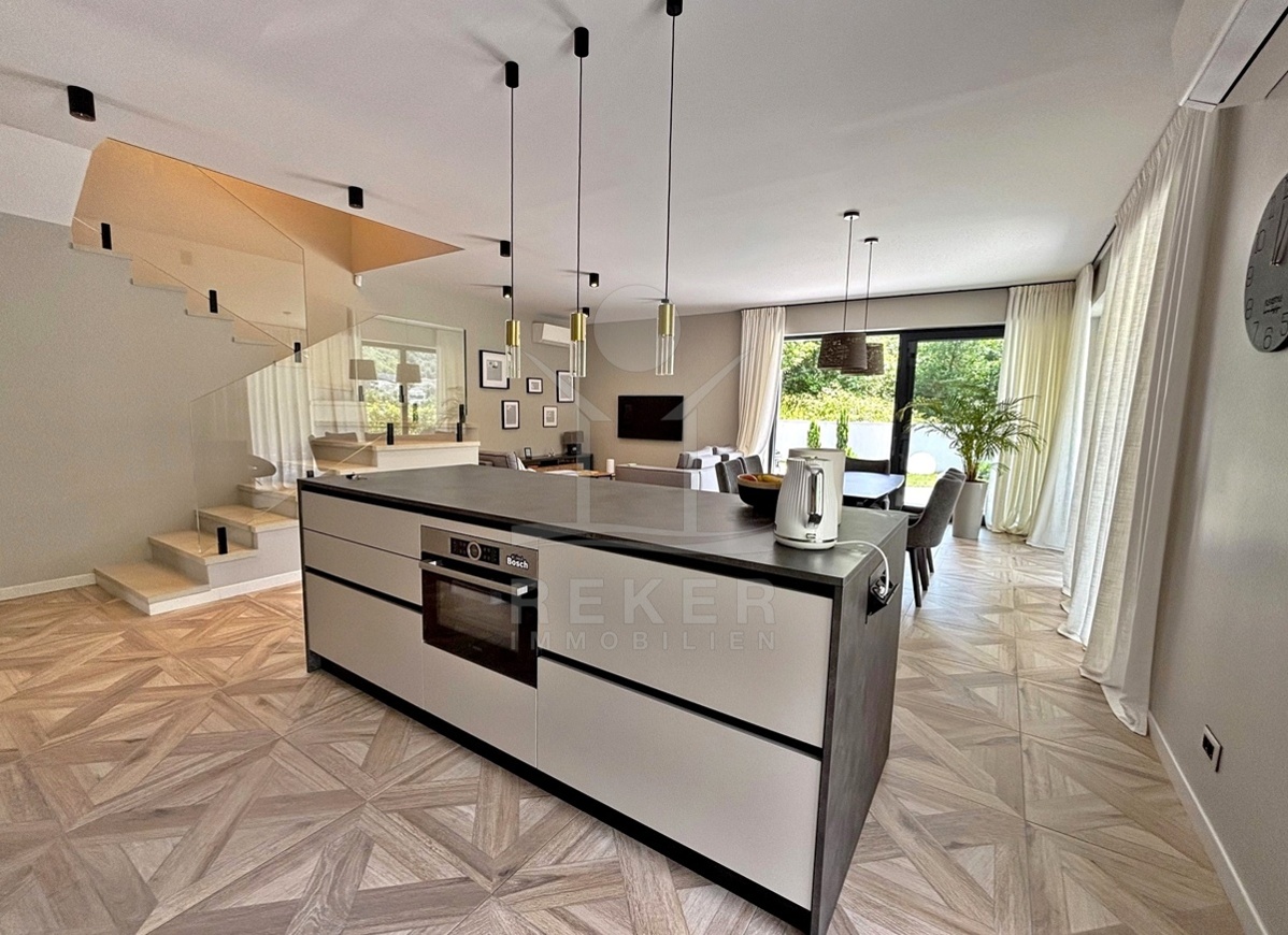 Im Inneren setzt sich der hochwertige Eindruck fort. Im Erdgeschoss verbindet sich der offene Wohn-, Ess- und Kochbereich direkt mit dem Garten. Durch bodentiefe Schiebetüren fließt der Innenraum optisch nach draußen. Die Küche ist funktional und zurückhaltend modern. Ebenfalls auf dieser Ebene: eine Gästetoilette, ein Heizraum und die Waschküche. Oben erwarten Sie vier großzügige Schlafzimmer mit eigenem Bad … zwei haben Zugang zum breiten Balkon mit Blick ins Grüne. Die Ausstattung überzeugt. Klimaanlage in jedem Raum, Fußbodenheizung in den Bädern, viel Licht und klare Linien.