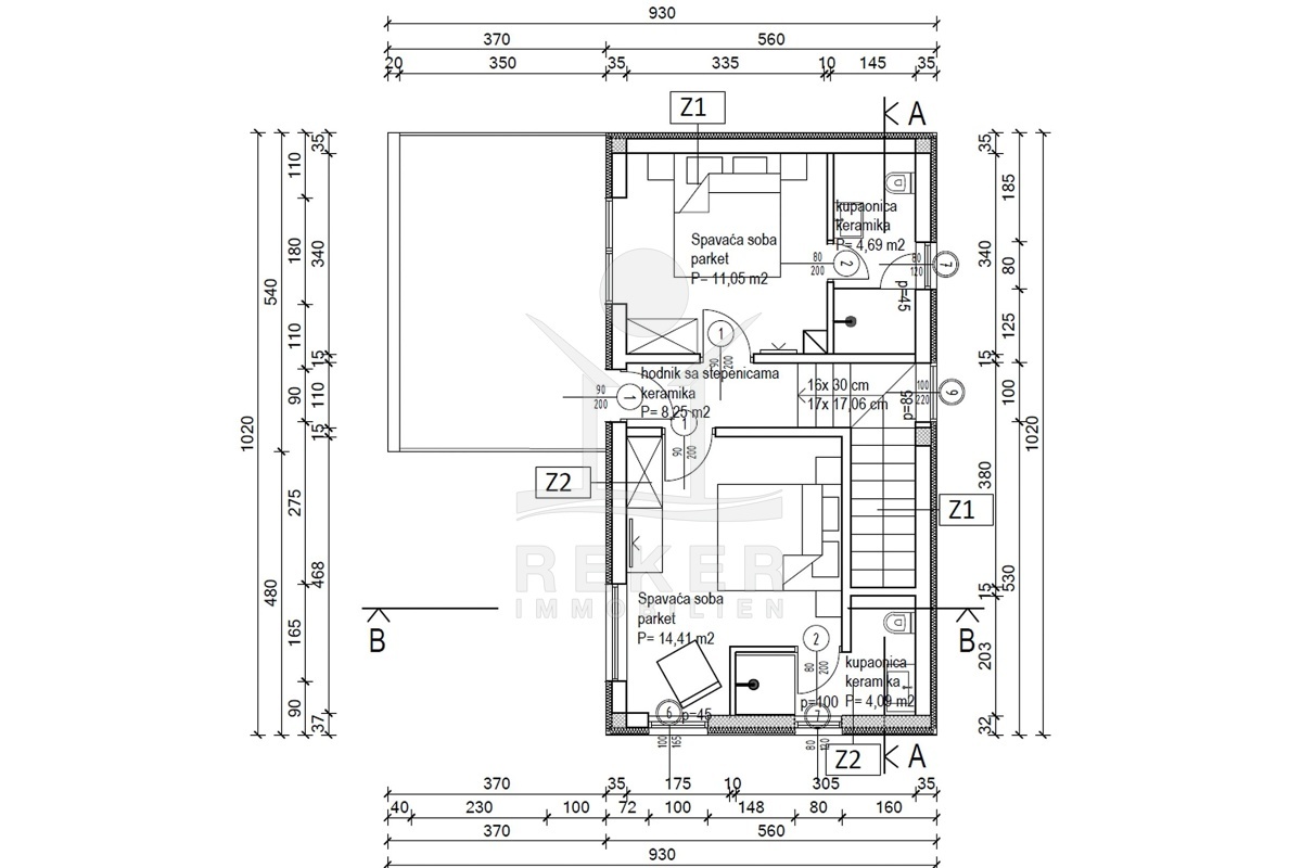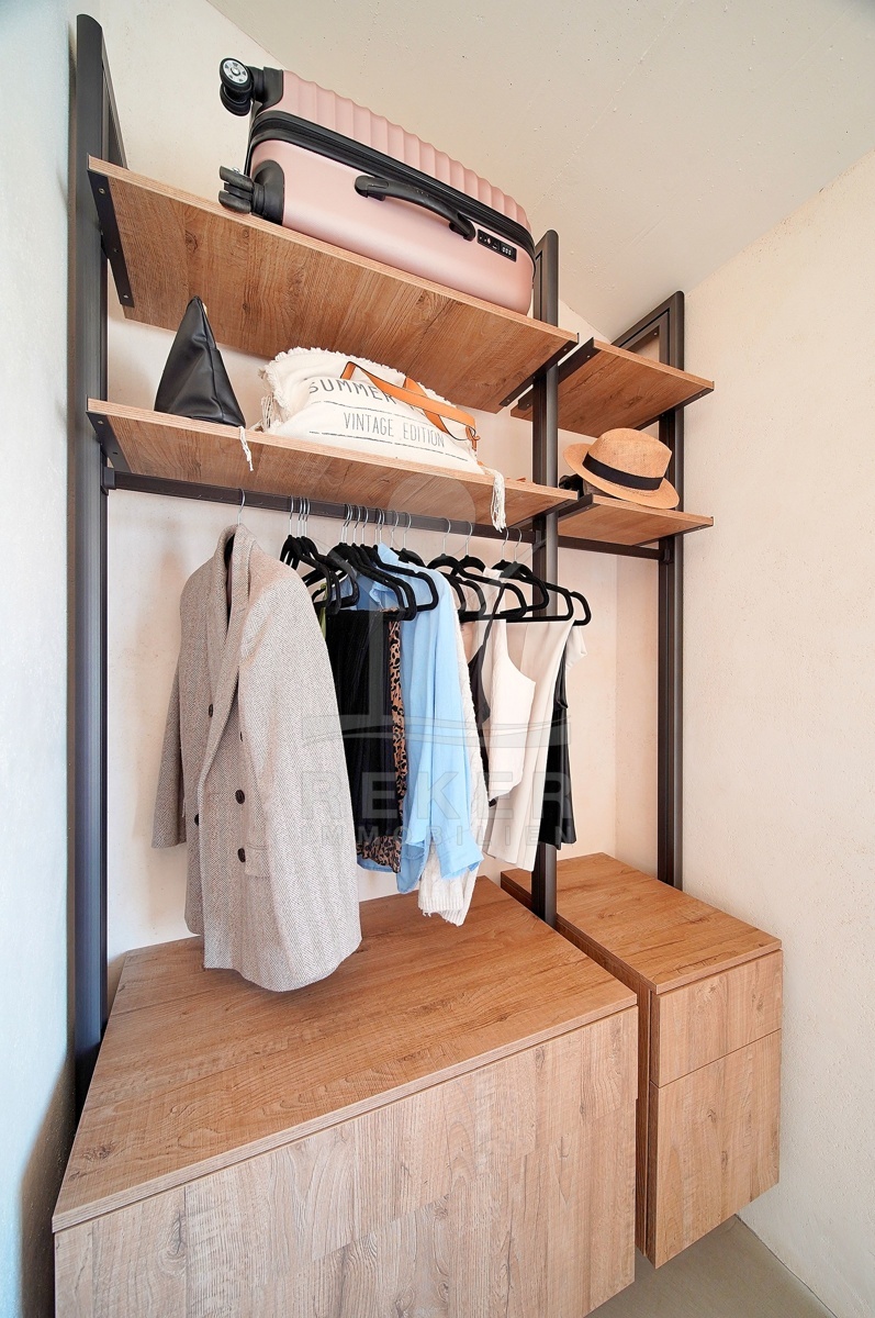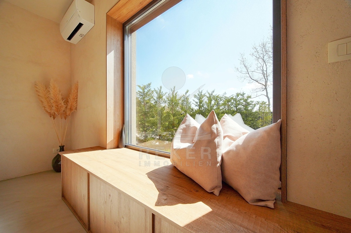 Der interne Treppenaufgang führt Sie in den 1. Stock mit zwei Schlafzimmern, jeweils mit eigenem Badezimmer und Garderobe. Ein Balkon (16,77 m²) mit Panoramablick über die schöne Umgebung rundet die 46,68 m² große Etage ab.