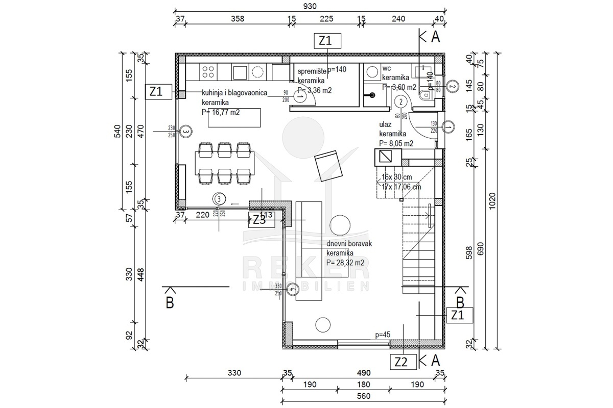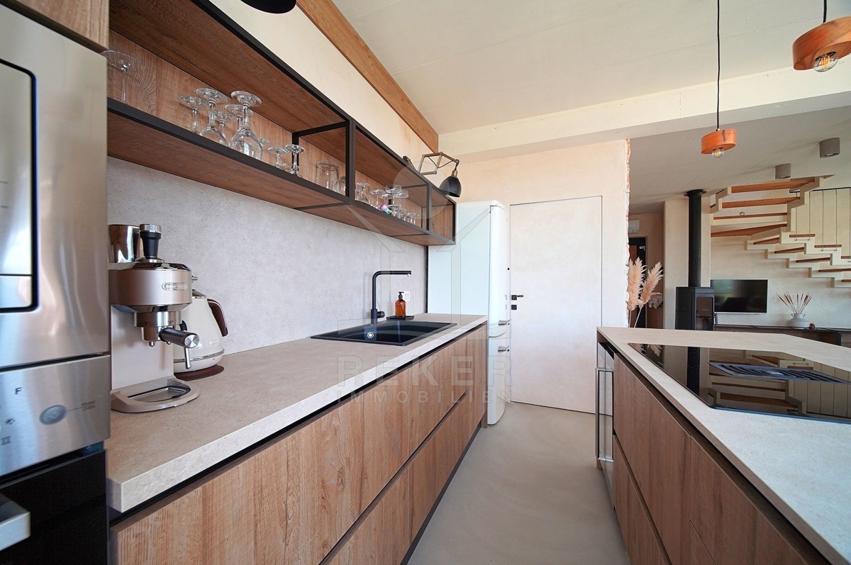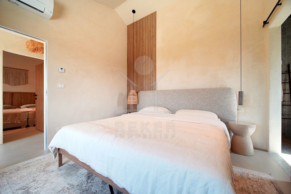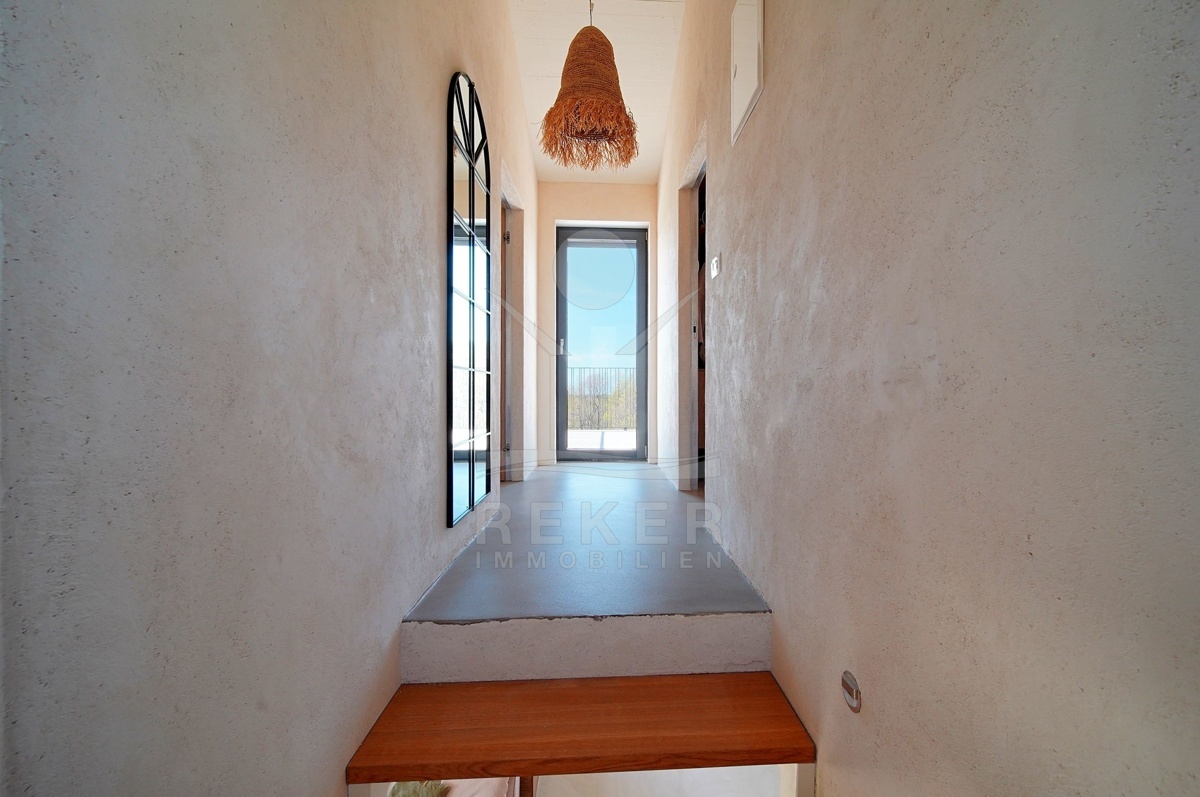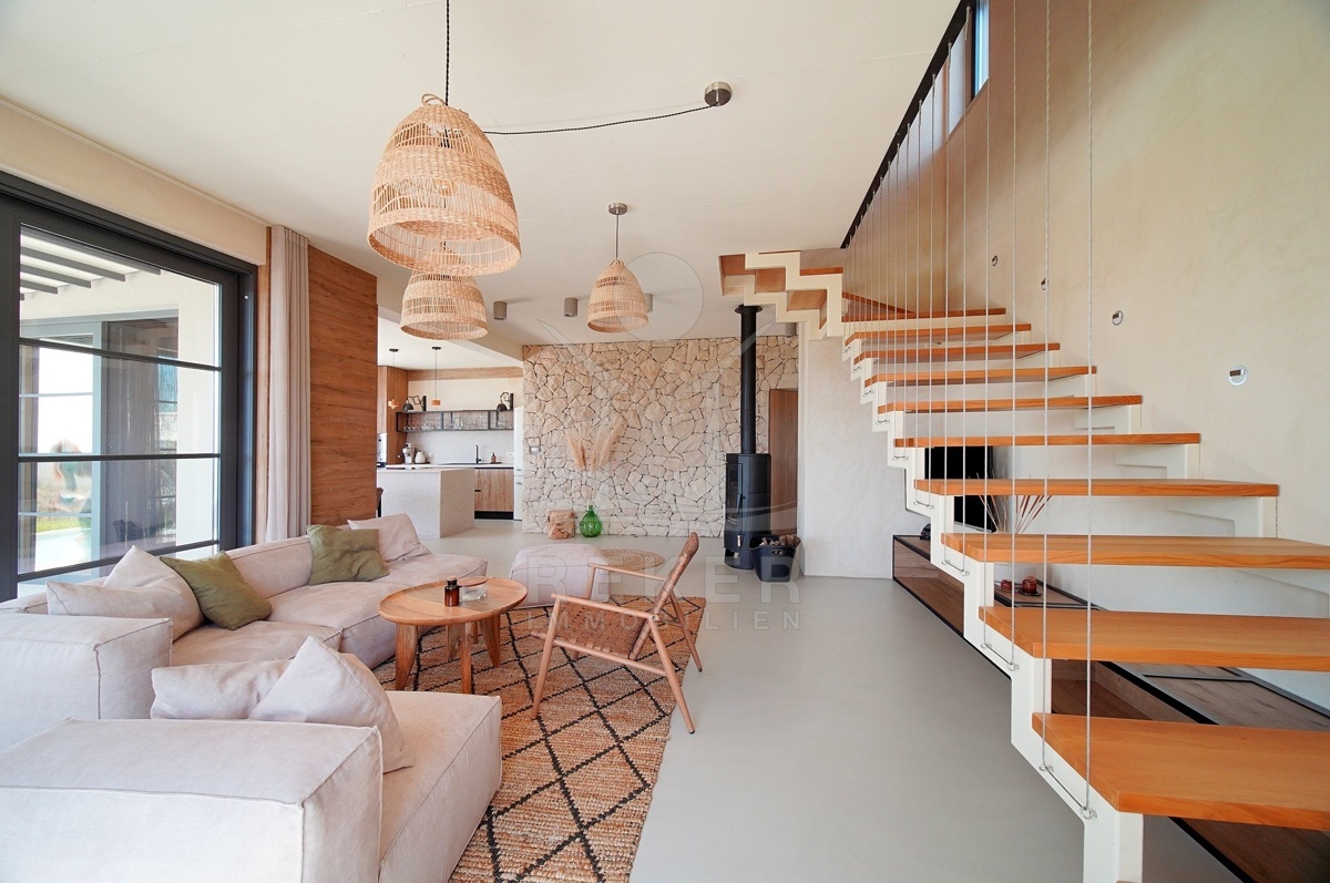 Die Villa bietet alle Möbel im Preis inbegriffen und besticht durch viel natürliches Licht sowie eine geschmackvolle Kombination aus erdigen Farbtönen an Böden und Wänden, die eine gemütliche Atmosphäre schaffen. Der Eingang zum Haus führt ins Erdgeschoss, wo sich ein Wohnzimmer, eine Küche mit Esszimmer, eine Speisekammer, eine überdachte Terrasse, ein WC und ein Flur auf großzügigen 59 m² erstrecken.