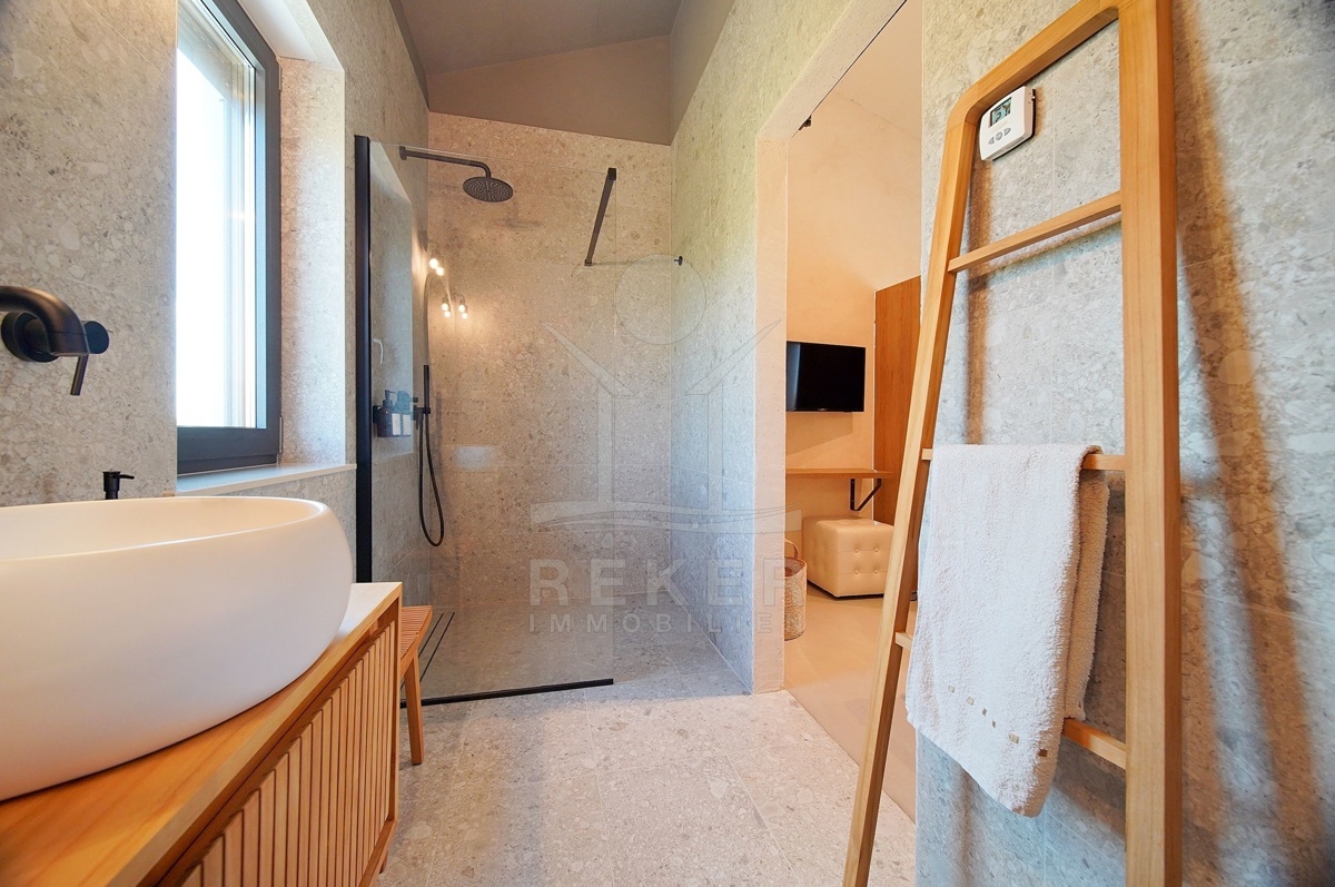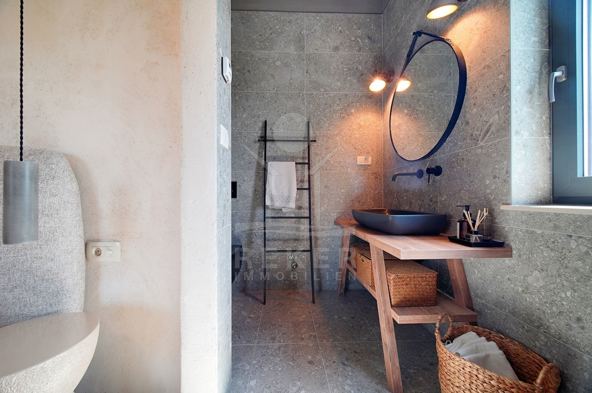 Der Außenbereich dieser Villa ist ein wahres Paradies mit einem Skimmer-Pool von 40 m², der mit einer modernen Beschichtung aus Mikrozement und Salzwasser ausgestattet ist. Eine großzügige Sonnenterrasse bietet Liegestühle, eine Dusche, eine Feuerstelle, moderne Sitzgelegenheiten und Sonnenschirme für ultimativen Komfort. Die Außenbeleuchtung schafft eine stimmungsvolle Atmosphäre, während der Wasserfall und die Wasserheizung das Poolerlebnis auf ein neues Level heben. Diese Villa bietet Ihnen ein Luxusleben im Freien, das Sie sich nicht entgehen lassen sollten.
