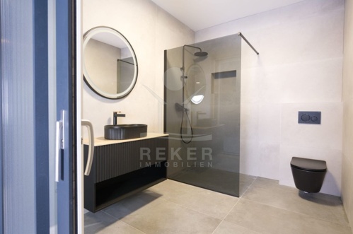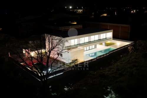 Die überdachte Terrasse der Villa ist ein echtes Highlight und bietet einen Ort der Entspannung im Freien. Der 38 m² große beheizte Pool mit Gegenstromanlage und Wasserfall lädt zum Schwimmen und Verweilen ein. Die Terrasse bietet einen schönen Ausblick auf den Garten und eignet sich perfekt für gesellige Abende oder entspannte Stunden unter freiem Himmel. Diese moderne Villa vereint Luxus mit Komfort und ist der ideale Ort, um das Leben in vollen Zügen zu genießen.