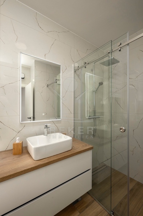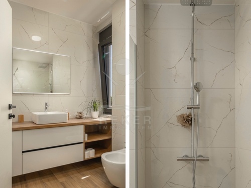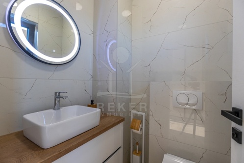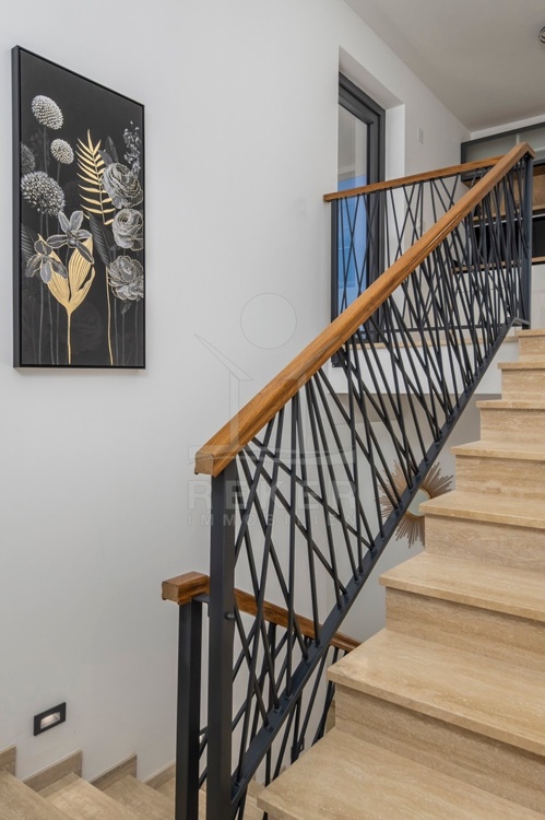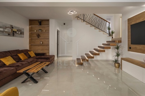 Die Villa erstreckt sich über ein wunderschönes Grundstück von 466 m² und bietet großzügige 386 m² Wohnfläche. Umgeben von einer stilvollen Steinmauer und einem modernen Zaun, sorgt sie für eine Privatsphäre. Bei der Ausstattung wurde auf höchste Qualität geachtet: Die Bodenbeläge aus Fliesen und Laminat, PVC-Fenster mit Rollläden und Moskitonetzen sowie die elektrische Fußbodenheizung im Wohnzimmer, Fitnessraum und Badezimmern bieten einen hohen Wohnkomfort. Zusätzlich sind Klimaanlagen in den Wohnräumen und im Fitnessraum installiert. Auch die Möglichkeit, einen Holzofen oder Kamin zu installieren, sorgt für ein behagliches Ambiente.