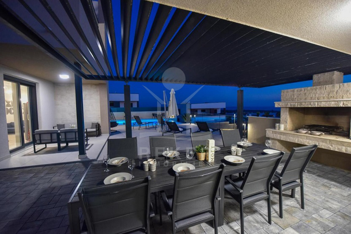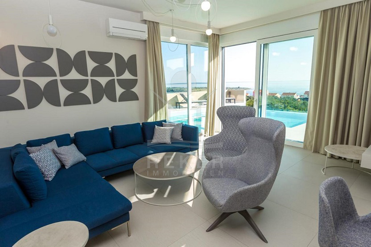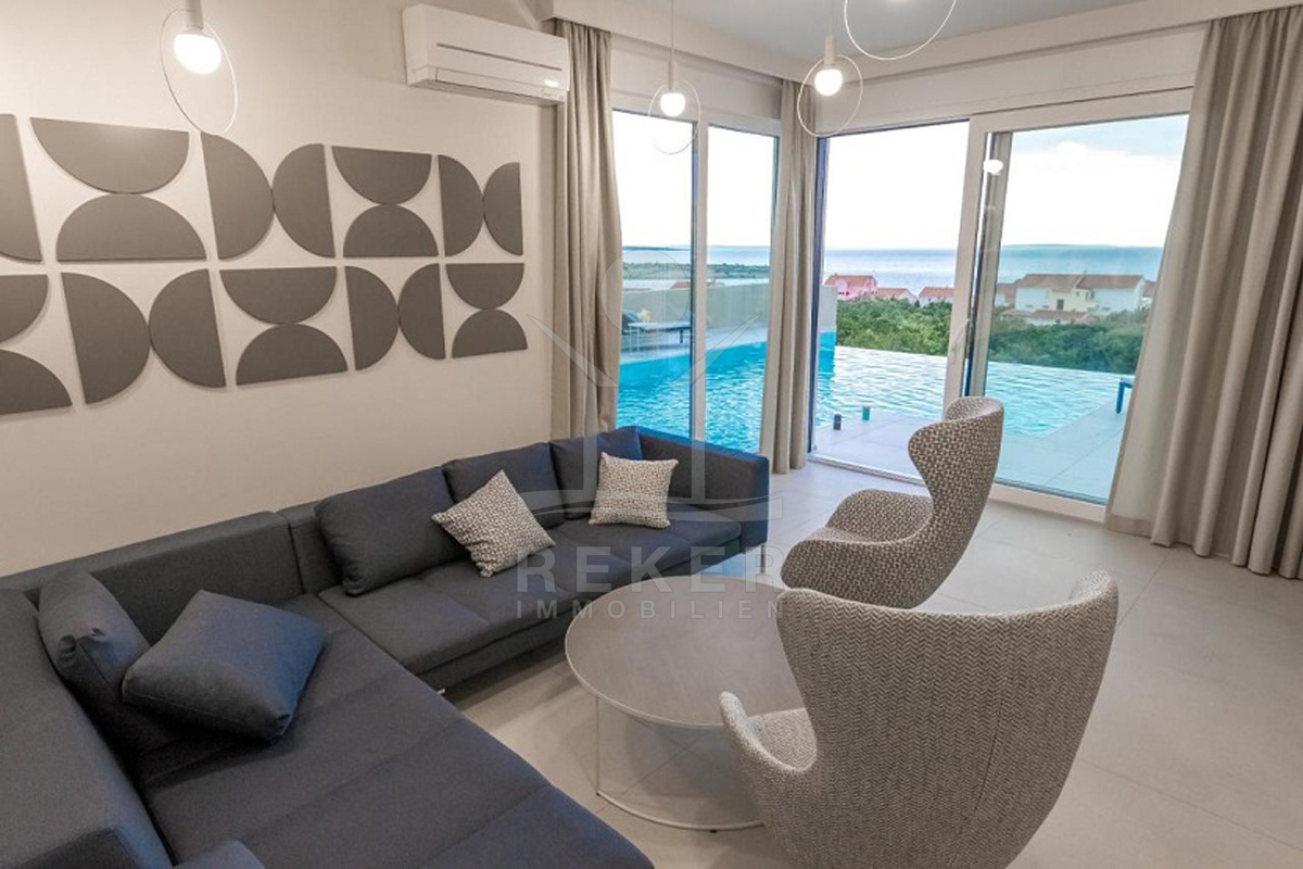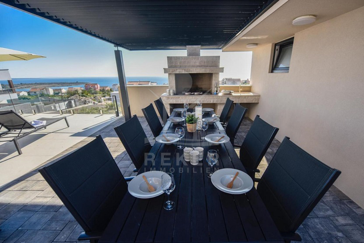 Novalja. Südhang. Die Sonne über dem Meer – direkt vor Ihrer Terrasse. Diese moderne Villa liegt in erhöhter Lage auf der Insel Pag, mit Panoramablick über die Dächer von Novalja und das offene Wasser. Sie erreichen das Meer in etwa 600 Metern oder 15 Minuten zu Fuß. Die Straße ist ruhig, der Blick frei. Vor dem Haus: Stellplätze für mehrere Autos.