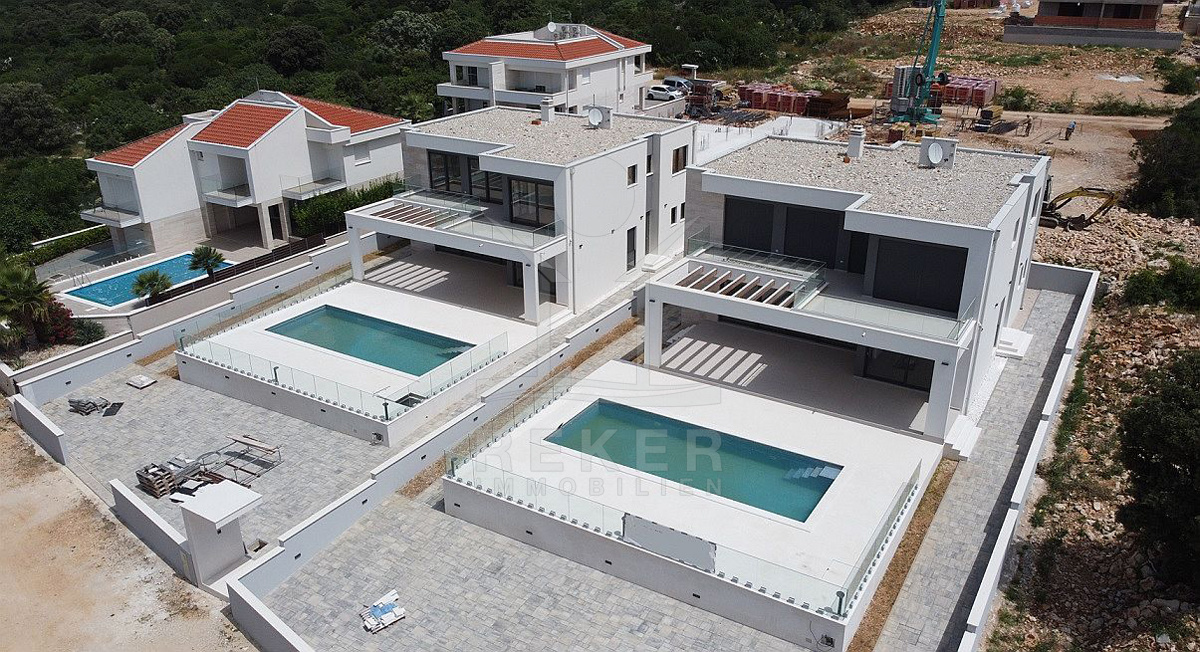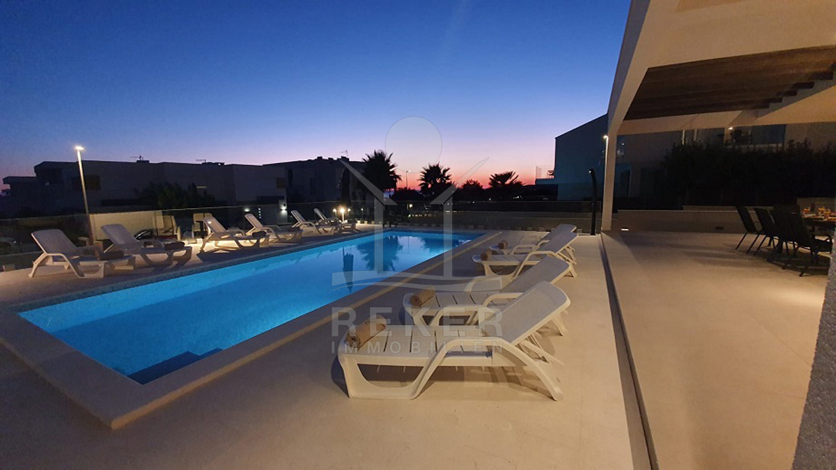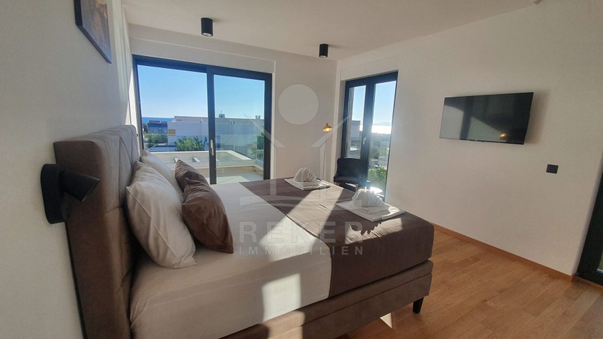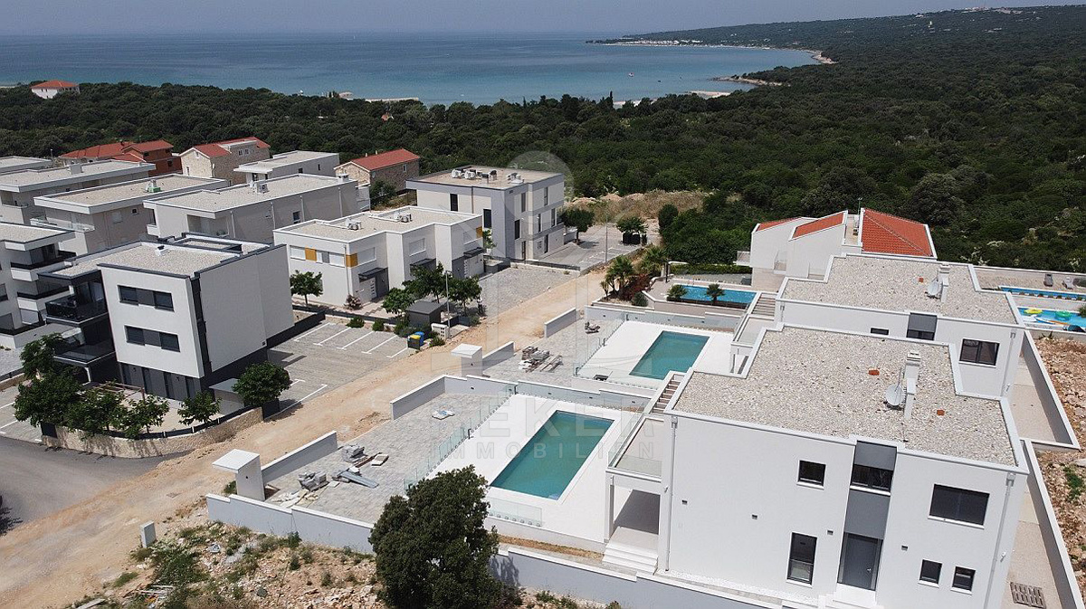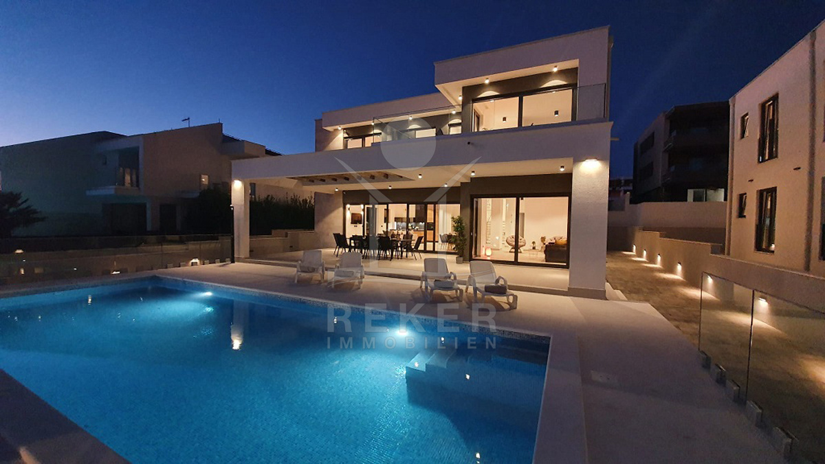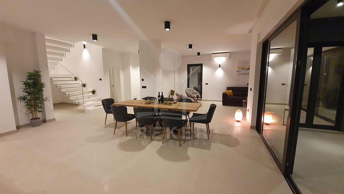 Im südwestlichen Teil von Novalja – einer der begehrtesten Wohngegenden – steht diese freistehende Villa nur rund 300 Meter vom Meer entfernt. Die Nachbarschaft ist modern und gepflegt, das Umfeld ruhig. Ideal für alle, die Privatsphäre und stilvolles Wohnen in Küstennähe suchen. Auf dem eigenen Grundstück parken Sie 3 bis 4 Fahrzeuge bequem – auch die E-Ladestation ist vorbereitet. Zugang zur Villa erfolgt über ein elektrisches Zufahrtstor und ein repräsentatives Eingangsportal mit Kamera und Gegensprechanlage.