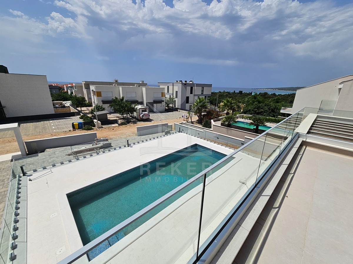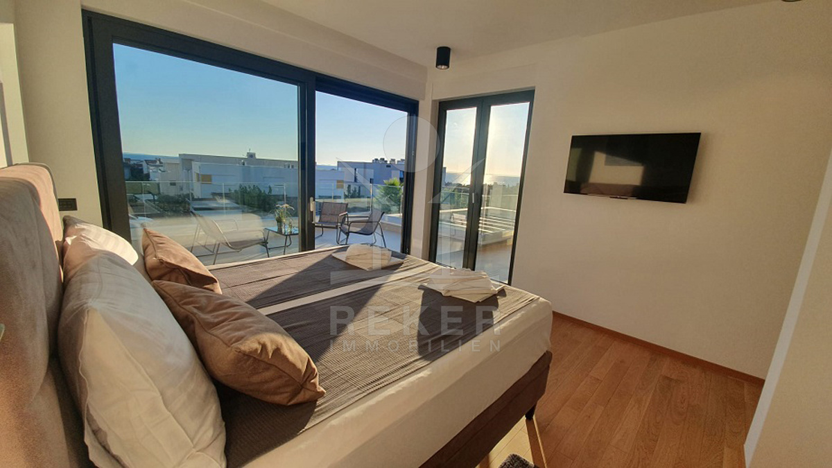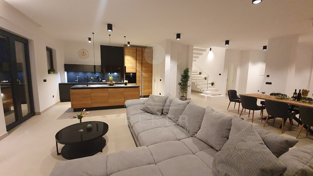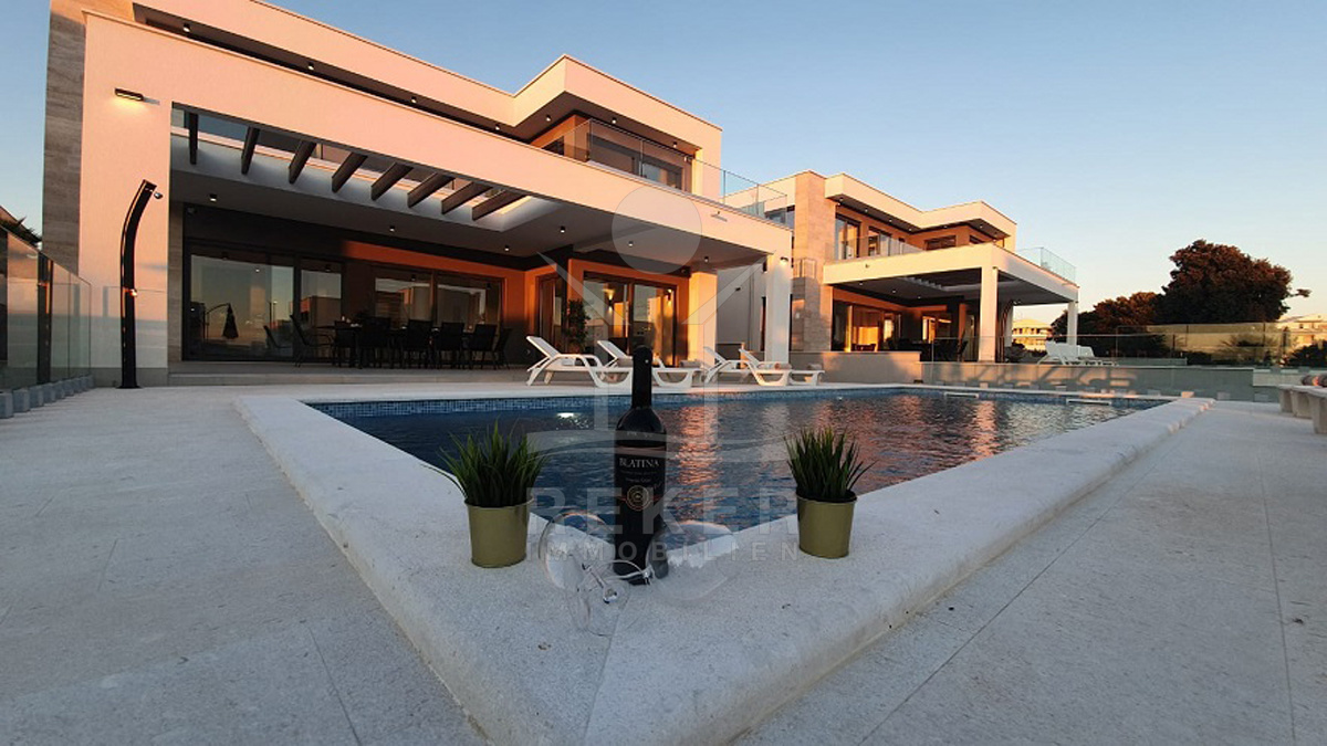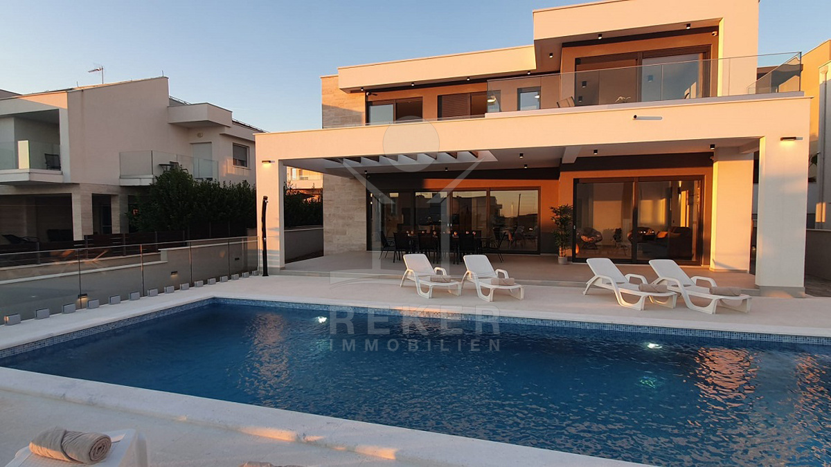 Im südwestlichen Teil von Novalja – einer der begehrtesten Wohngegenden – steht diese freistehende Villa nur rund 300 Meter vom Meer entfernt. Die Nachbarschaft ist modern und gepflegt, das Umfeld ruhig. Ideal für alle, die Privatsphäre und stilvolles Wohnen in Küstennähe suchen. Auf dem eigenen Grundstück parken Sie 3 bis 4 Fahrzeuge bequem – auch die E-Ladestation ist vorbereitet. Zugang zur Villa erfolgt über ein elektrisches Zufahrtstor und ein repräsentatives Eingangsportal mit Kamera und Gegensprechanlage.