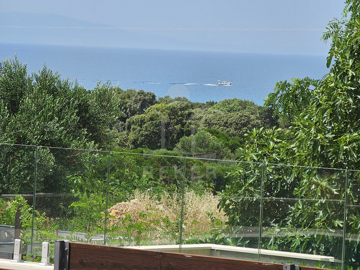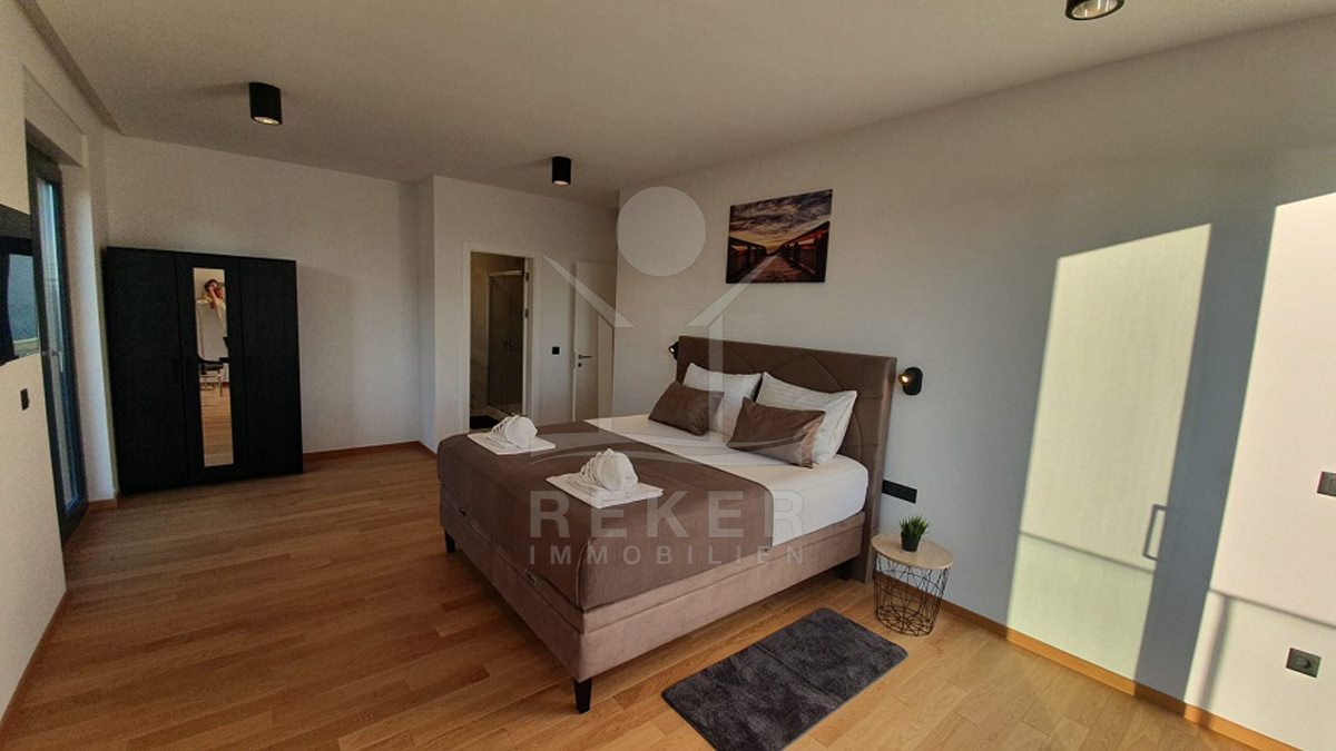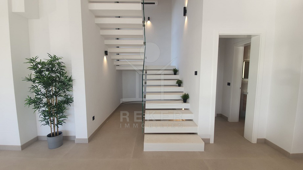 Innen empfängt Sie ein großzügiger, lichtdurchfluteter Wohnbereich. Die Küche – offen, mit Insel – stammt von Häcker, ausgestattet mit Miele-Geräten. Der Kamin schafft Gemütlichkeit, auch in der Nebensaison. Große Glasschiebeelemente öffnen den Raum zur Terrasse. Die freischwebende Treppe führt ins Obergeschoss – ein echter Blickfang. Dort liegen vier Schlafzimmer, jedes mit eigenem Bad. Die Ausstattung ist durchgehend hochwertig: Echtholzparkett, Villeroy & Boch Keramik, Hüppe-Duschen und Hansa-Armaturen. Zwei der Zimmer haben Meerblick und Zugang zu den Balkonen. Beheizt wird mit Danfoss-Fußbodenheizung, gekühlt mit Daikin-Klimaanlagen. WLAN ist überall verfügbar – auch draußen. Für Sicherheit sorgt eine Videoüberwachung mit acht HD-Kameras. Alles andere? Funktioniert einfach – und sieht gut aus.