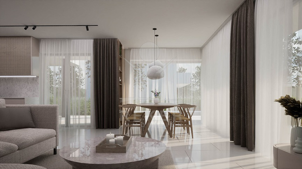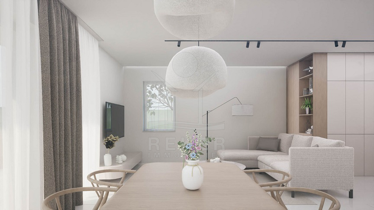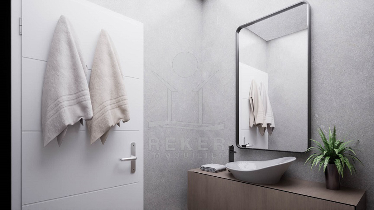 Das Erdgeschoss öffnet sich mit einem Wohnbereich, der direkt auf die 68 m² große Terrasse führt. Hier können Sie gemeinsam essen oder lange Sommerabende verbringen. Ergänzt wird die Etage durch ein Badezimmer, eine separate Toilette, einen Abstell- und Technikraum sowie einen freundlichen Eingangsbereich.