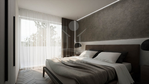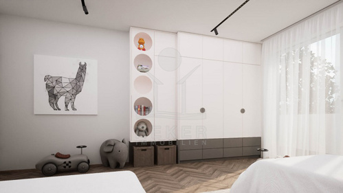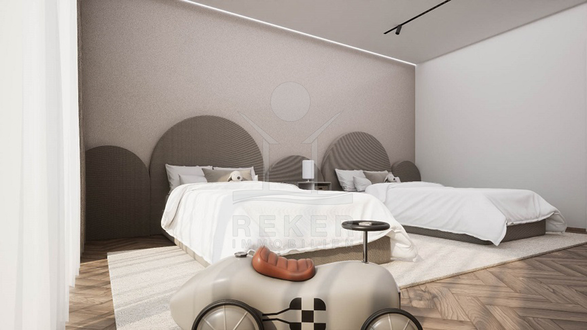 Im Obergeschoss finden Sie vier Schlafzimmer, zwei davon als Kinderzimmer gestaltet. Drei moderne Bäder und eine Garderobe sorgen für Komfort im Alltag. Besonders reizvoll sind die drei Balkone, die den Blick auf das Meer öffnen. Die Villa ist voll klimatisiert und mit hochwertigen Materialien gebaut.