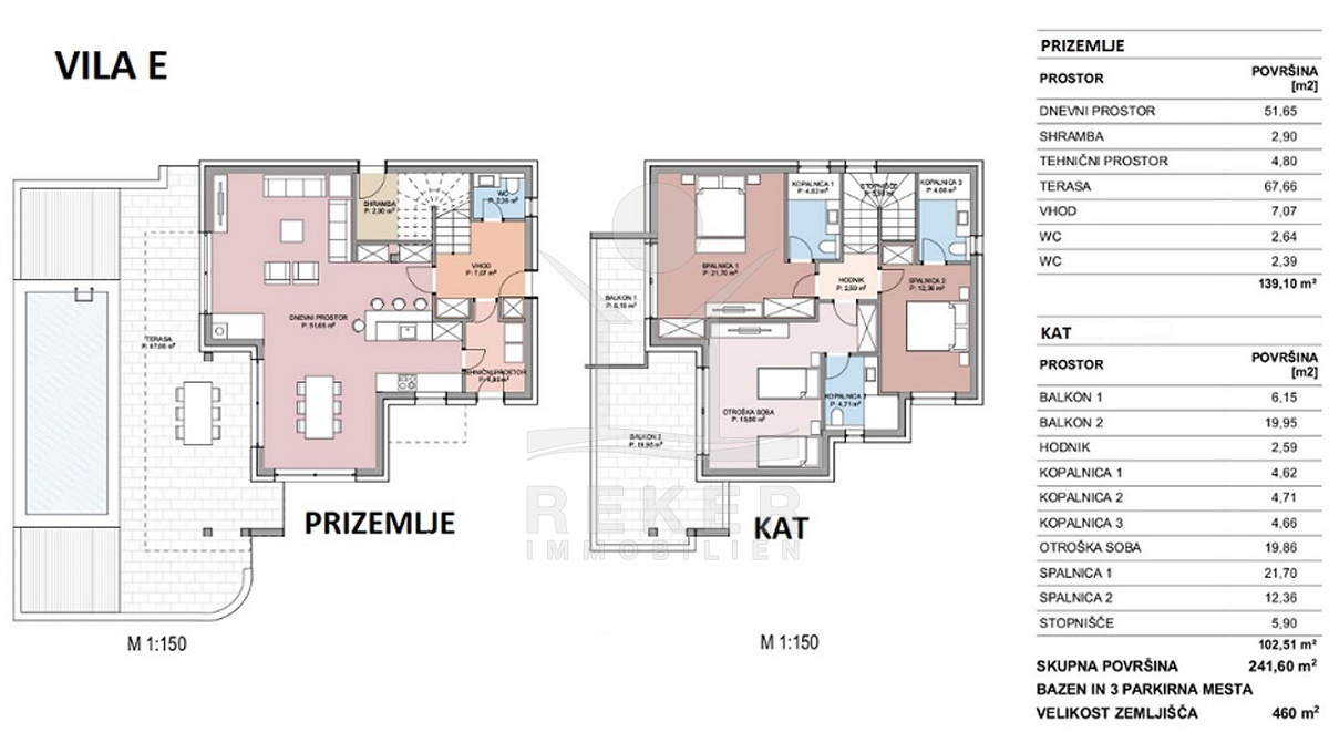 m Erdgeschoss mit 139 m² finden Sie ein großzügiges Wohnzimmer mit direktem Zugang zur Terrasse. Dazu kommen zwei WCs, eine Speisekammer, ein Abstellraum und ein Flur. Das Obergeschoss mit 103 m² bietet drei Schlafzimmer, jeweils mit eigenem Bad. Besonders reizvoll sind die beiden Balkone mit Meerblick. Klimaanlagen in allen Räumen sorgen für ein angenehmes Raumklima.
