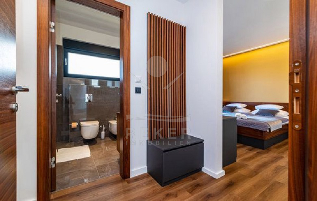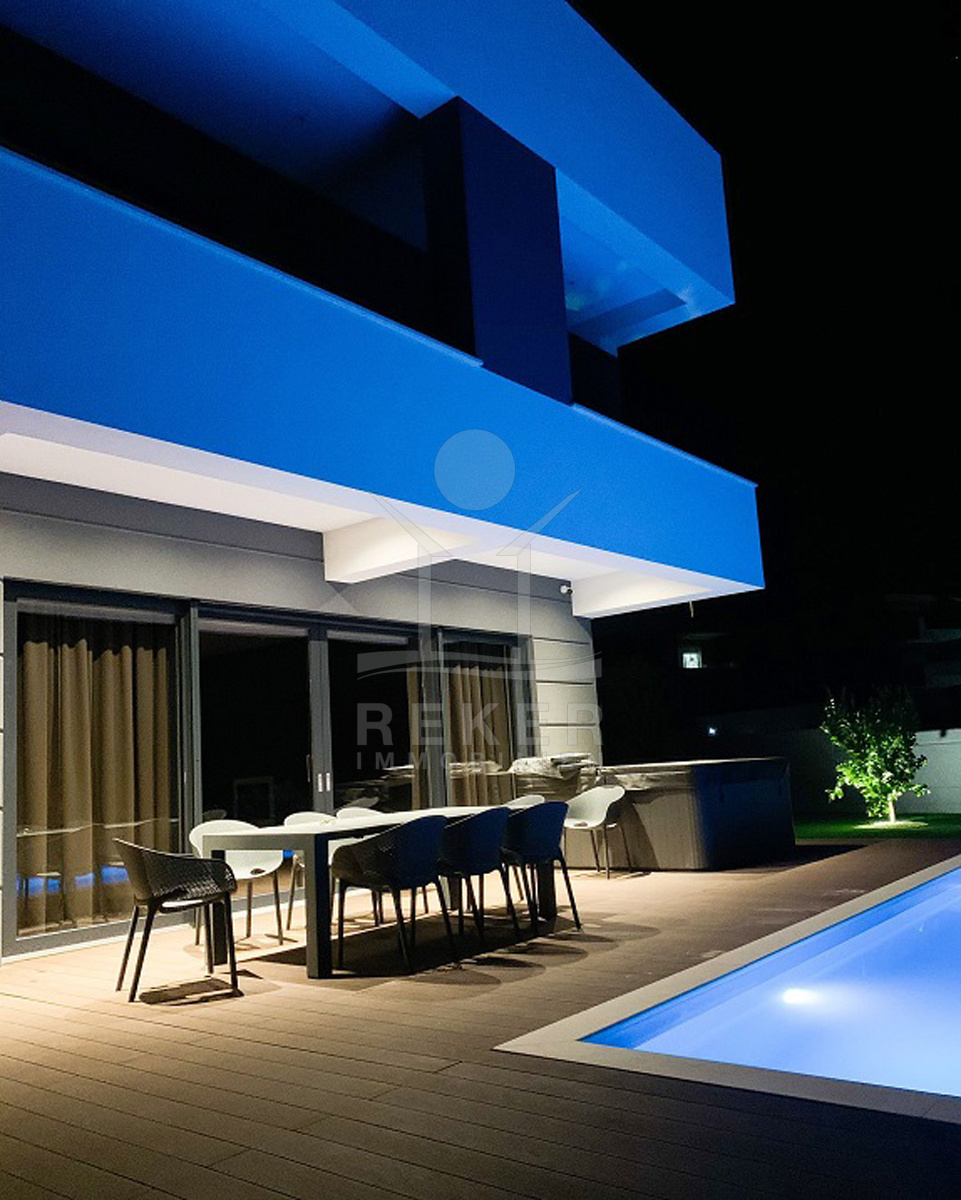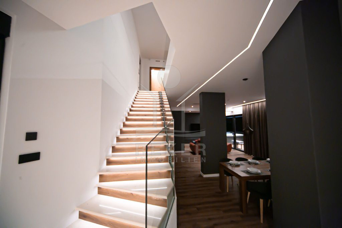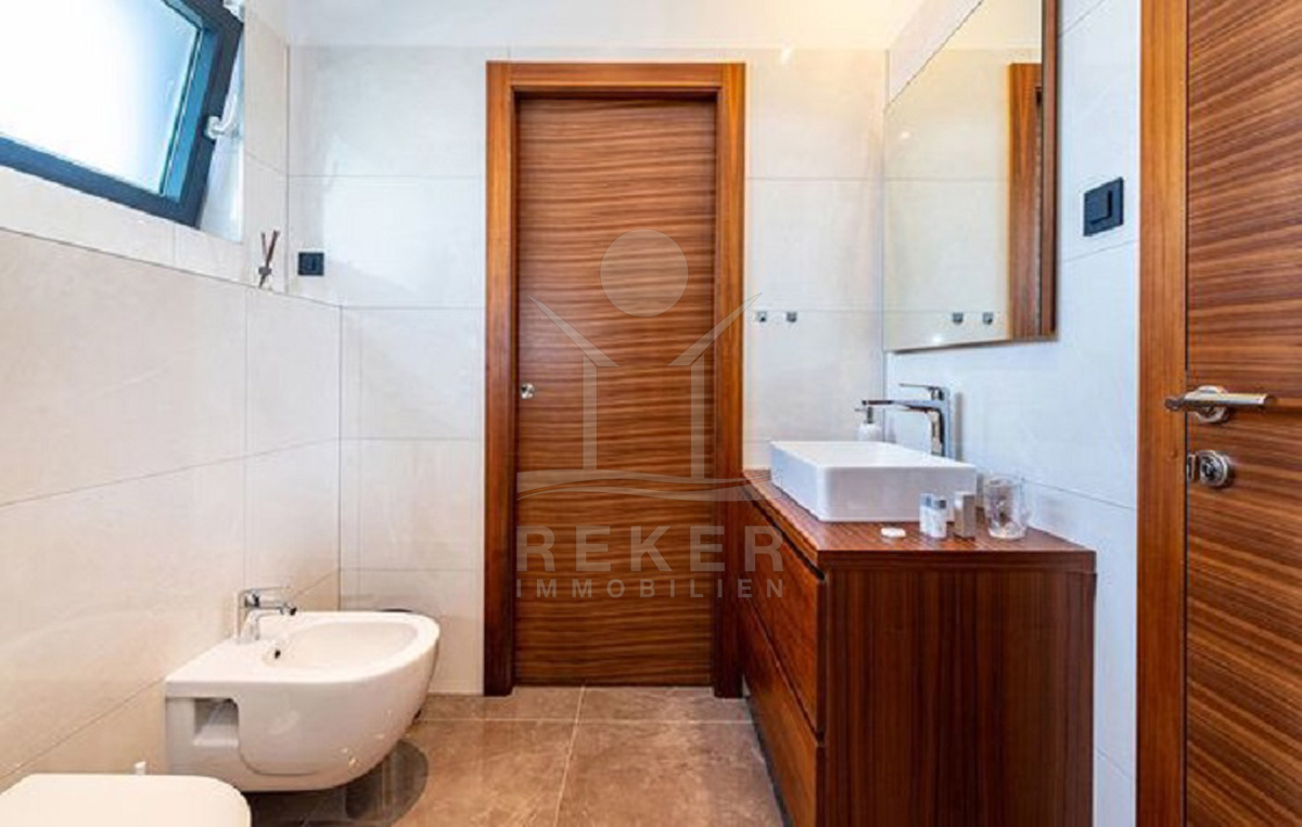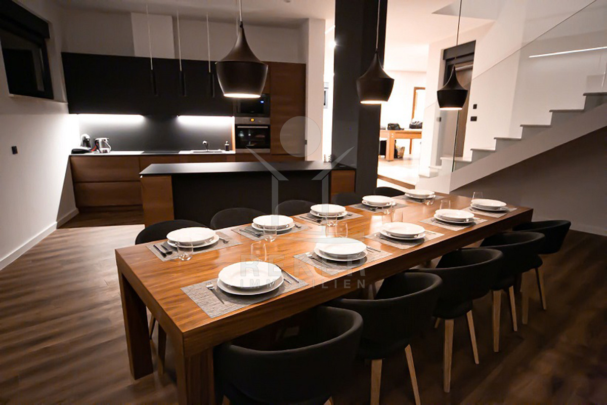 Die Villa selbst verteilt sich auf zwei Etagen mit insgesamt 350 m² Wohnfläche. Im Erdgeschoss befinden sich die offene Küche mit Essbereich, ein Wohnraum mit Kamin, ein Bad, ein Spielzimmer mit Billard und Playstation sowie der Heizraum. Große Schiebetüren führen direkt auf die Terrasse. Im Obergeschoss: vier Schlafzimmer, jeweils mit eigenem Bad und Zugang zum Balkon mit Meerblick. Alle Badezimmer sind mit Fußbodenheizung ausgestattet. Die komplette Villa ist klimatisiert (Daikin-System), alle Zimmer verfügen über Smart-TVs. Sie steuern alles bequem per App – Rollläden, Jalousien, Licht und vieles mehr. Für Sicherheit sorgen Alarmanlage und Videoüberwachung. Ein echtes Smart Home, das nicht nur modern aussieht, sondern es auch ist.