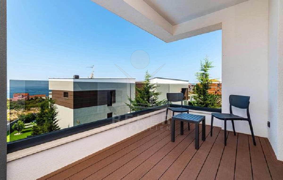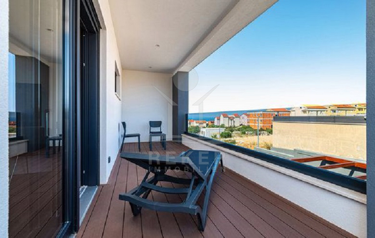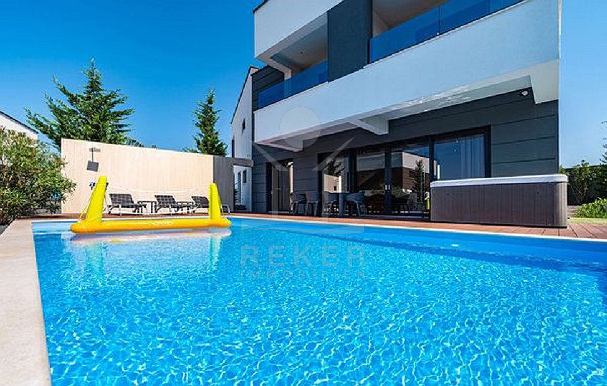 Nur 600 Meter vom Meer entfernt, liegt diese luxuriöse Villa in einer wunderschönen Wohngegend von Novalja auf der Insel Pag. Das moderne Viertel besteht aus freistehenden Neubauvillen – gepflegt, hochwertig und mit viel Abstand zueinander. Hecken und Sichtschutz sorgen für Privatsphäre, der Meerblick kommt trotzdem nicht zu kurz: Von allen vier Balkonen aus blicken Sie direkt aufs Wasser.