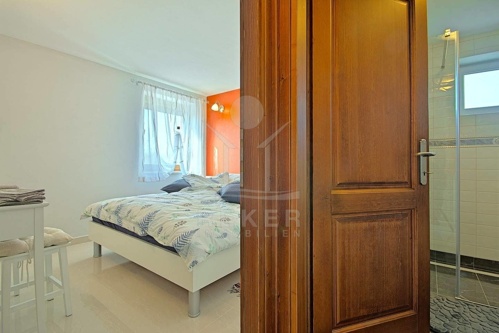 Über eine interne Treppe erreichen Sie das helle und luftige Obergeschoss, dessen Zimmerdecken mit dekorativen Balken verziert sind. Hier befindet sich ein weiteres Schlafzimmer mit eigenem Bad und einem Zugang zur Terrasse.