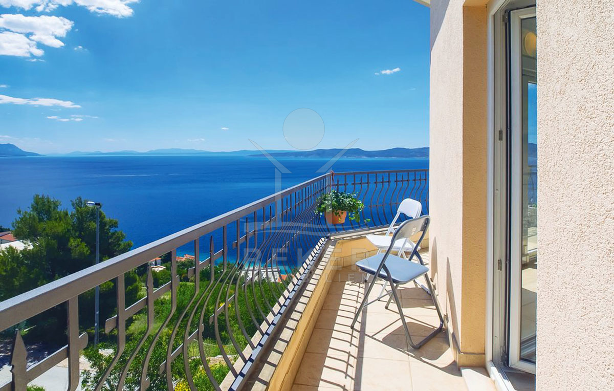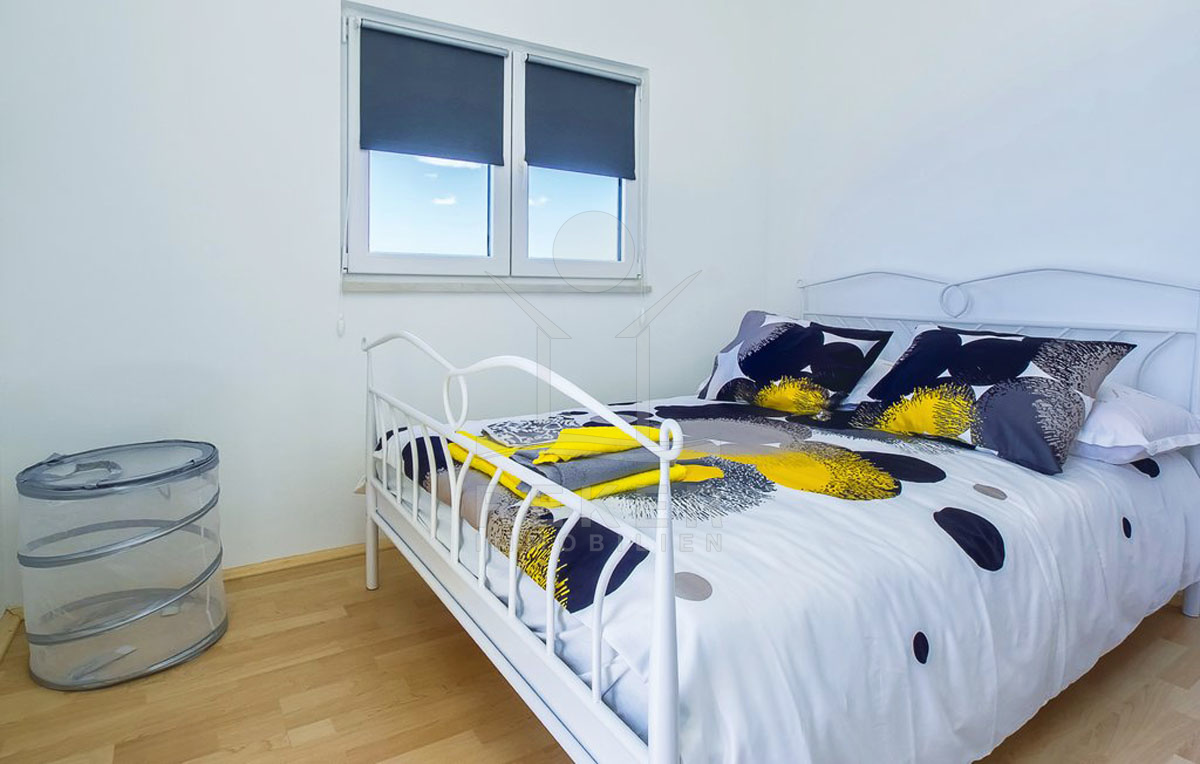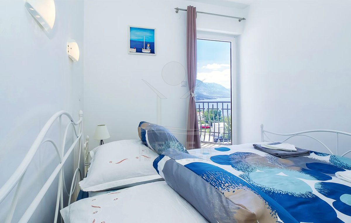 Eine elegante Marmortreppe führt in das 1. Obergeschoss, wo sich drei einladende Schlafzimmer und ein stilvolles Badezimmer befinden. Jedes Zimmer bietet Zugang zu einem eigenen Balkon, von dem aus Sie den atemberaubenden Blick auf die malerische Küste von Pelješac, Hvar, Brač und Split genießen können.