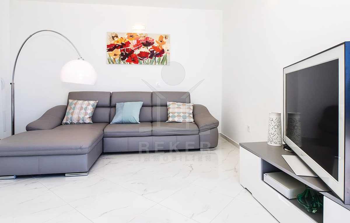 Das vollständig möblierte Haus ist mit einer Klimaanlage ausgestattet und bietet hohen Wohnkomfort. Im Erdgeschoss finden Sie ein großzügiges Wohnzimmer mit integriertem Essbereich, eine moderne Küche sowie eine Gästetoilette, die den idealen Rahmen für gesellige Abende bietet.