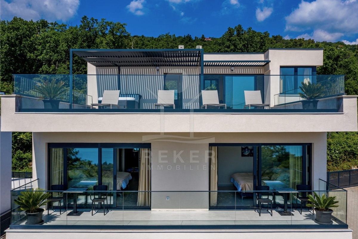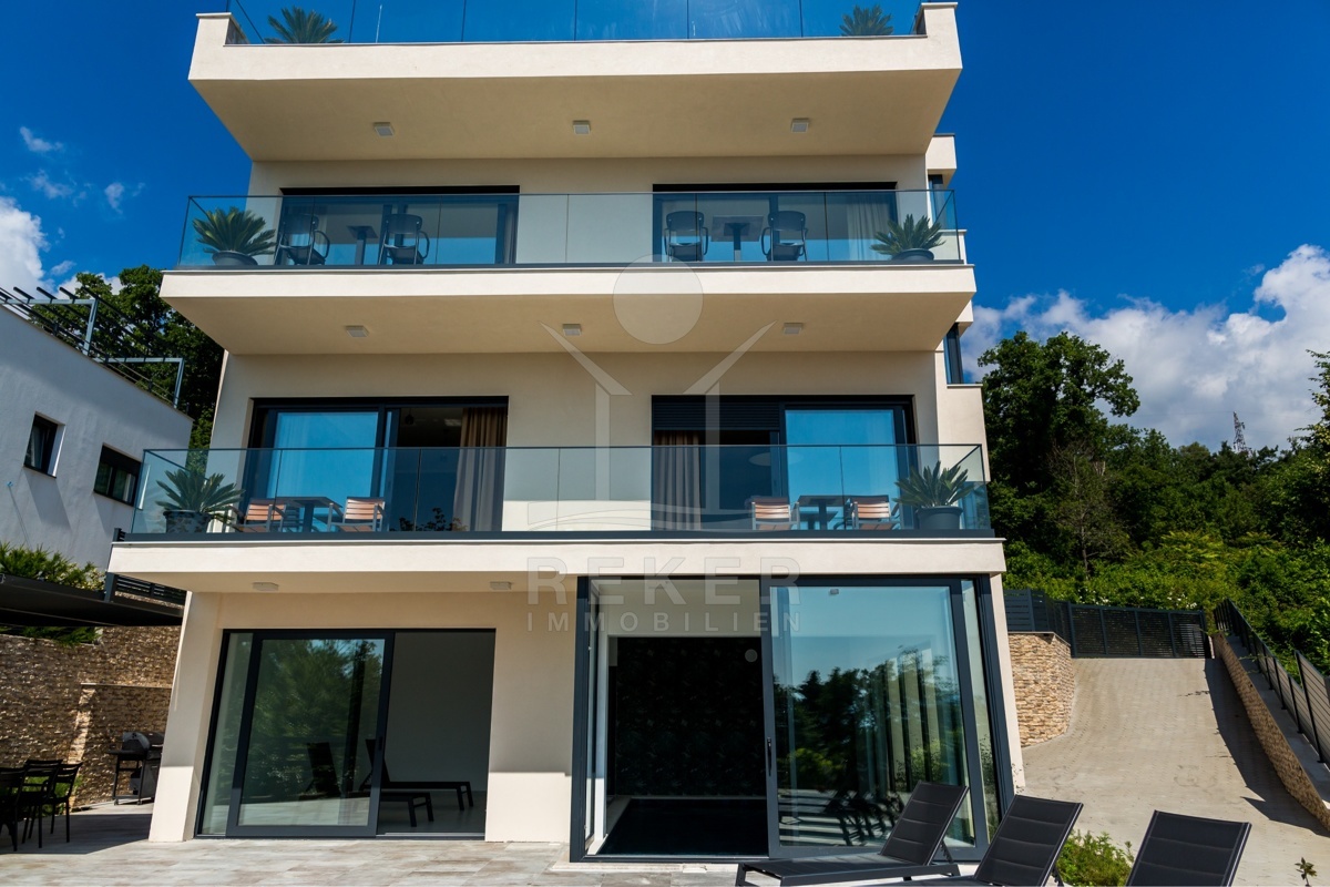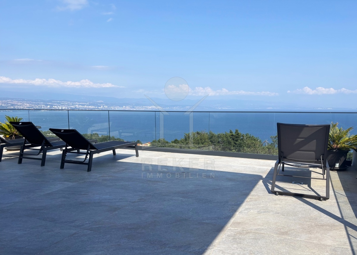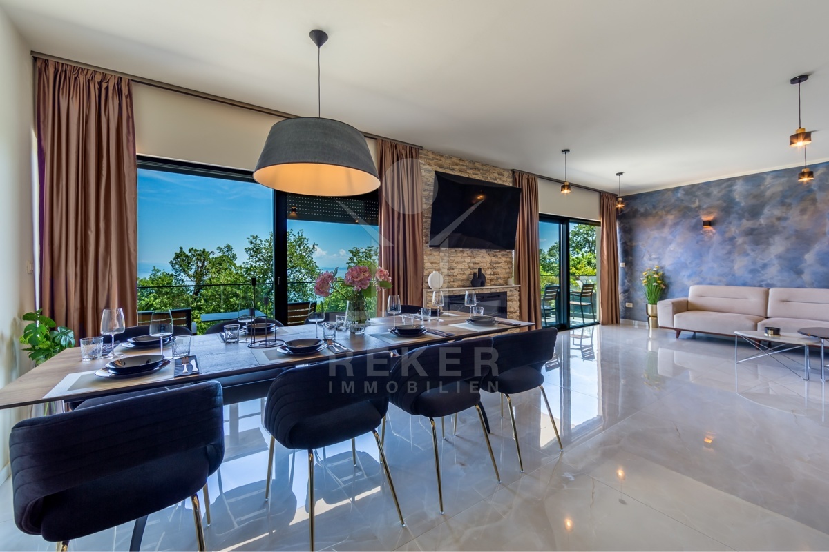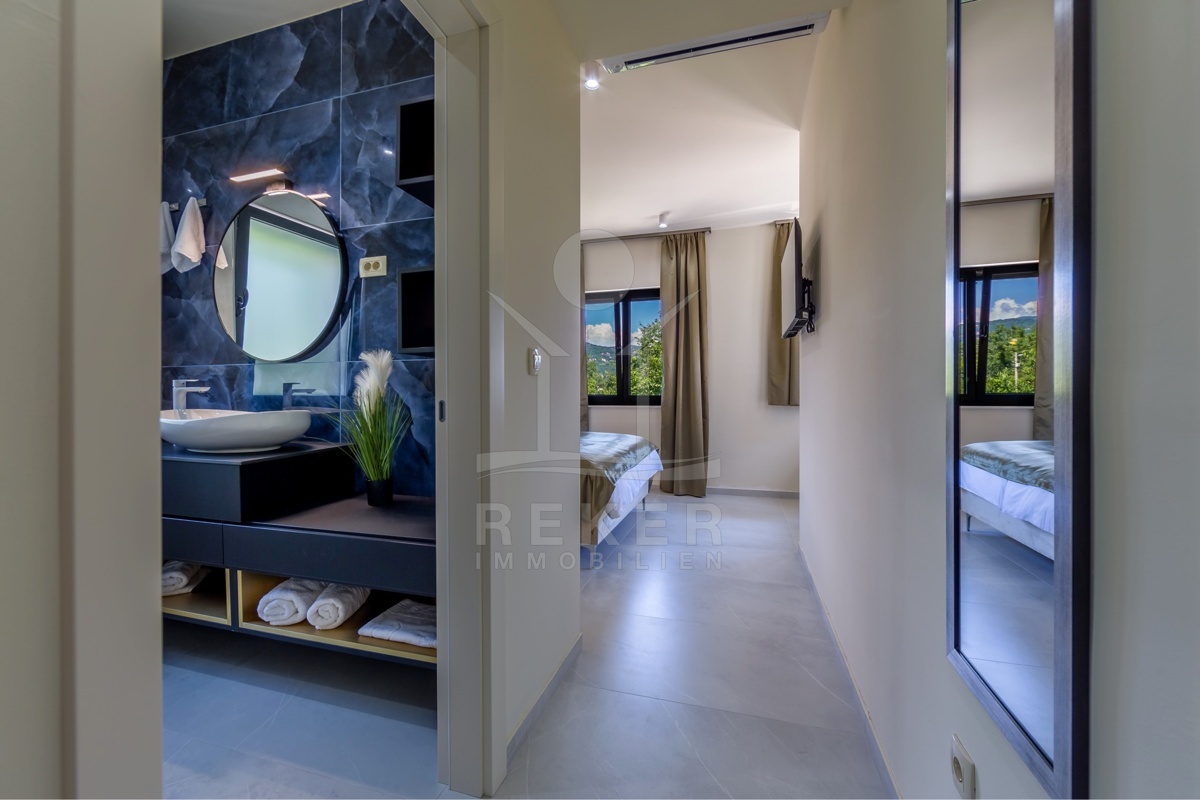 Grüne Hügel, absolute Ruhe und ein freier Blick auf die Kvarner Bucht … nur wenige Minuten oberhalb von Lovran. Diese Villa liegt in einer kleinen Seitenstraße, umgeben von Natur und hochwertiger Nachbarschaft. Die Nähe zu Opatija, die Aussicht auf das Meer und die entspannte Lage machen sie zu einer echten Ausnahmeimmobilie. Im Garten selbst laden ein schattiger Essplatz, die Sommerküche und mediterrane Bepflanzung zum Draußensein ein. Auch praktisch: Die Garage ist direkt ans Haus angebunden.
