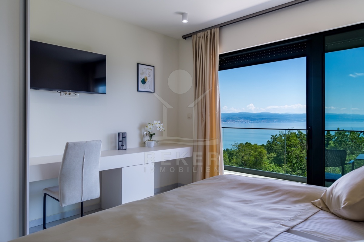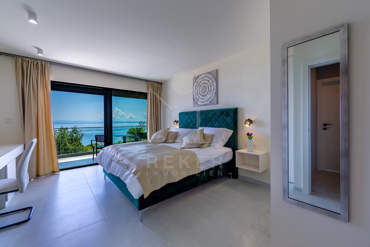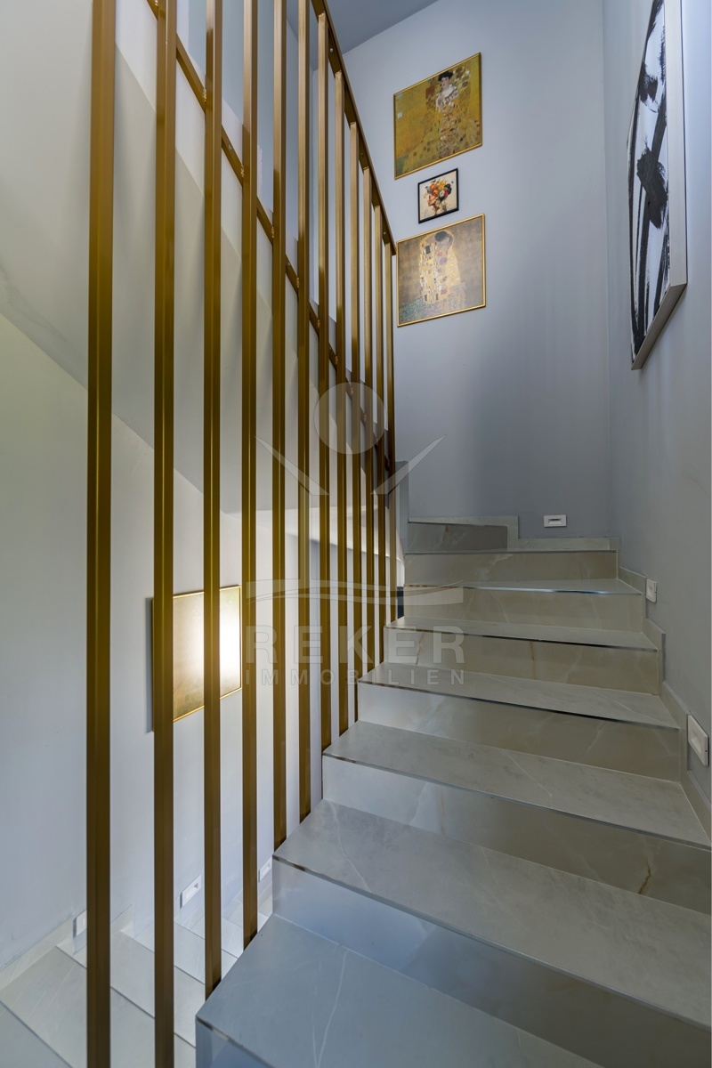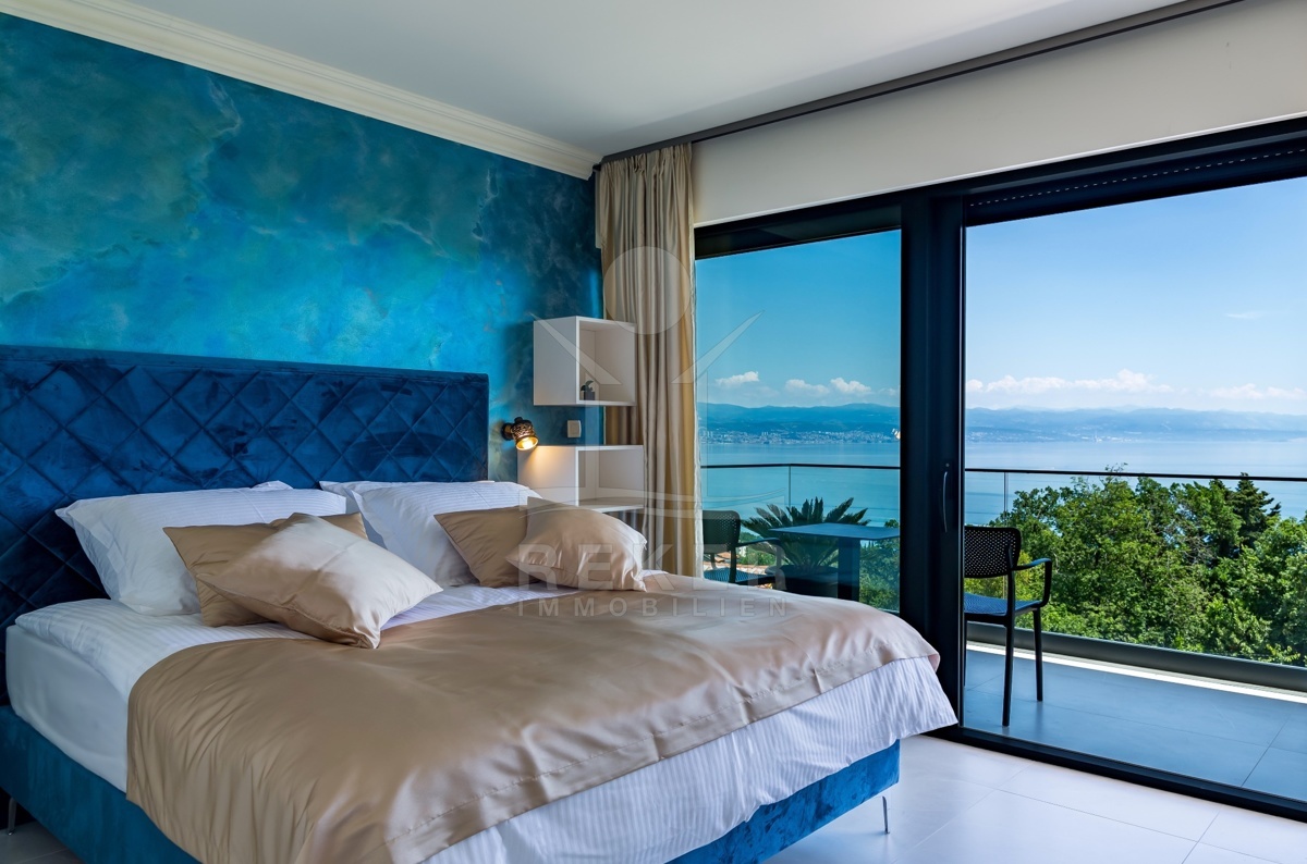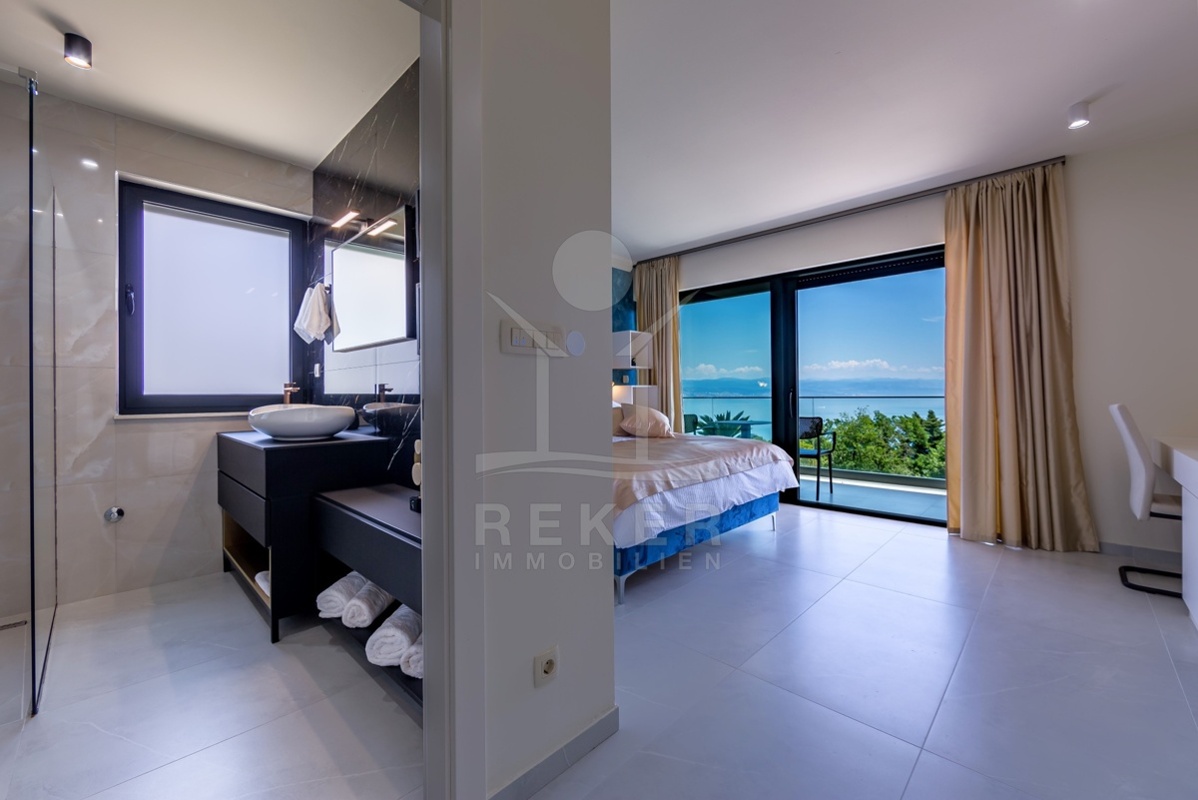 Grüne Hügel, absolute Ruhe und ein freier Blick auf die Kvarner Bucht … nur wenige Minuten oberhalb von Lovran. Diese Villa liegt in einer kleinen Seitenstraße, umgeben von Natur und hochwertiger Nachbarschaft. Die Nähe zu Opatija, die Aussicht auf das Meer und die entspannte Lage machen sie zu einer echten Ausnahmeimmobilie. Im Garten selbst laden ein schattiger Essplatz, die Sommerküche und mediterrane Bepflanzung zum Draußensein ein. Auch praktisch: Die Garage ist direkt ans Haus angebunden.