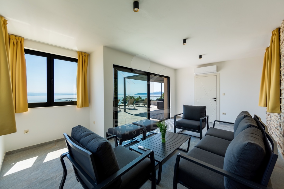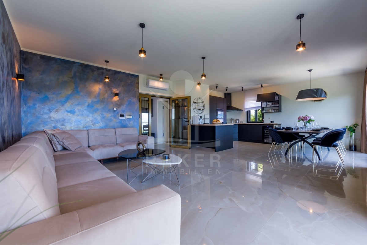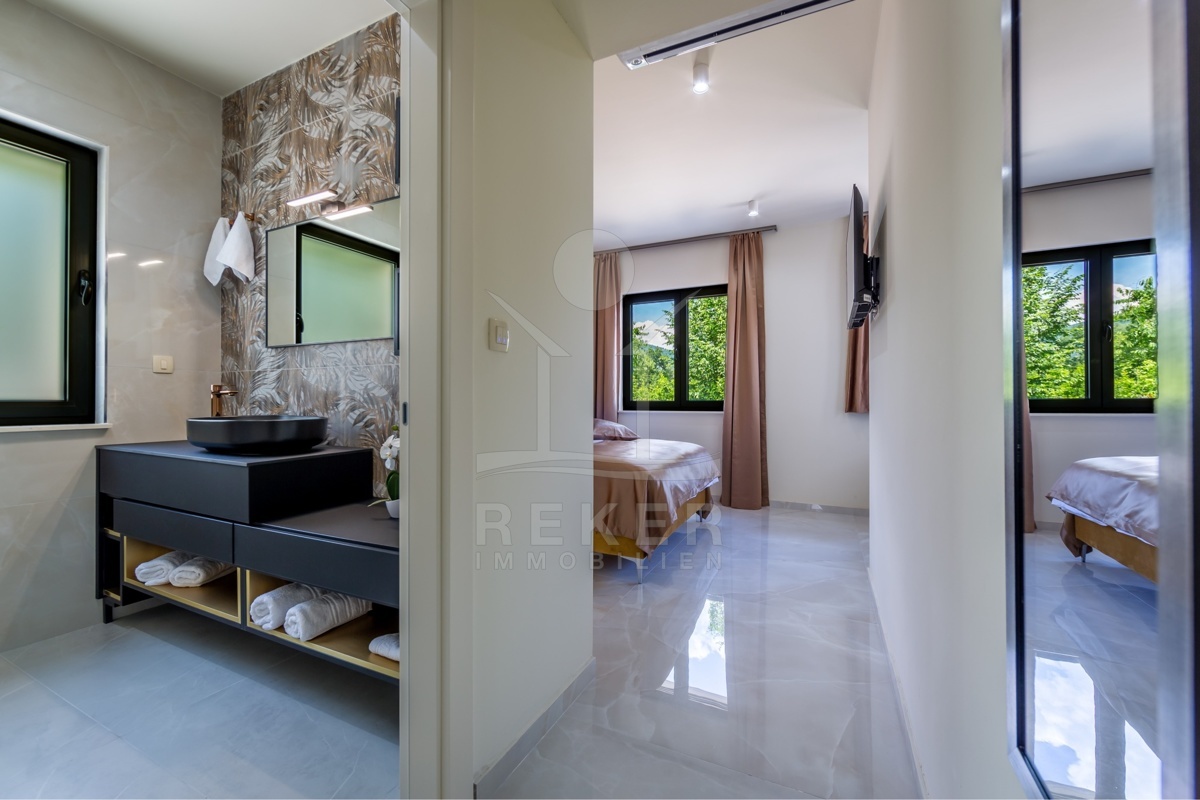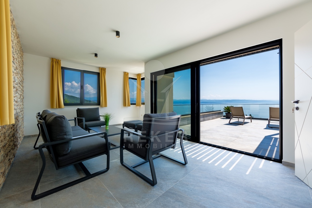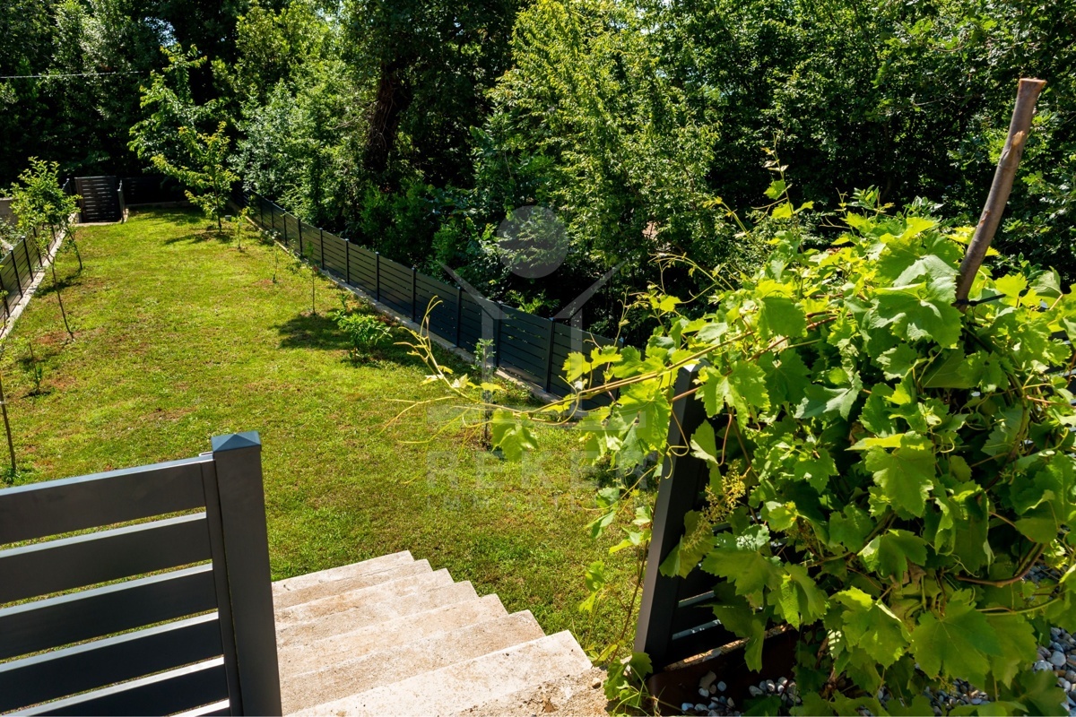 Grüne Hügel, absolute Ruhe und ein freier Blick auf die Kvarner Bucht … nur wenige Minuten oberhalb von Lovran. Diese Villa liegt in einer kleinen Seitenstraße, umgeben von Natur und hochwertiger Nachbarschaft. Die Nähe zu Opatija, die Aussicht auf das Meer und die entspannte Lage machen sie zu einer echten Ausnahmeimmobilie. Im Garten selbst laden ein schattiger Essplatz, die Sommerküche und mediterrane Bepflanzung zum Draußensein ein. Auch praktisch: Die Garage ist direkt ans Haus angebunden.
