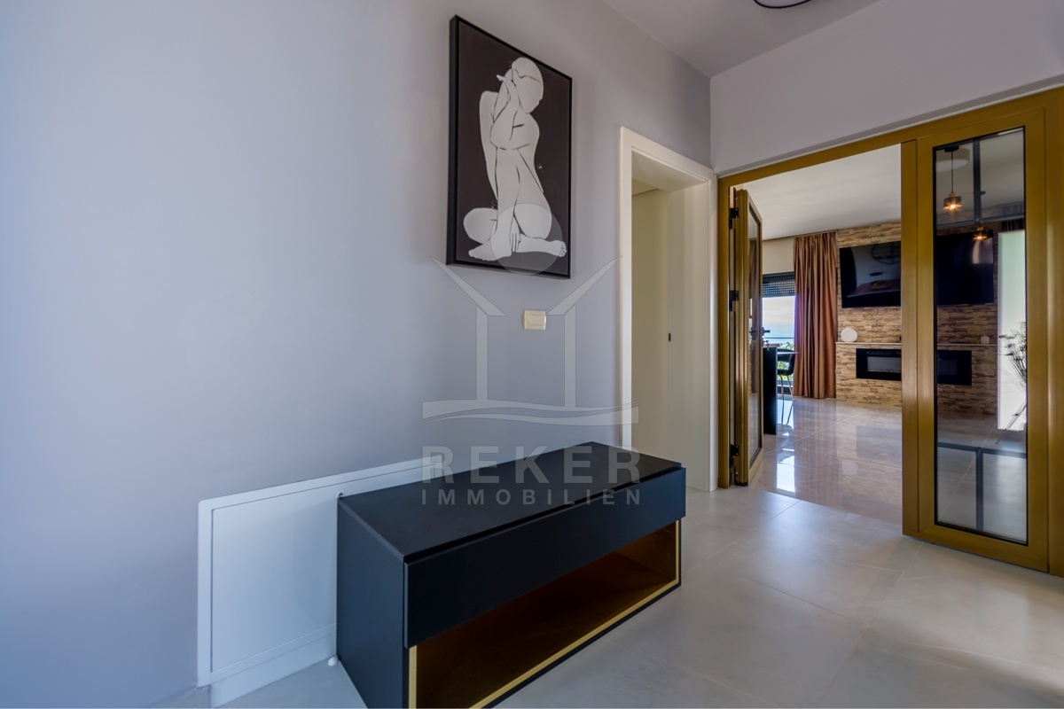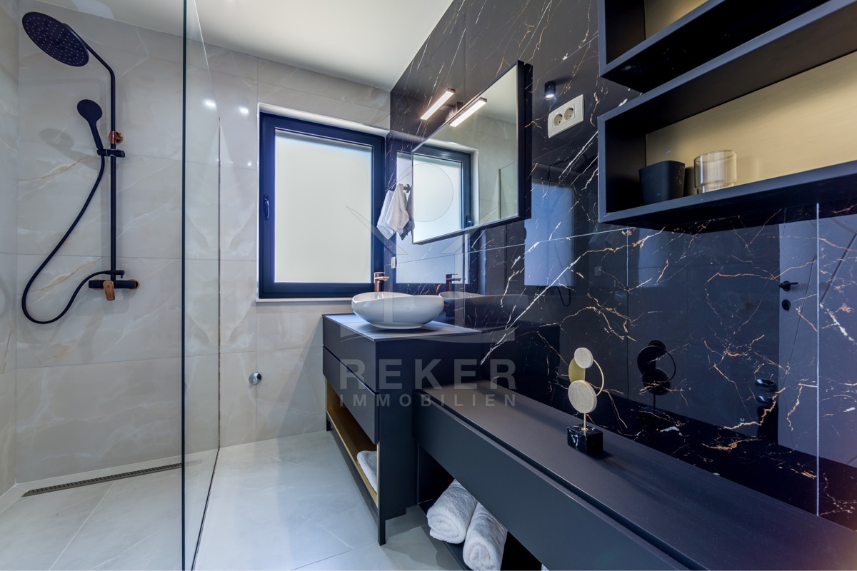 Im Erdgeschoss wartet ein offener Wohnbereich mit Designküche, großem Esstisch und gemütlichem Loungebereich. Alles ist mit exklusiven Möbeln eingerichtet – geschmackvoll, modern, hochwertig. Im Obergeschoss befinden sich vier Schlafzimmer, jeweils mit eigenem Bad. Zwei davon haben Zugang zu einem privaten Balkon. Ganz oben liegt die Dachterrasse: Whirlpool, Lounge und ein kleiner Rückzugsraum mit Blick über das Meer. Ein Haus zum Ankommen … mit allem, was man nicht mehr missen will.