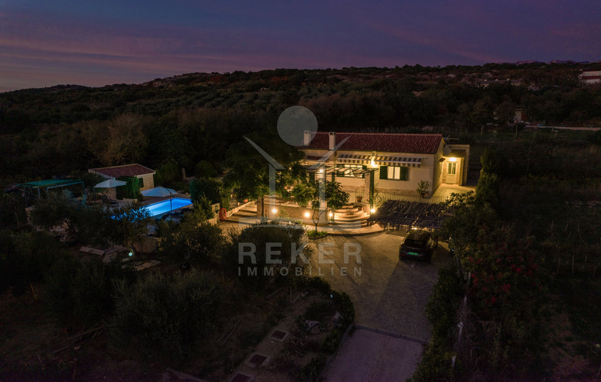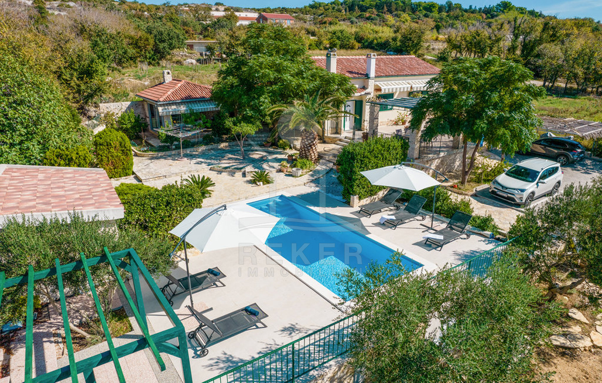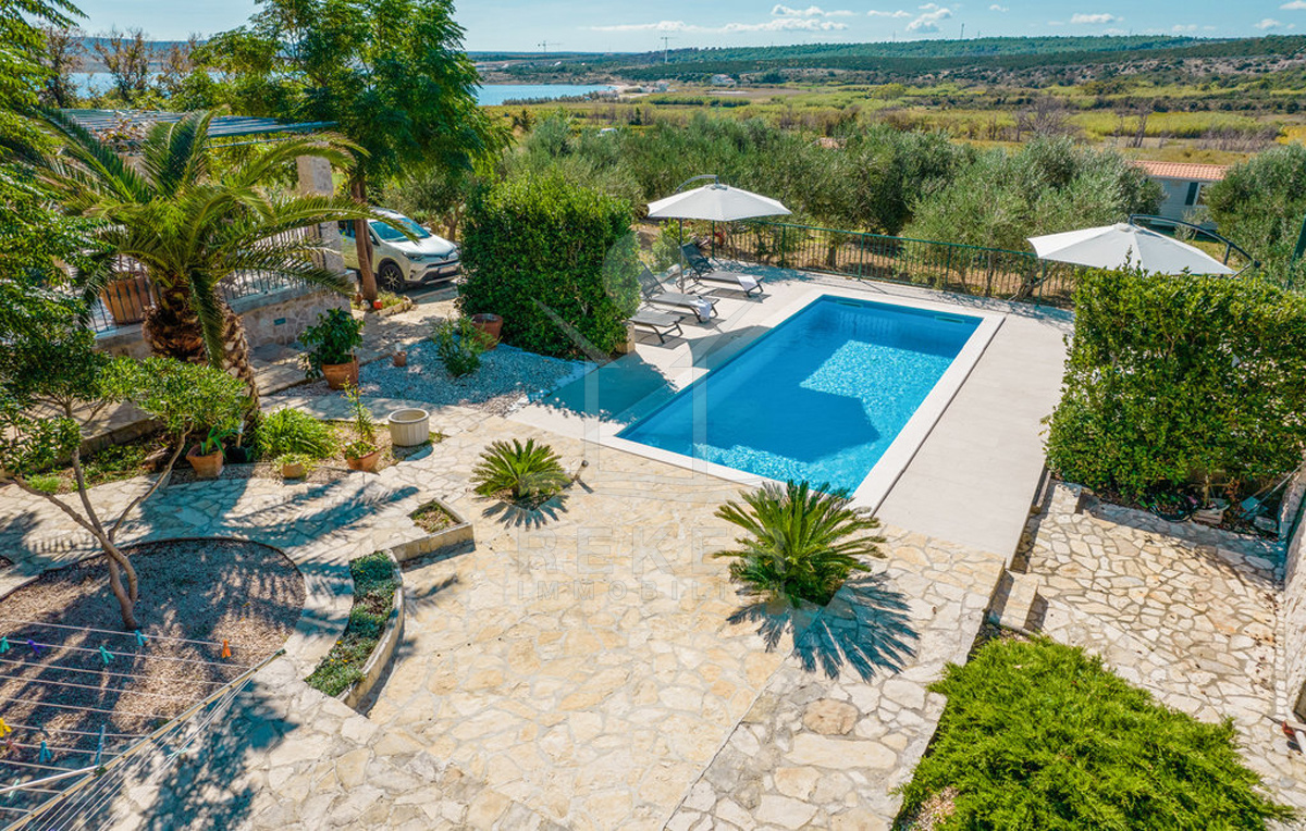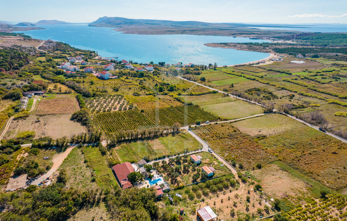 Rundherum Natur, kein Nachbar in Sicht. Dieses Haus steht für Ruhe, Rückzug und echtes Inselfeeling. Sie wohnen hier auf der Insel Pag, nur wenige Minuten außerhalb von Novalja – aber weit genug, um ganz bei sich zu sein. Das Grundstück ist über eine schmale Zufahrt erreichbar und liegt völlig allein in der mediterranen Landschaft. Von der Einfahrt bis zum Pool: alles gehört Ihnen. Das Meer funkelt in der Ferne, der erste Strand ist rund 500 Meter entfernt. Mehrere Fahrzeuge parken bequem direkt am Haus.