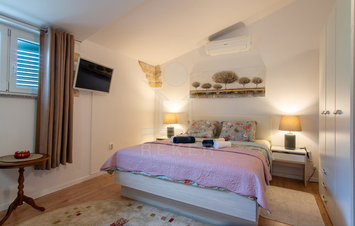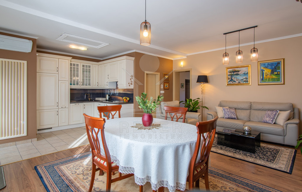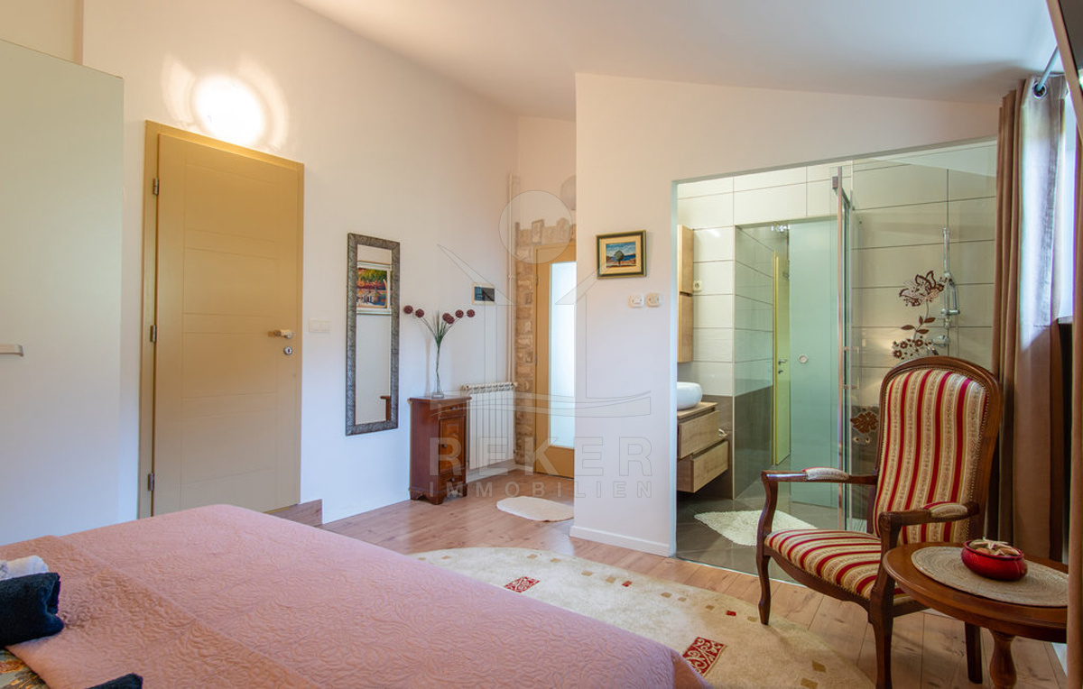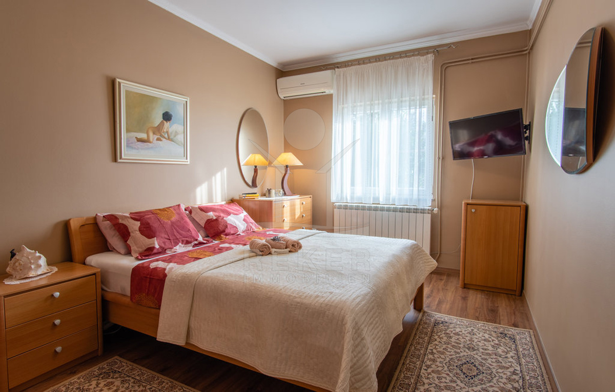 Innen geht’s charmant weiter: alles auf einer Ebene, alles hell, wohnlich, gepflegt. Auf 148 m² verteilen sich zwei getrennt nutzbare Wohneinheiten. In Summe stehen drei Schlafzimmer, zwei Badezimmer und ein großer Wohnbereich mit offener Küche zur Verfügung. Vier Klimaanlagen sorgen für angenehme Temperaturen im Sommer, im Winter hilft die Holzheizung mit gemütlicher Kaminwärme. Die Einrichtung ist komplett – Sie können sofort einziehen oder vermieten.