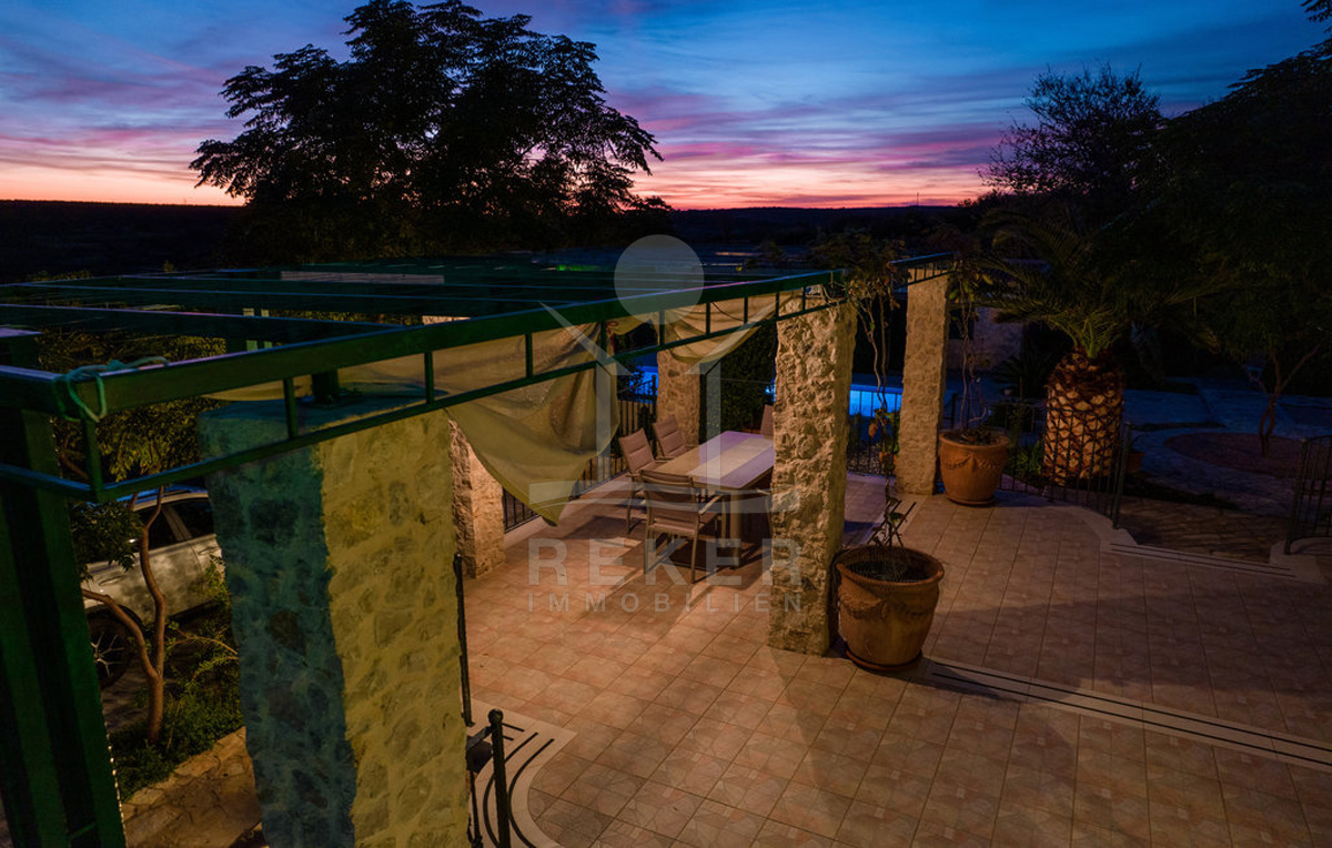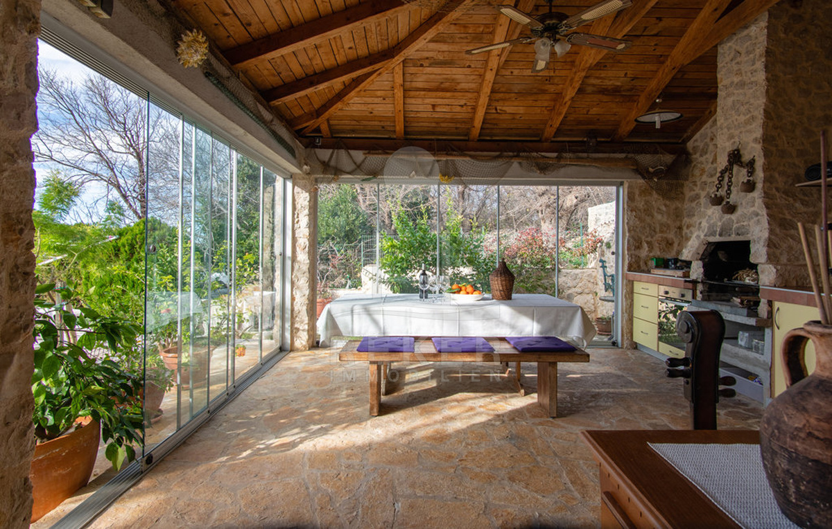 Der Außenbereich ist ein kleines Paradies. Mediterrane Pflanzen, Palmen, Naturstein und Grünflächen umgeben das Haus auf 2.898 m². Der Pool ist komplett eingefasst von einer großzügigen Sonnenterrasse, mit Liegen und Schirmen – perfekt für lange Sommertage. Gleich daneben: die verglaste Sommerküche. Offenes Mauerwerk, rustikale Holzbalken, ein großer Esstisch und der gemauerte Kamin. Hier können Sie auch an kühlen Tagen mit Freunden grillen und feiern.