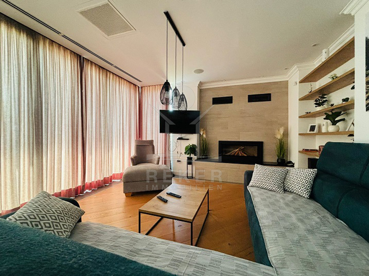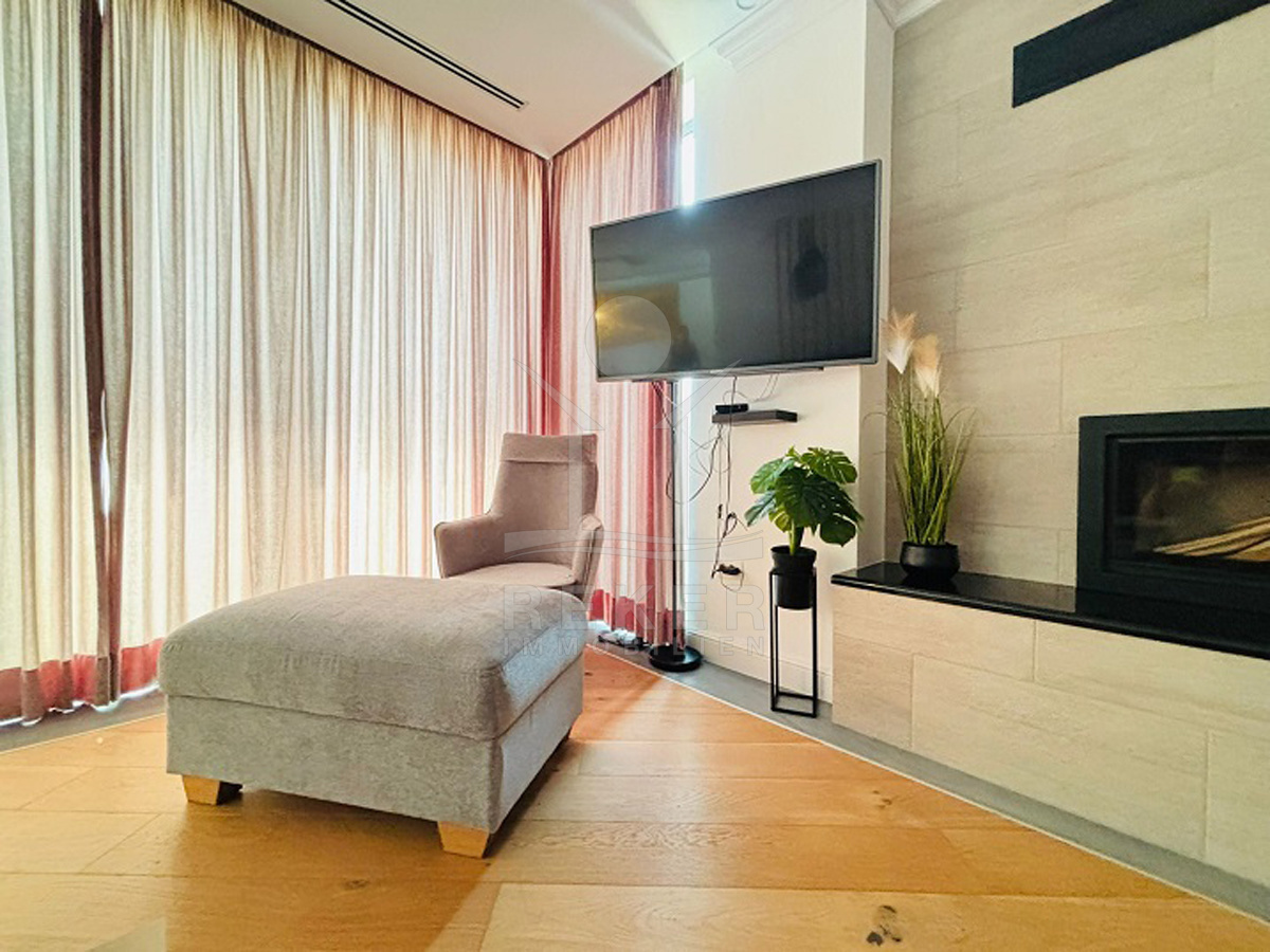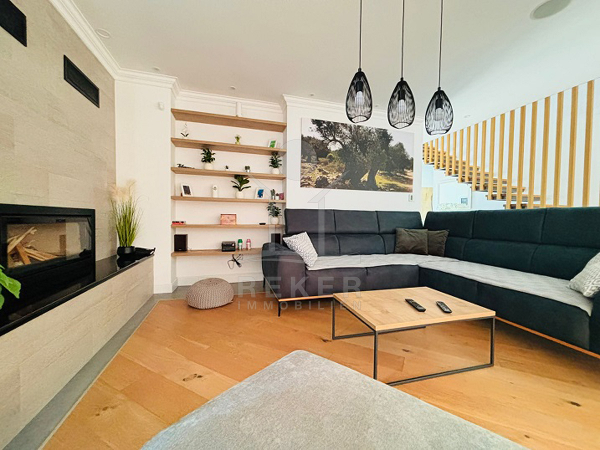 Im Erdgeschoss öffnet sich der helle Wohnbereich mit Kamin zur Terrasse. Die Küche ist gleich daneben, praktisch und offen gestaltet. Dazu ein Schlafzimmer mit eigenem Bad – ideal als Gästezimmer oder barrierefreier Rückzugsort. Ebenfalls im Erdgeschoss: ein Gäste-WC, eine Waschküche und mehrere Abstellräume.