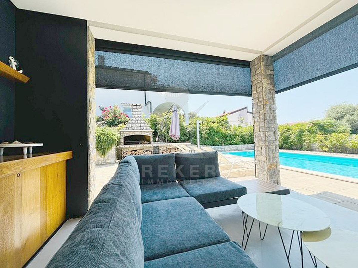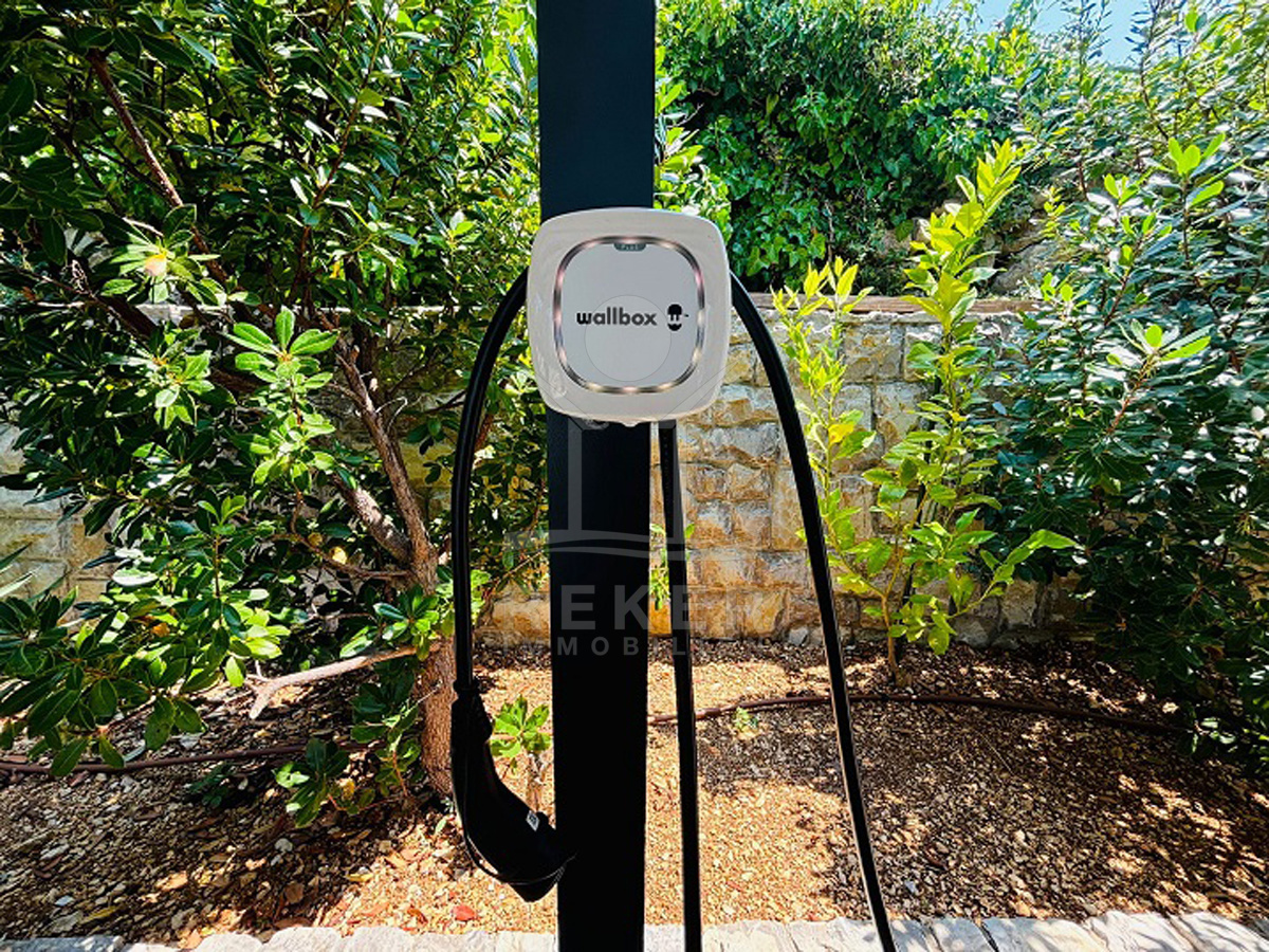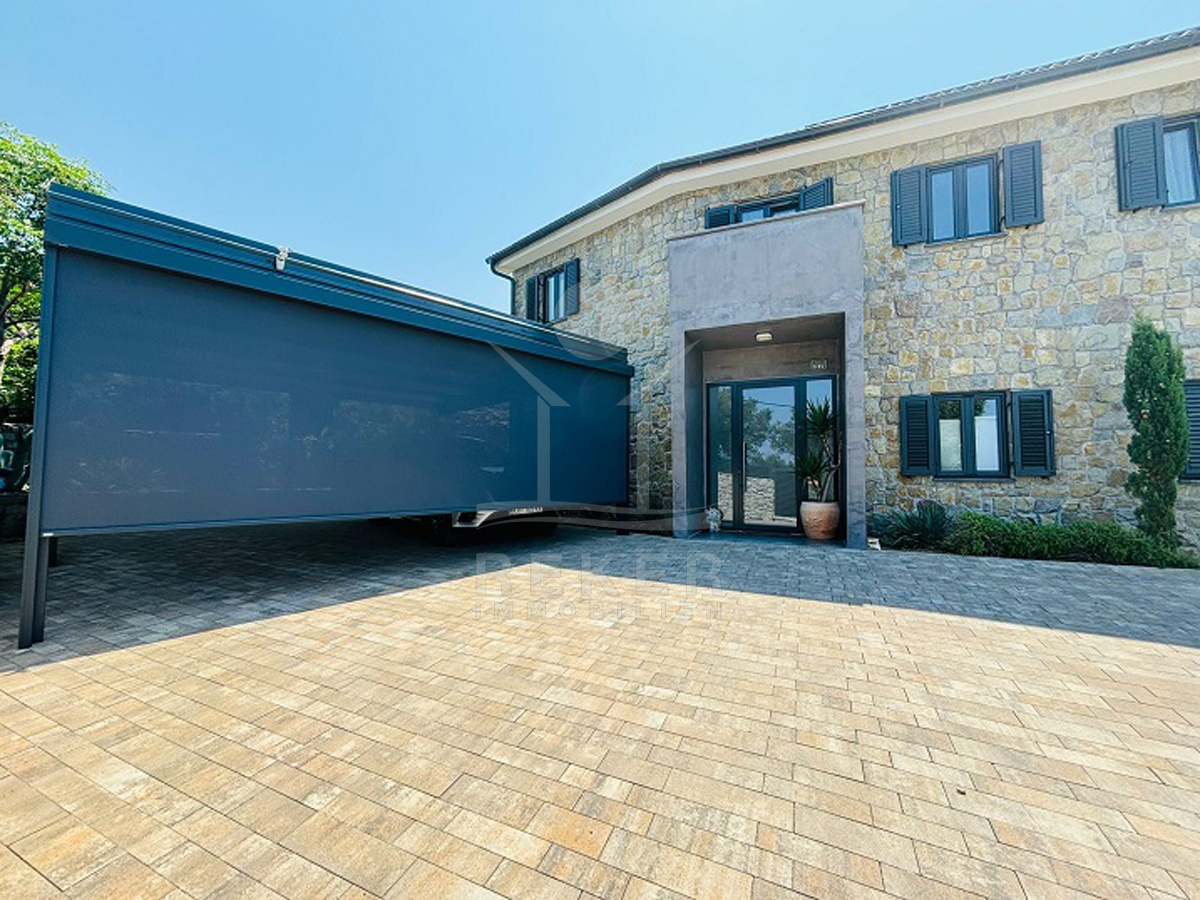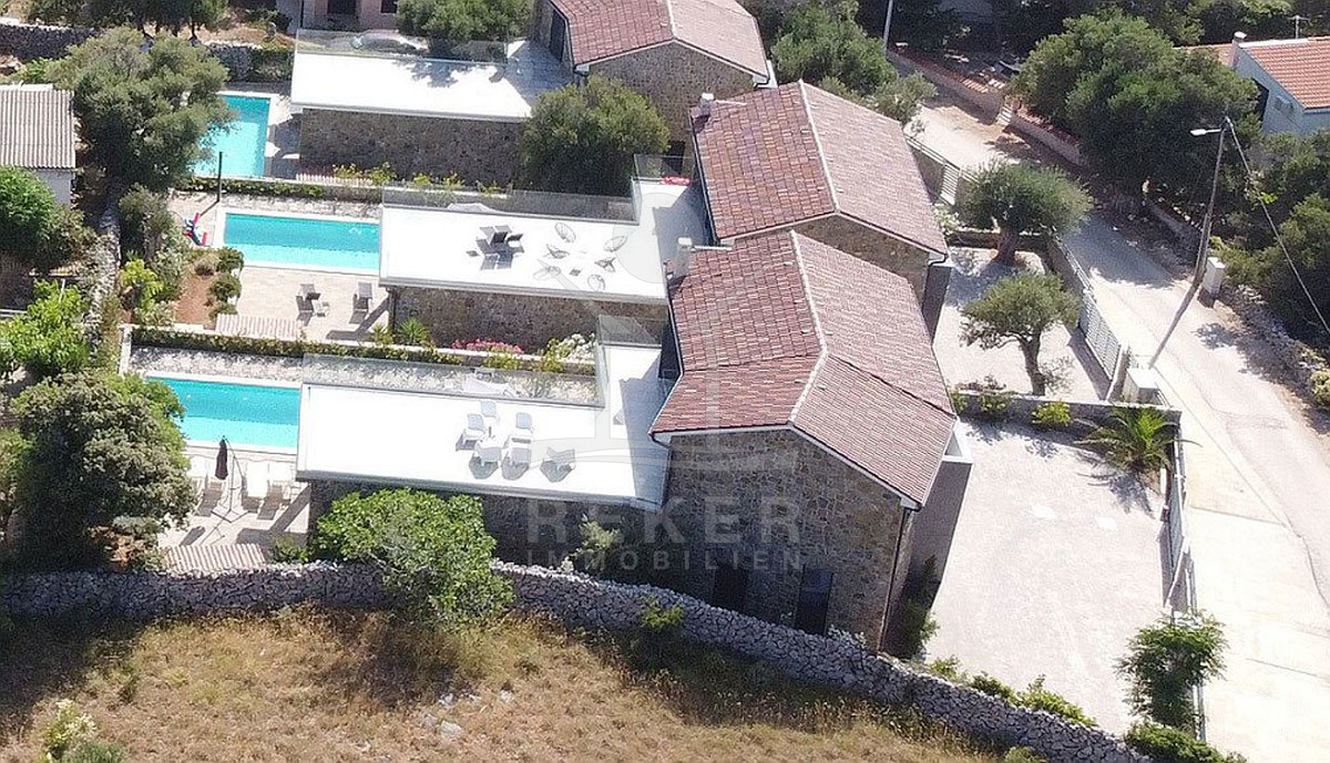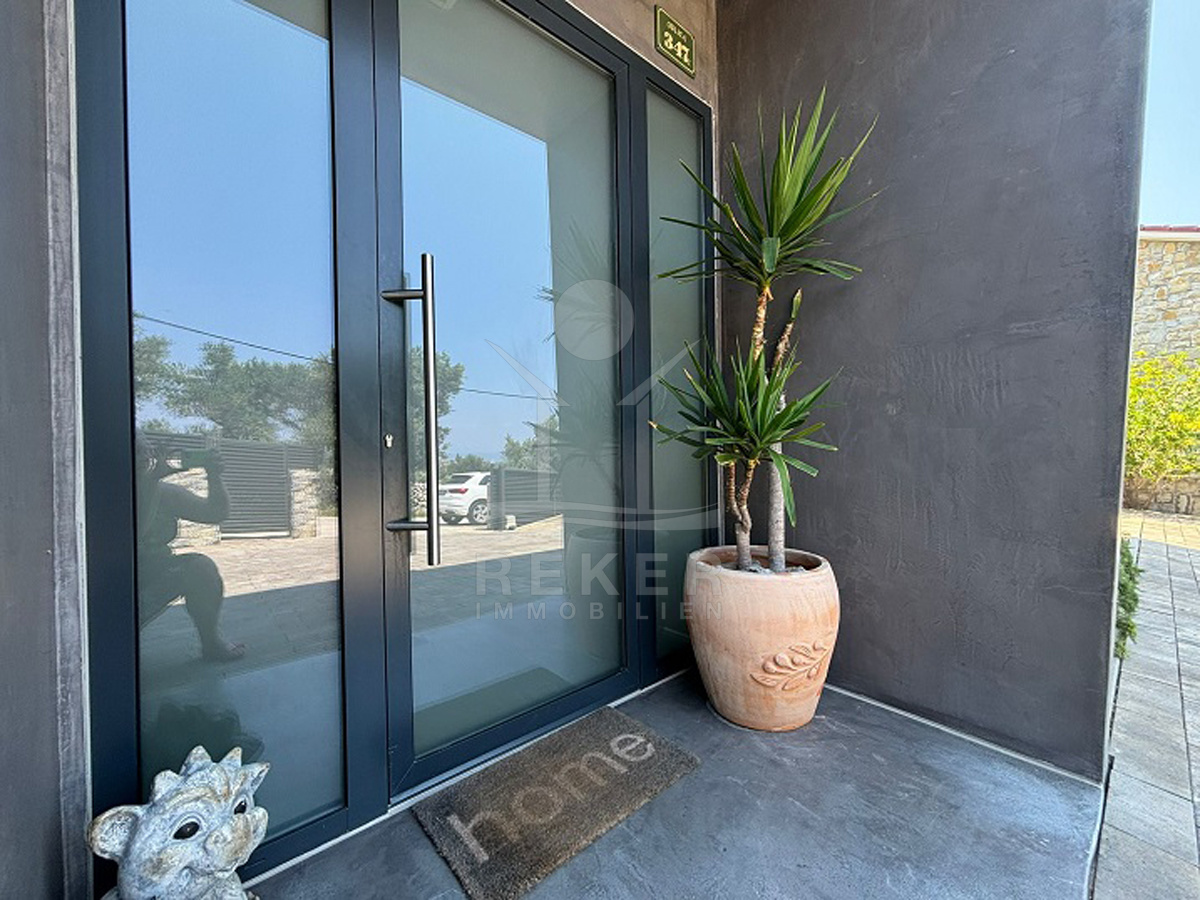 In einem kleinen Dorf bei Lun auf der Insel Pag – eingebettet zwischen alten Olivenhainen – wartet diese moderne Villa auf Sie. Der nächste Strand ist nur zehn Gehminuten entfernt, das Meer gerade mal 400 Meter. Drumherum: Natur, Ruhe, viel Grün. Die Straße endet, das Meer beginnt. Zurückgezogen, aber nicht einsam. Ein Ort, um durchzuatmen. Auf dem eigenen Grundstück parken Sie mehrere Fahrzeuge bequem in der überdachten Garage. Eine Ladestation für E-Autos ist schon installiert.