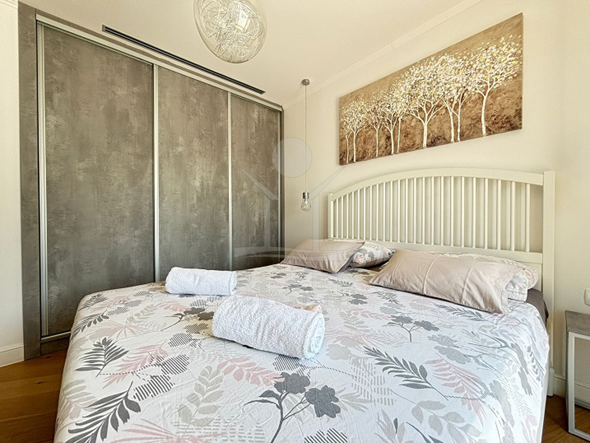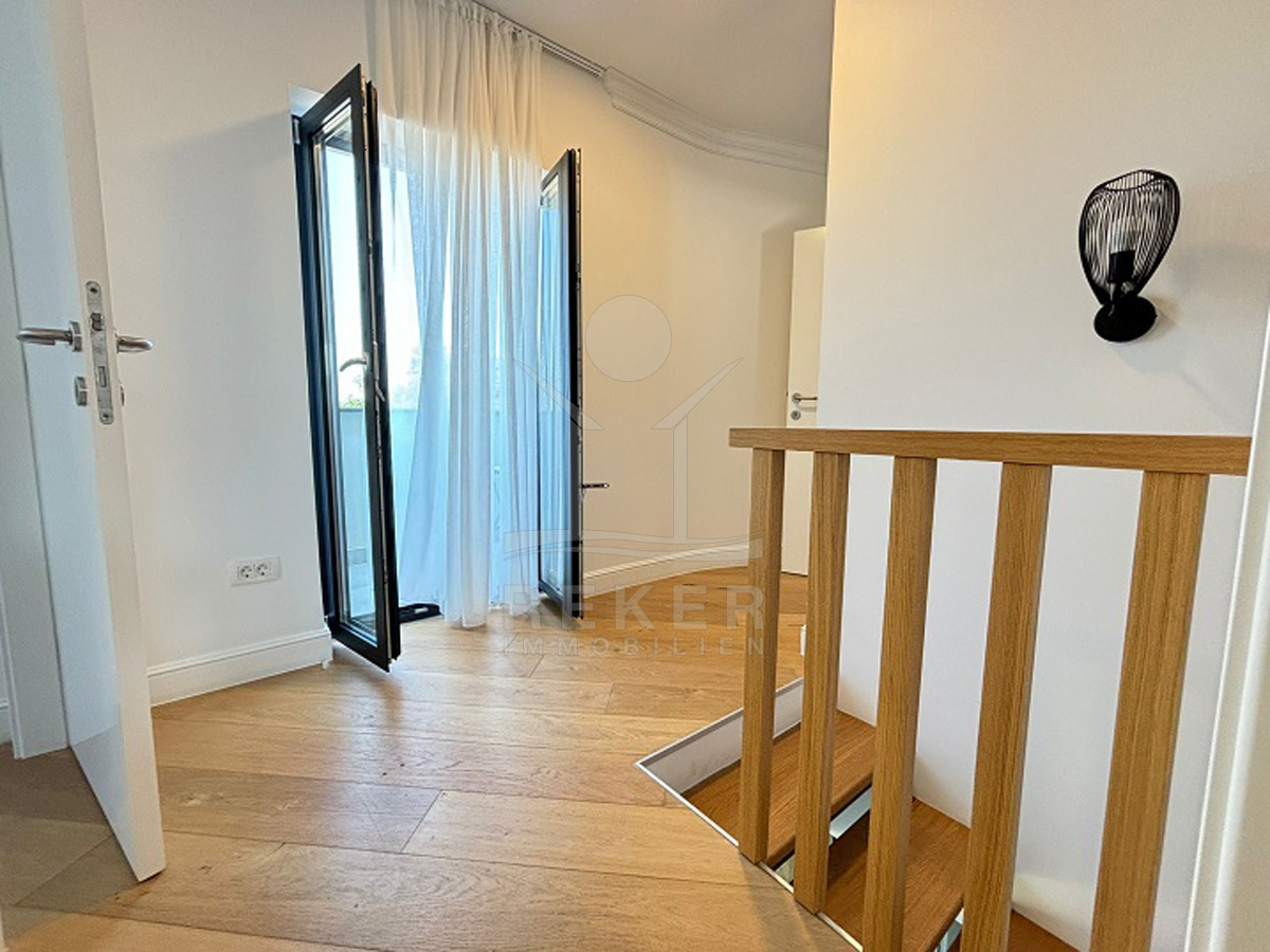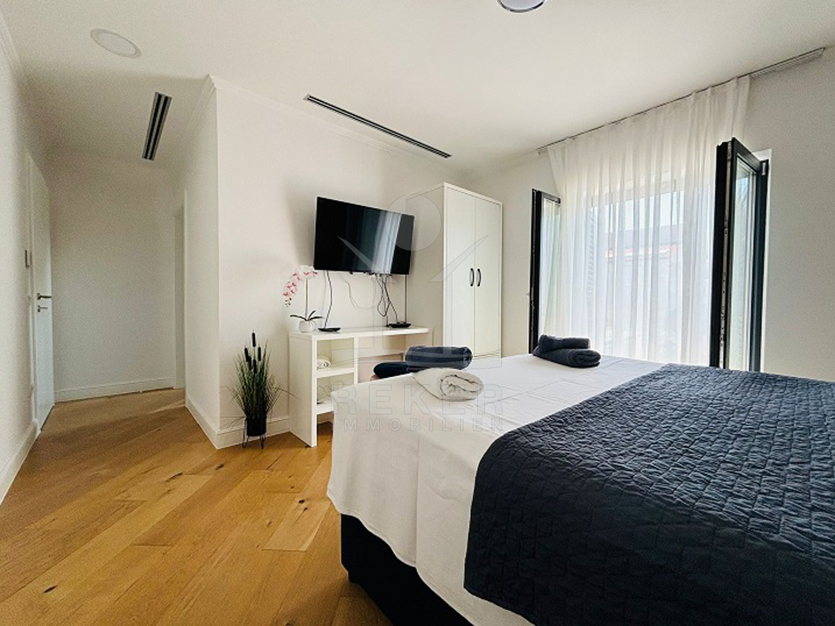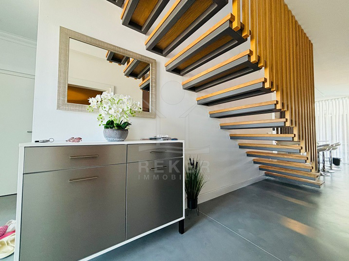 Im Obergeschoss befinden sich zwei weitere Schlafzimmer mit jeweils eigenem Bad, ein zusätzliches Zimmer, das sich flexibel nutzen lässt – etwa als Büro, Kinderzimmer oder Hobbyraum. Auch hier gibt es ein separates WC. Von den beiden Terrassen im Obergeschoss geht der Blick Richtung Meer. Und auf der großzügigen Dachterrasse entspannen Sie mit Panorama – Sonnenliegen inklusive. Klimaanlage in allen Räumen sorgt das ganze Jahr für Komfort. Die Solaranlage auf dem Dach macht Sie ein gutes Stück unabhängig.
