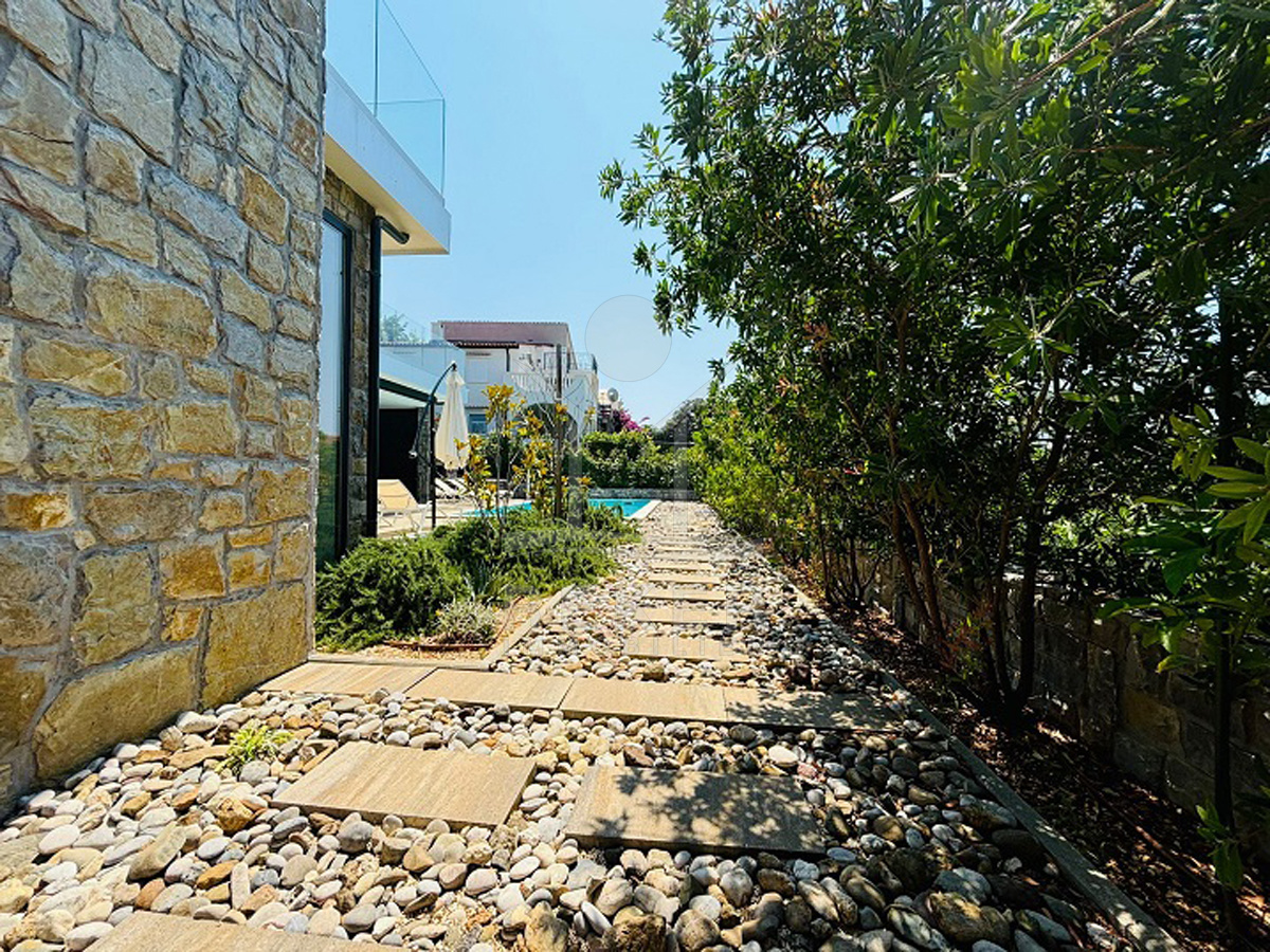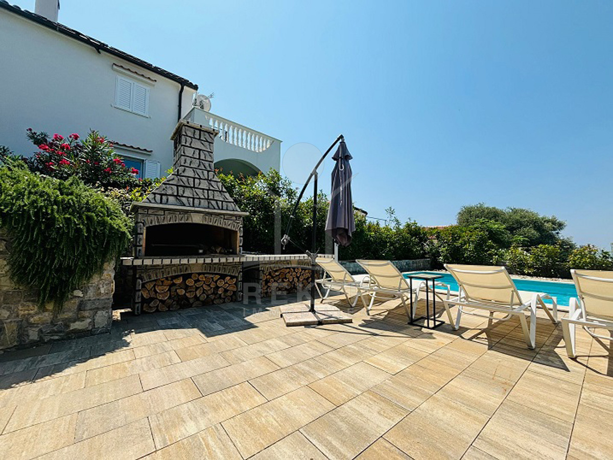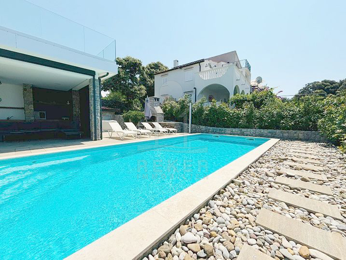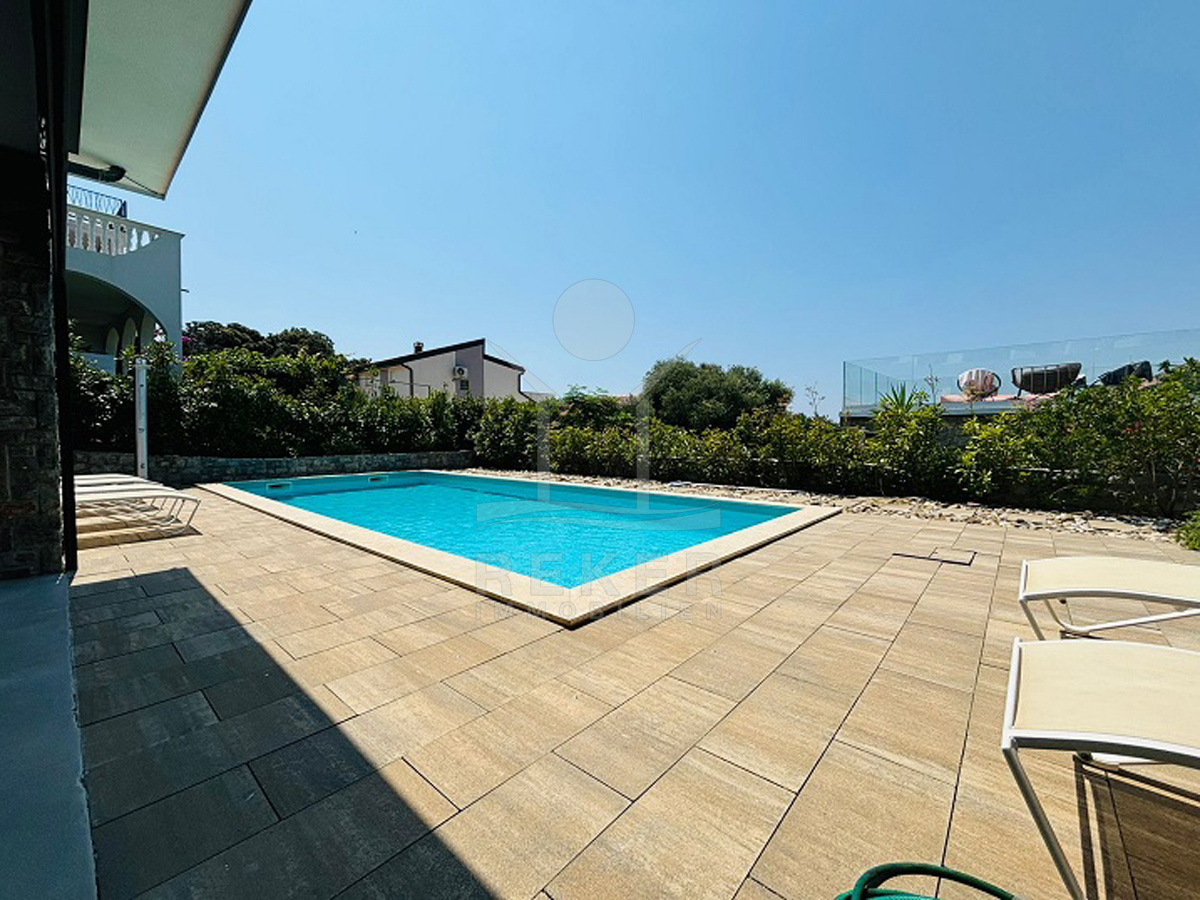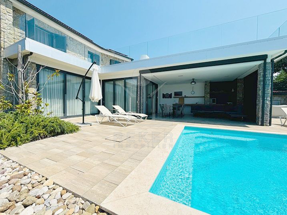 Der Außenbereich dieser Villa ist wie gemacht für Sommertage: ein 44 m² großer Pool, Sonnenliegen, viel Platz zum Entspannen. Gleich daneben die überdachte Terrasse mit Lounge, Esstisch und Sommerküche. Wer mag, heizt den Steingrill an. Für die Abkühlung zwischendurch sorgt eine elektrische Außendusche. Alles eingebettet in einen gepflegten Garten mit mediterranen Pflanzen, flankiert von dichten Hecken. Die Ausrichtung nach Süden bringt Sonne von morgens bis abends. Ein echtes Highlight: absolute Privatsphäre – ohne direkte Einblicke.