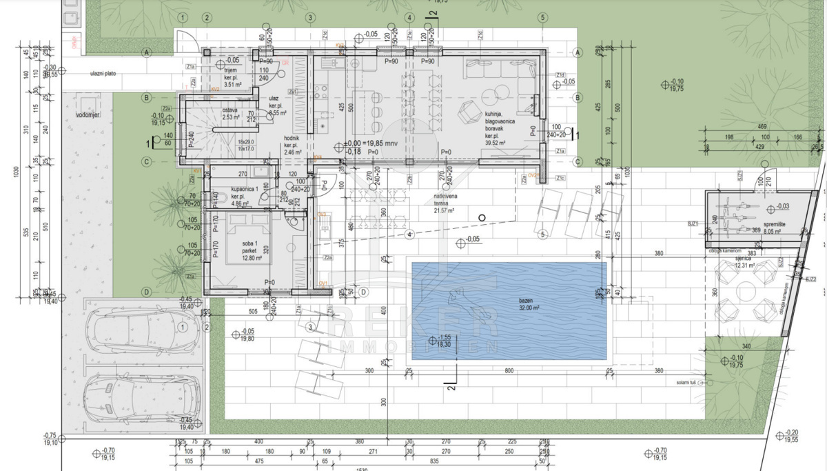 Die Außenanlage der Villa ist ein wahrer Traum. Eine überdachte Terrasse von 21 m² bietet den perfekten Platz im Freien zum Entspannen und Genießen der umliegenden Natur. Ein großzügiger Swimmingpool mit einer Größe von 32 m² und eine angrenzende Liegewiese versprechen erfrischenden Badespaß und Sonnenbaden an sonnigen Tagen. Darüber hinaus ist ein separates Nebengebäude geplant von 8 m², das Platz für zwei zusätzliche Parkplätze bietet.