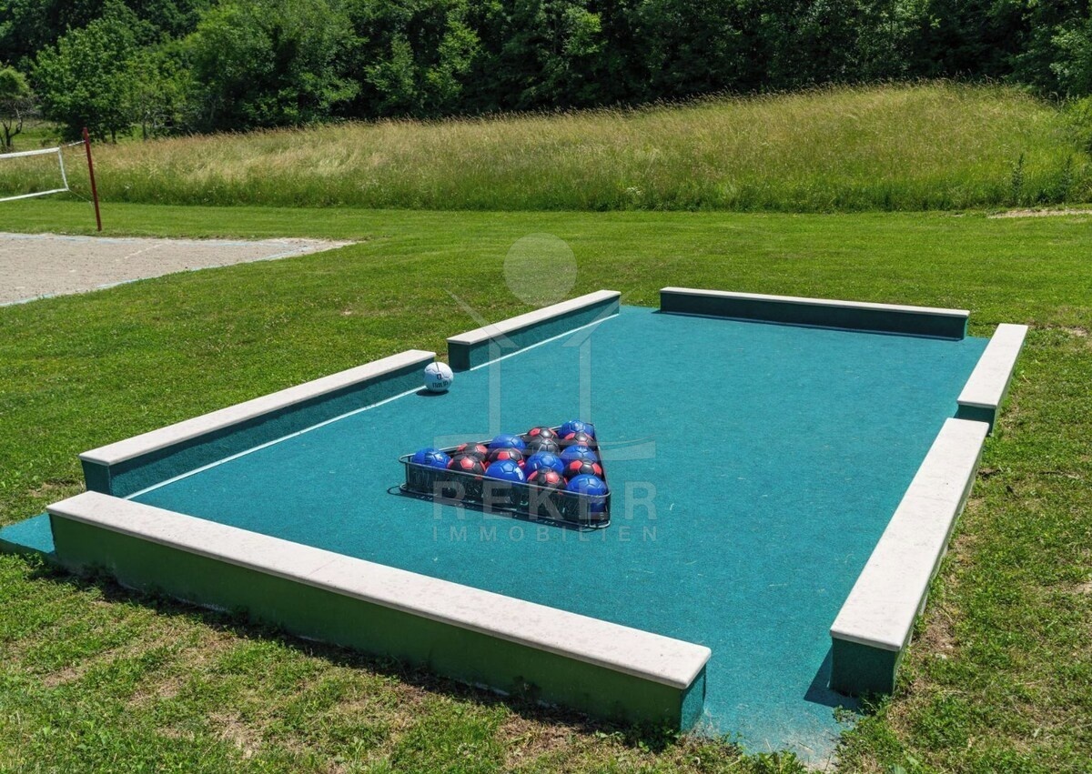 Die Außenbereiche dieser Villa sind für Sportbegeisterte sowie für Oase der Entspannung gestaltet. Von einem Tischtennistisch bis hin zu einer Beachvolleyballanlage ist alles vorhanden, um aktiv zu bleiben. Zusätzlich gibt es zwei überdachte Terrassen mit ausreichend Sitzgelegenheiten, perfekt für Geselligkeit und gesellige Abende oder für Feiern mit Barbecue Möglichkeiten. Der 35 m² große Pool lädt zum Schwimmen ein, und die Liegelandschaft um den Pool ermöglicht es Ihnen, sich in der Sonne zu entspannen und neue Energie zu tanken. Mit ausreichend Parkplätzen für sieben Fahrzeuge und mehr bietet diese Luxus-Villa alles, was Sie für ein komfortables und erfülltes Leben brauchen.